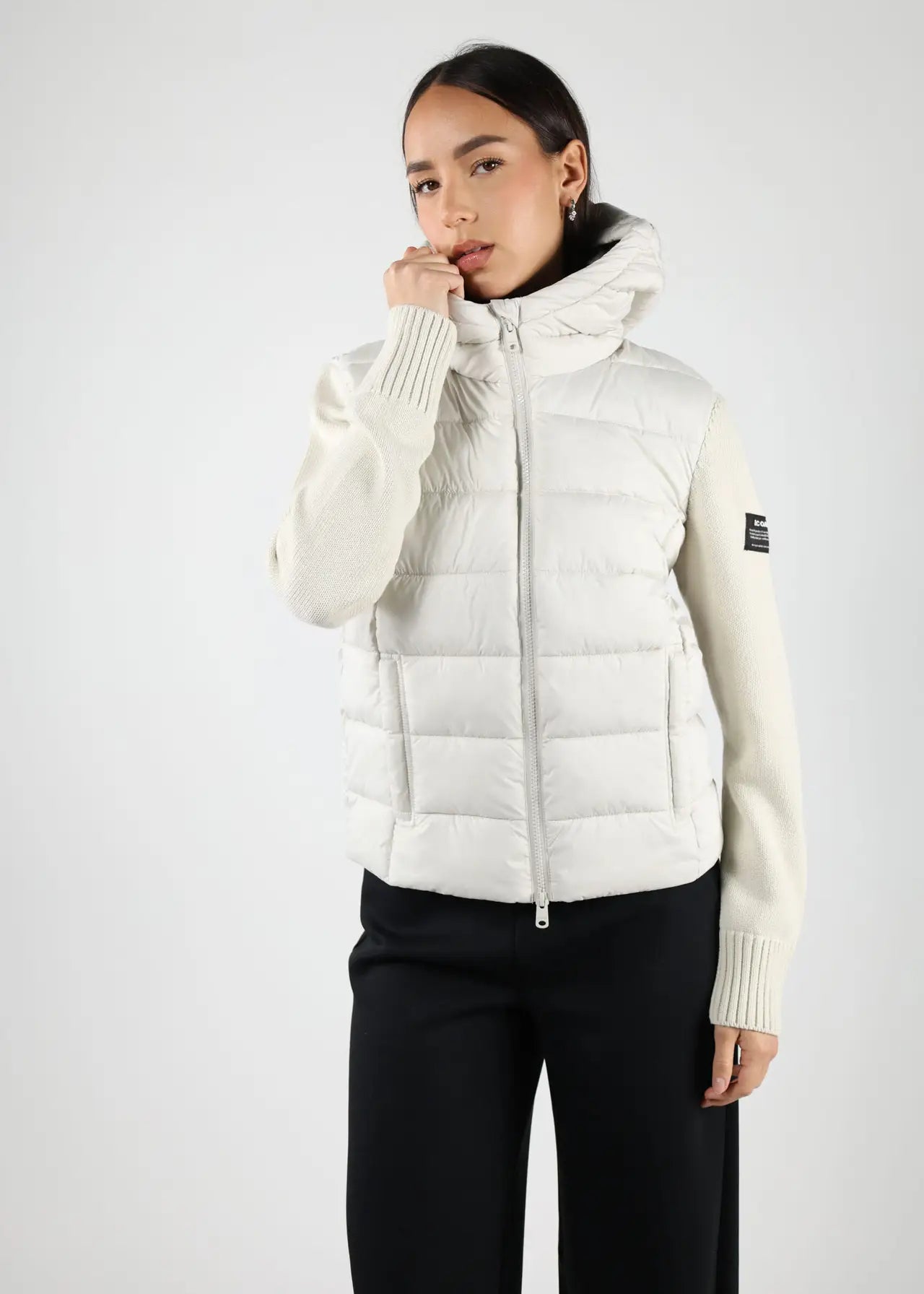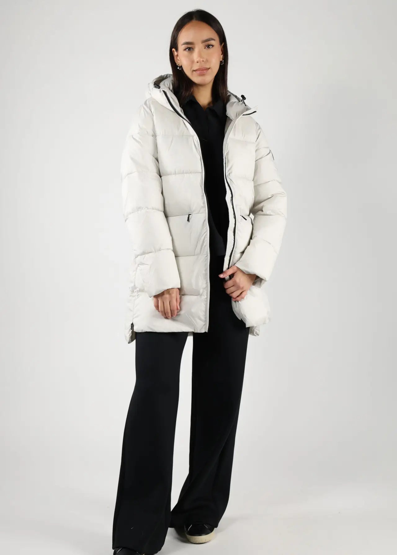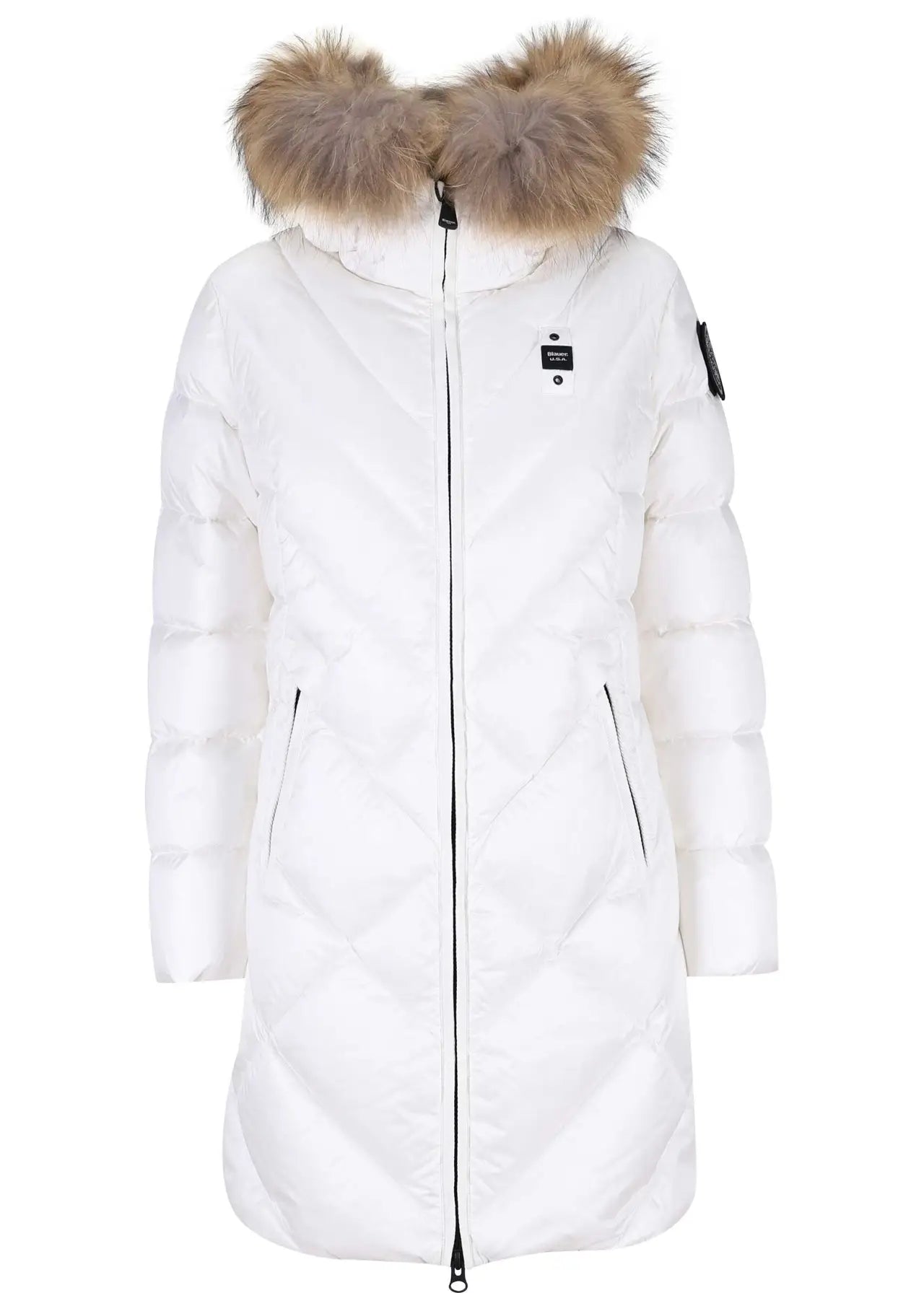 Plumífero blanco "ALTHEA" con capucha de pelos y lineas diagonales -