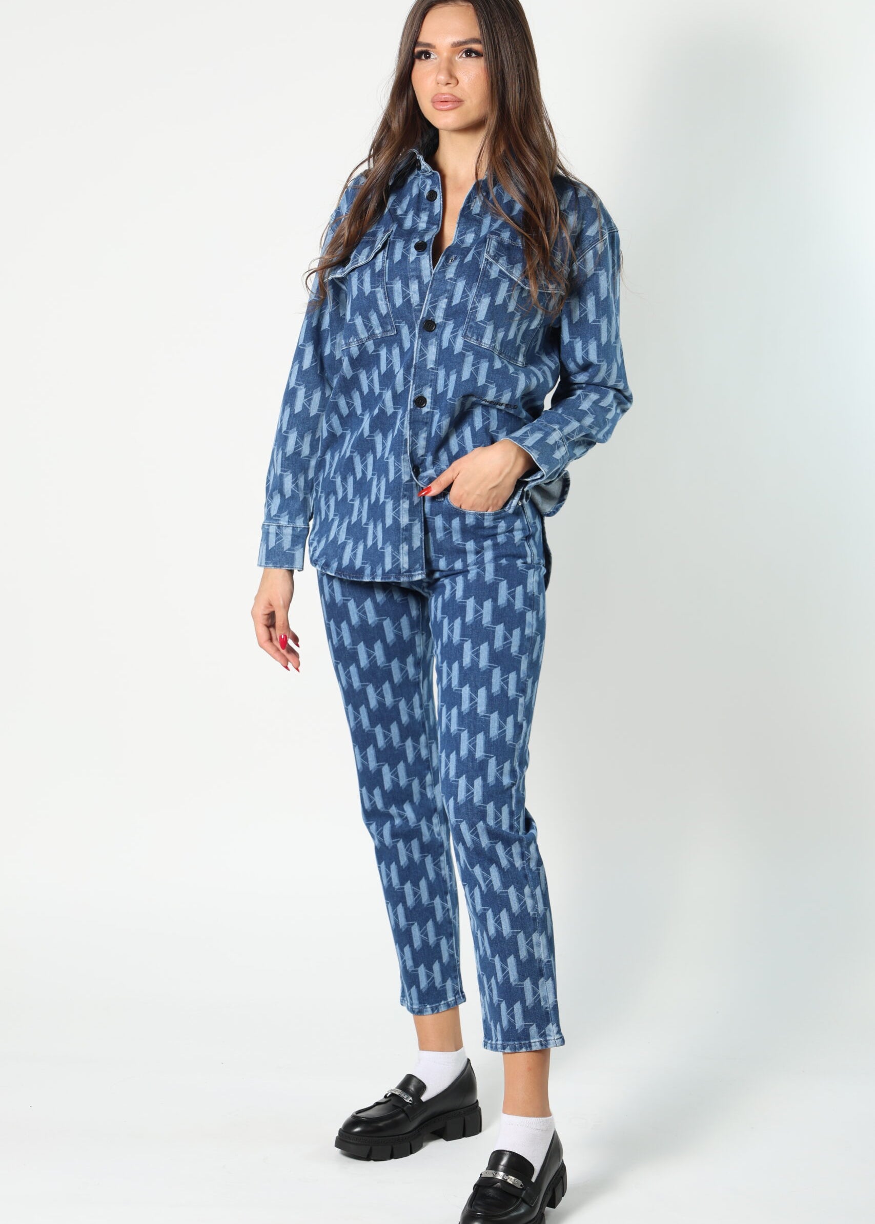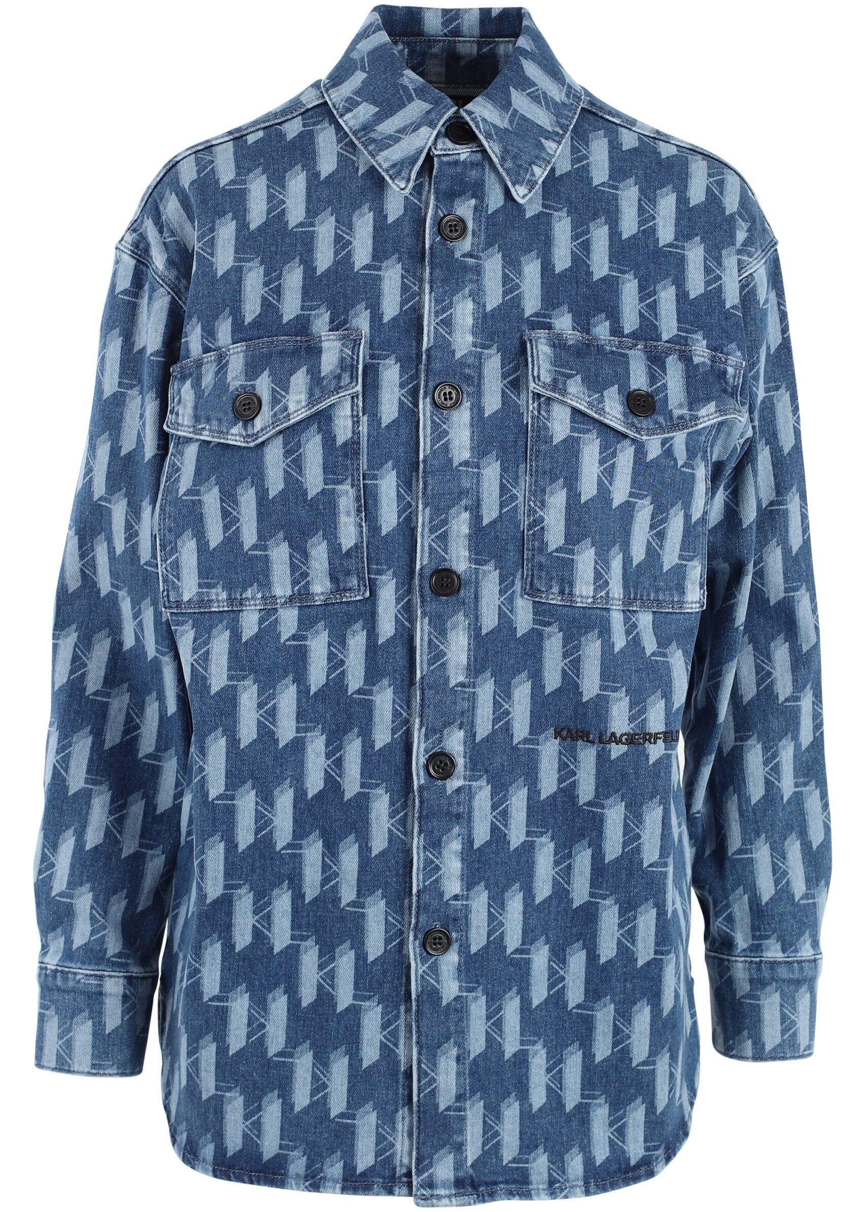 Plumífer blau de línies rectes amb caputxa i interior violeta amb logo pegat