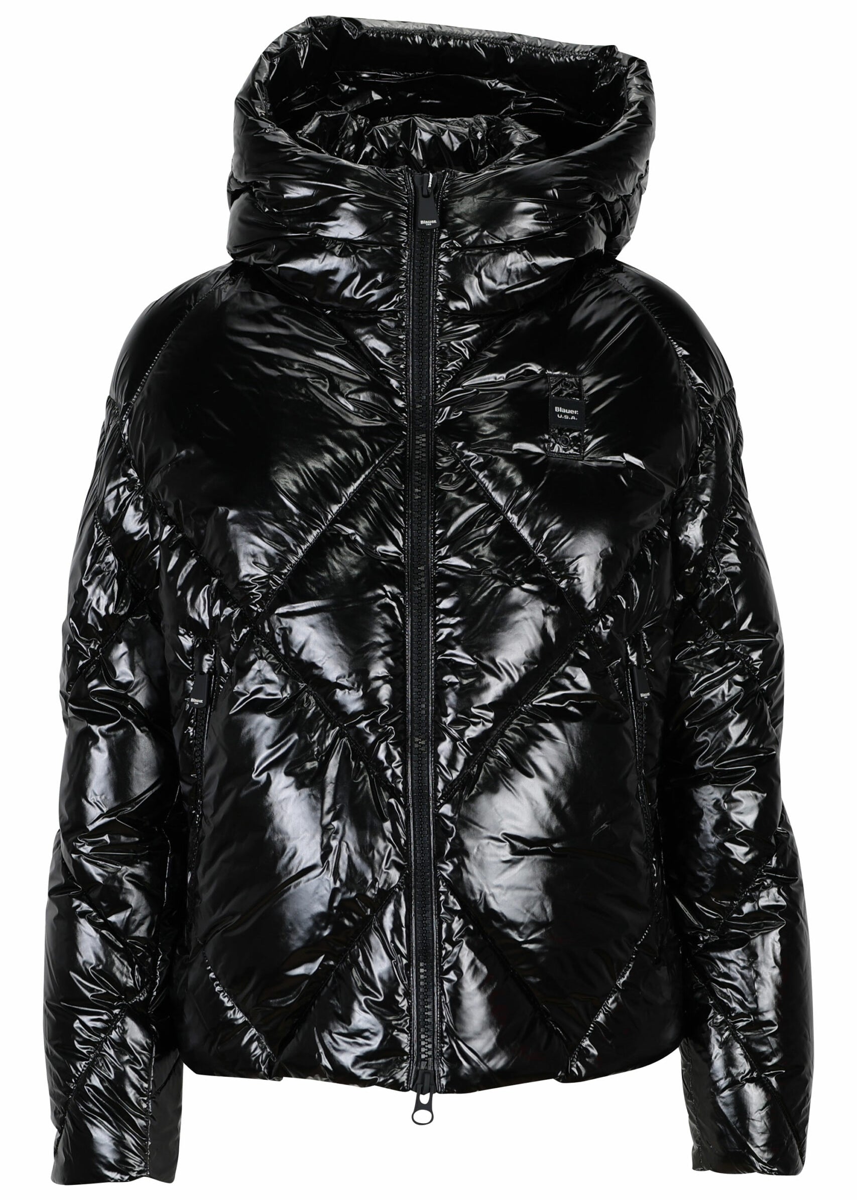 Plumífer blau fosc amb caputxa de tèxtil elàstic mat
