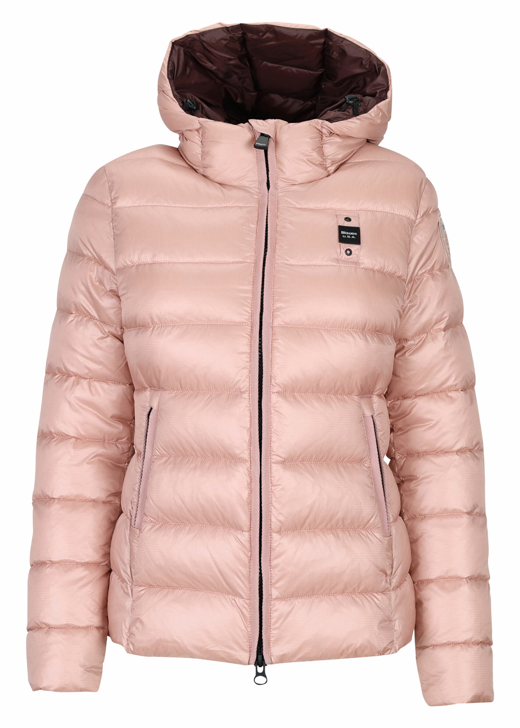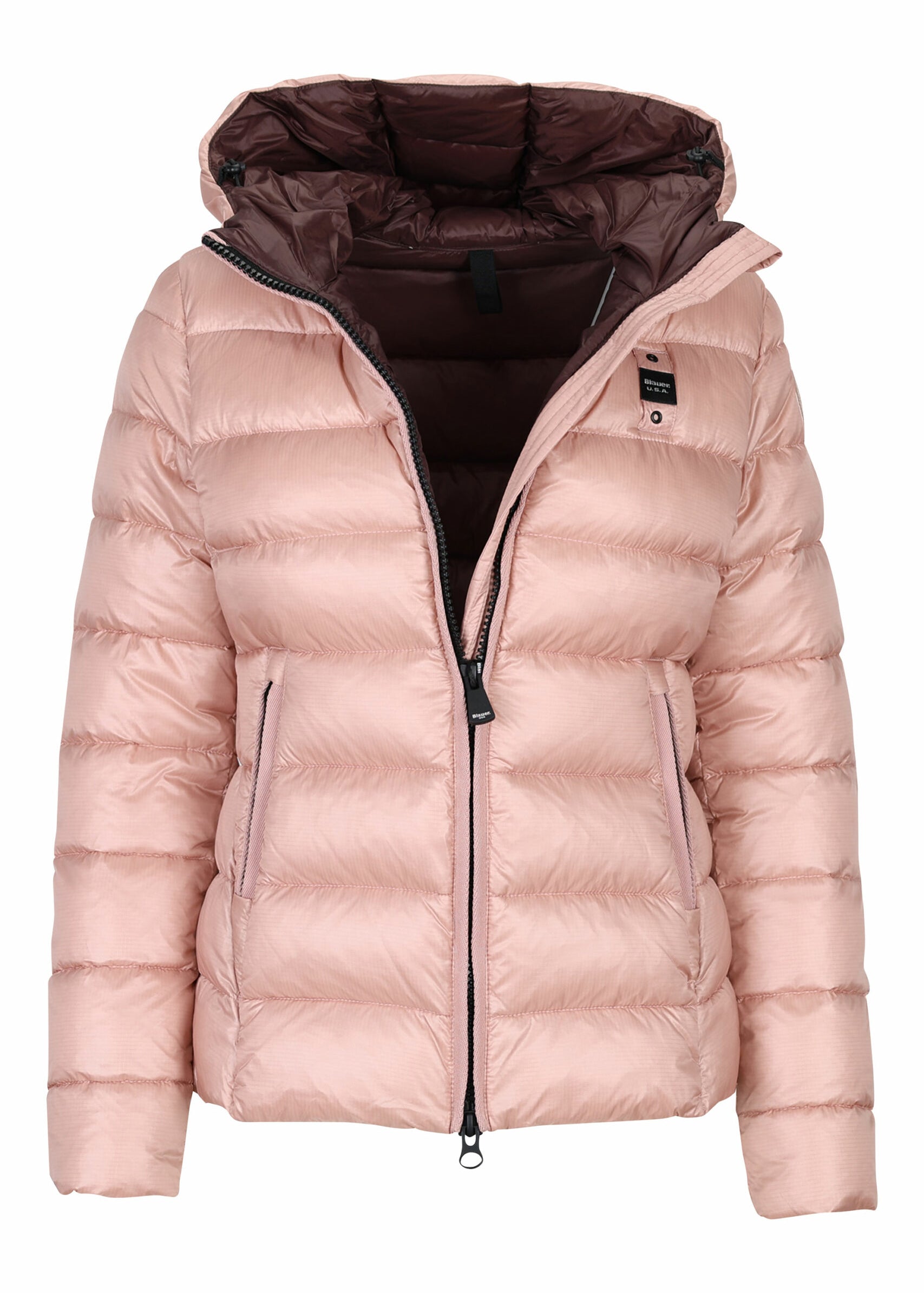 Plumífer rosa pàl·lid de línies rectes amb caputxa i interior violeta amb logo pegat