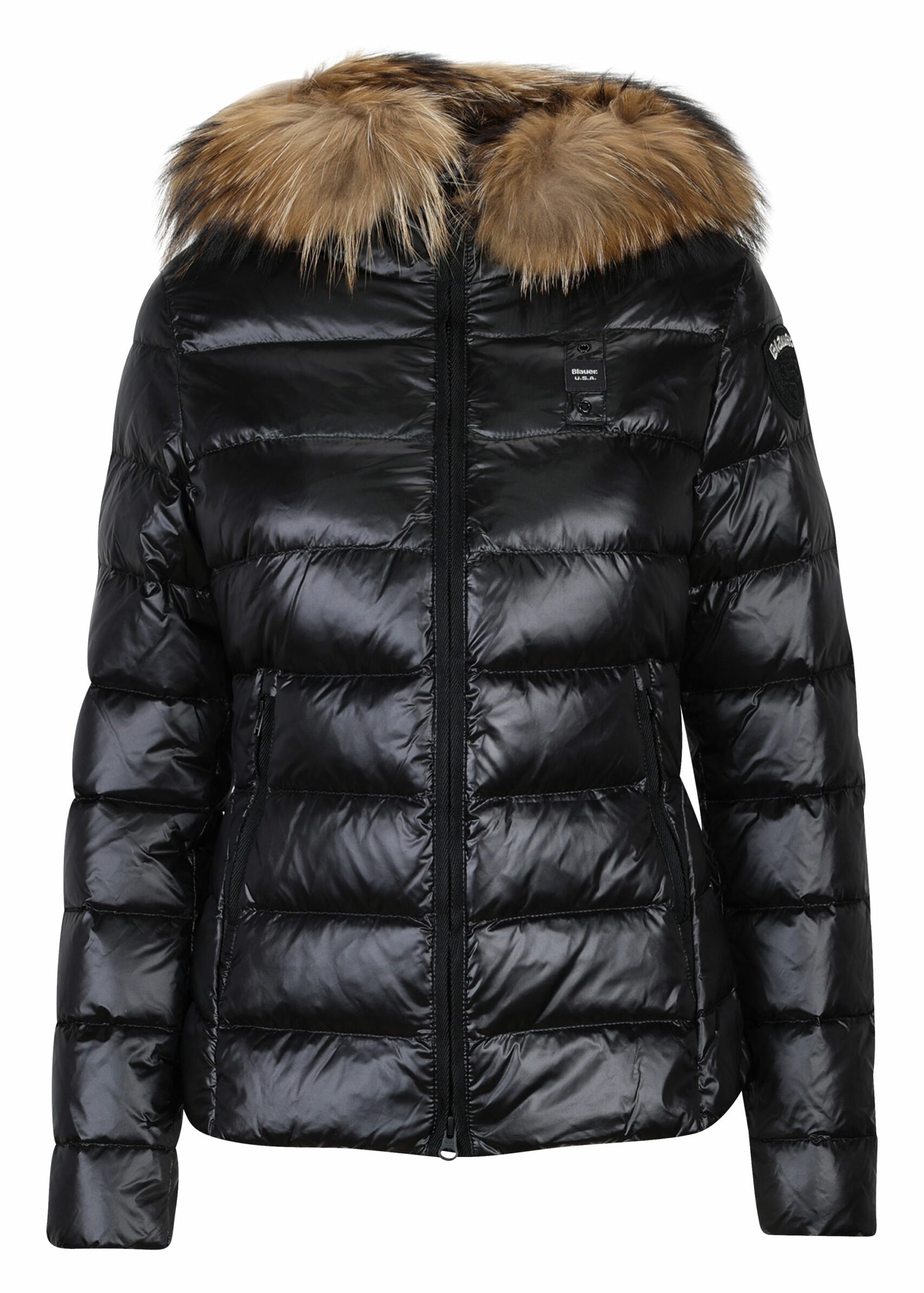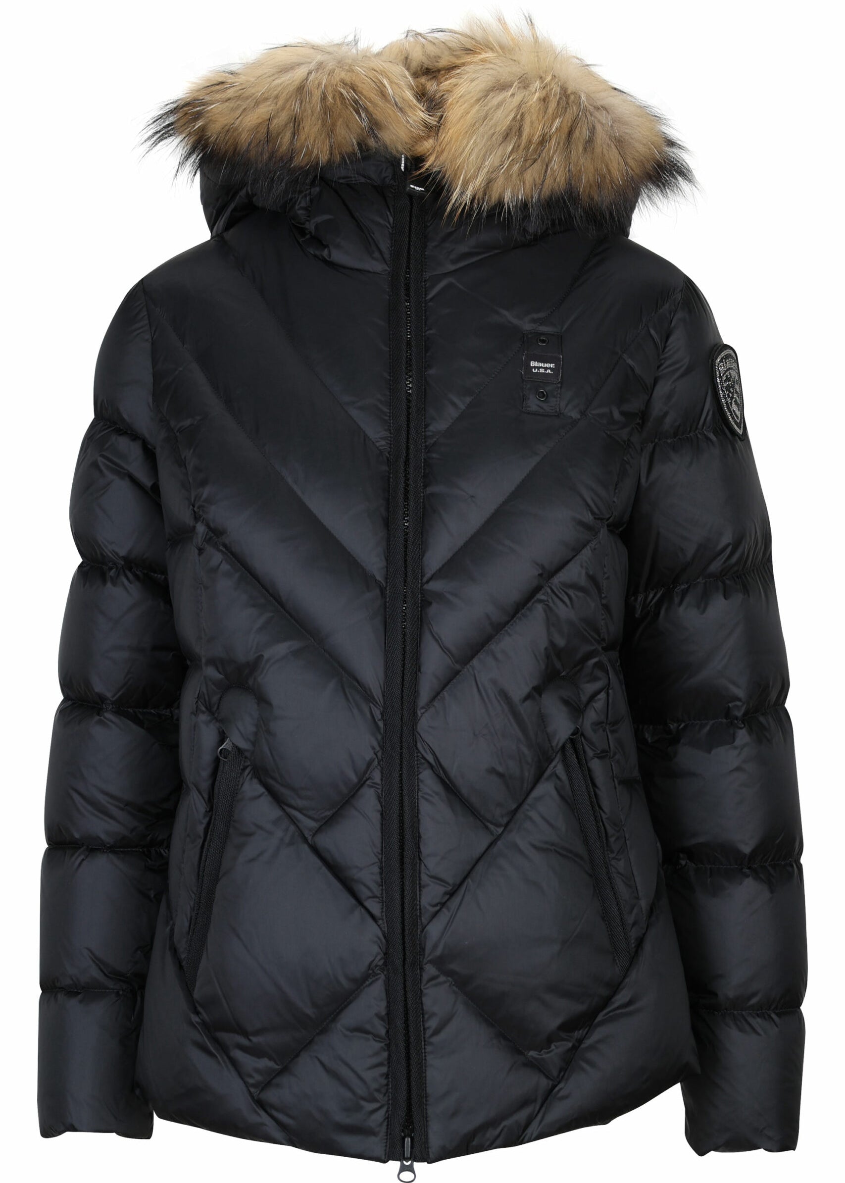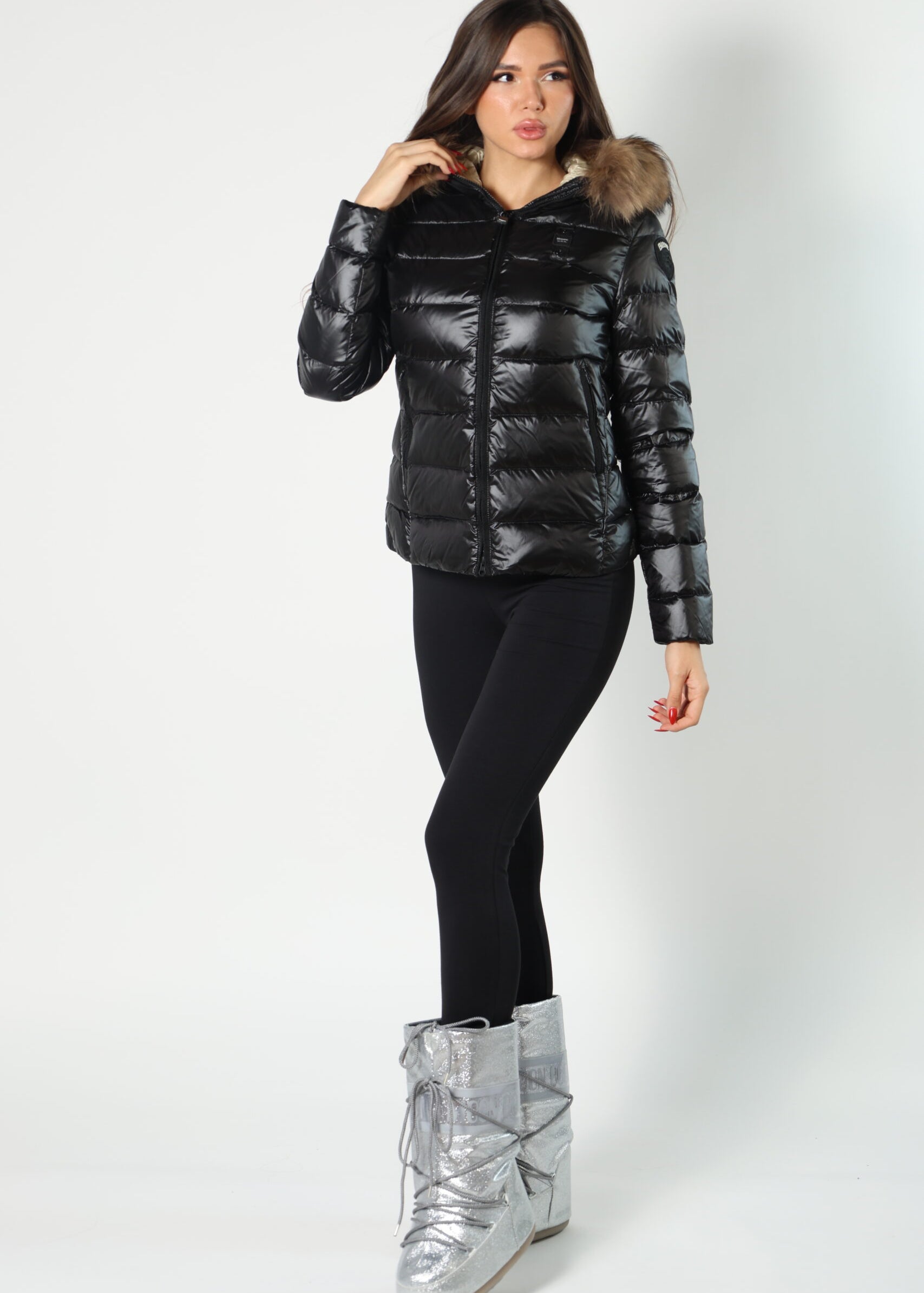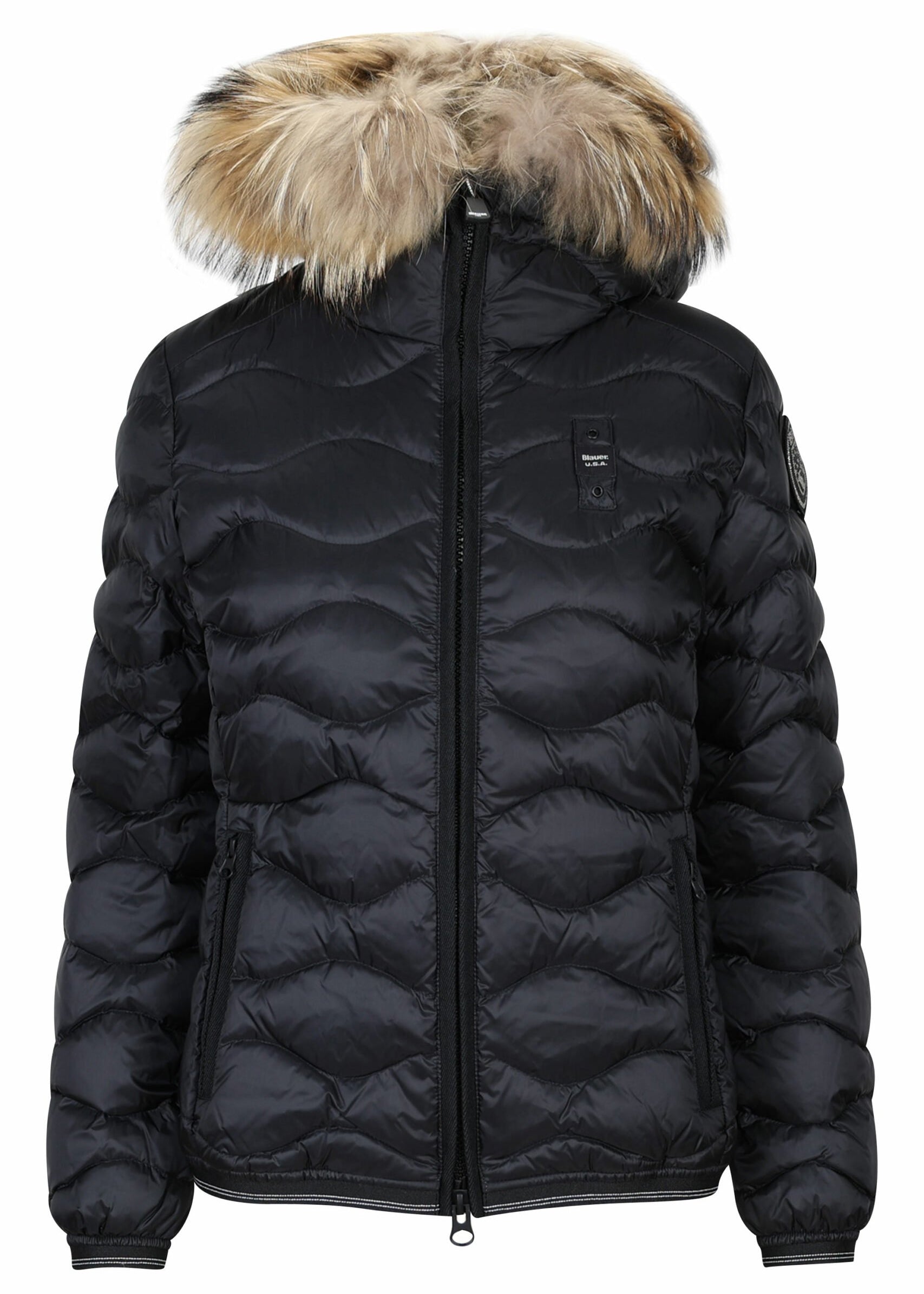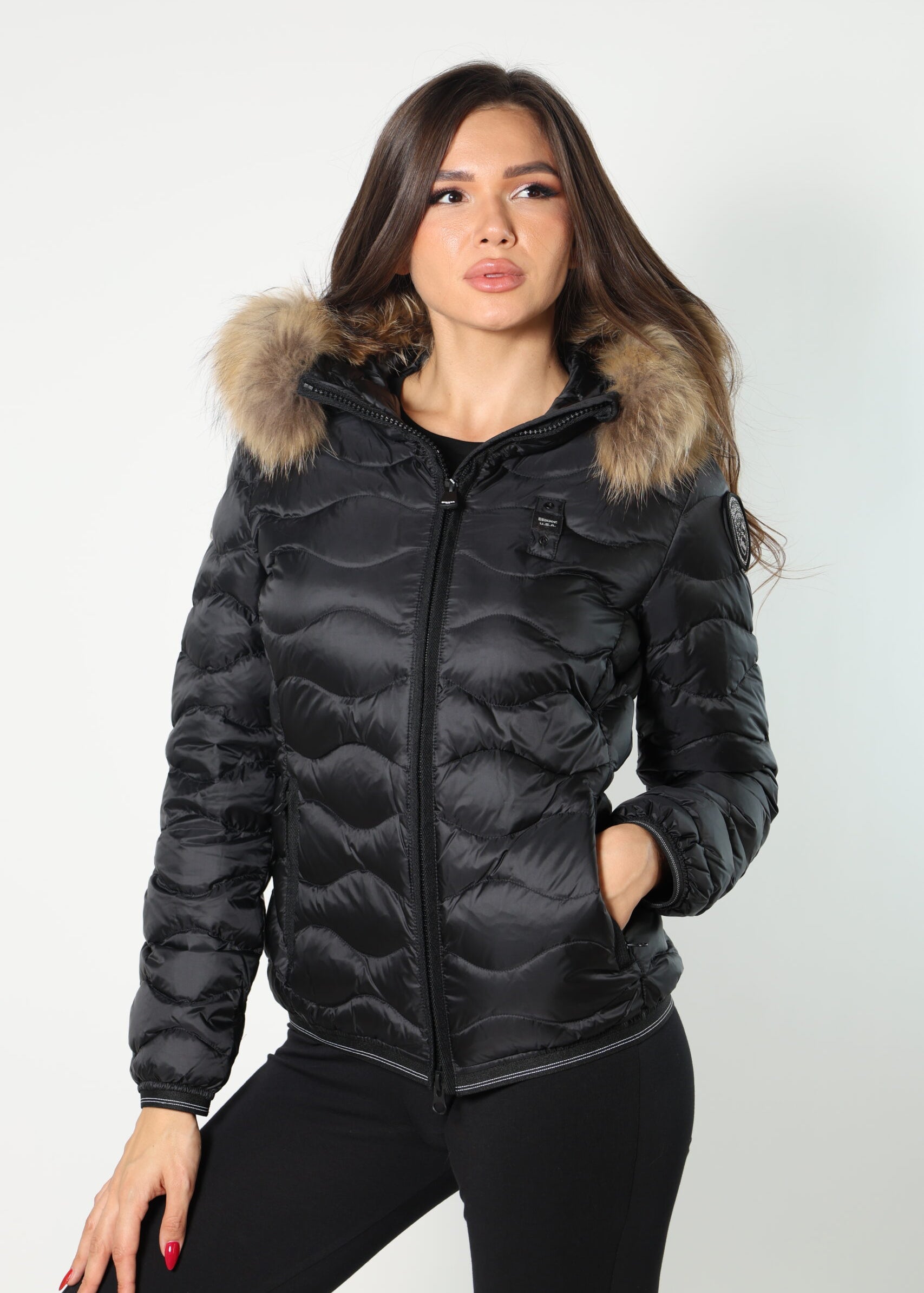Plumífer negre amb caputxa de pèls i línies ondulades amb logo pegat