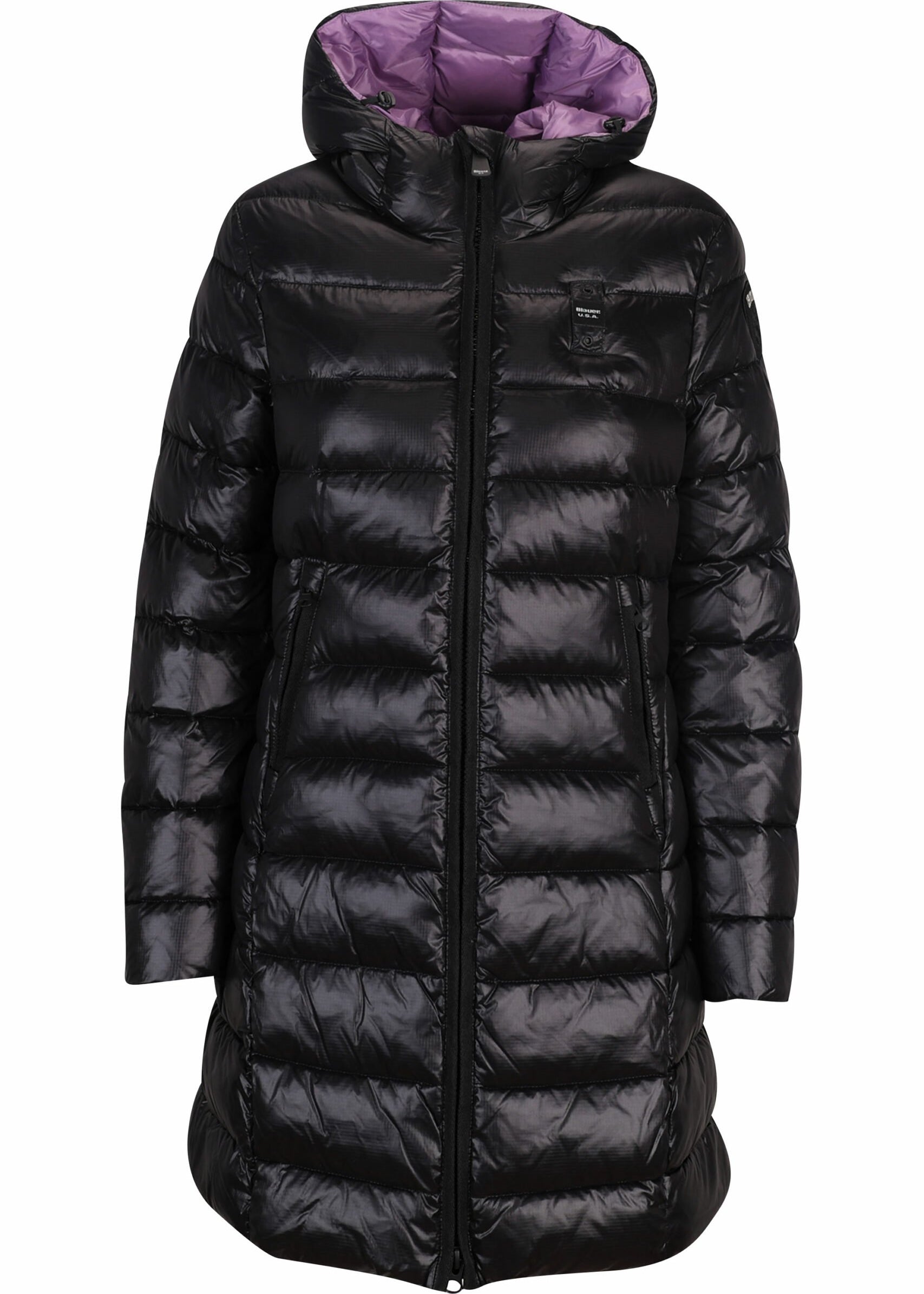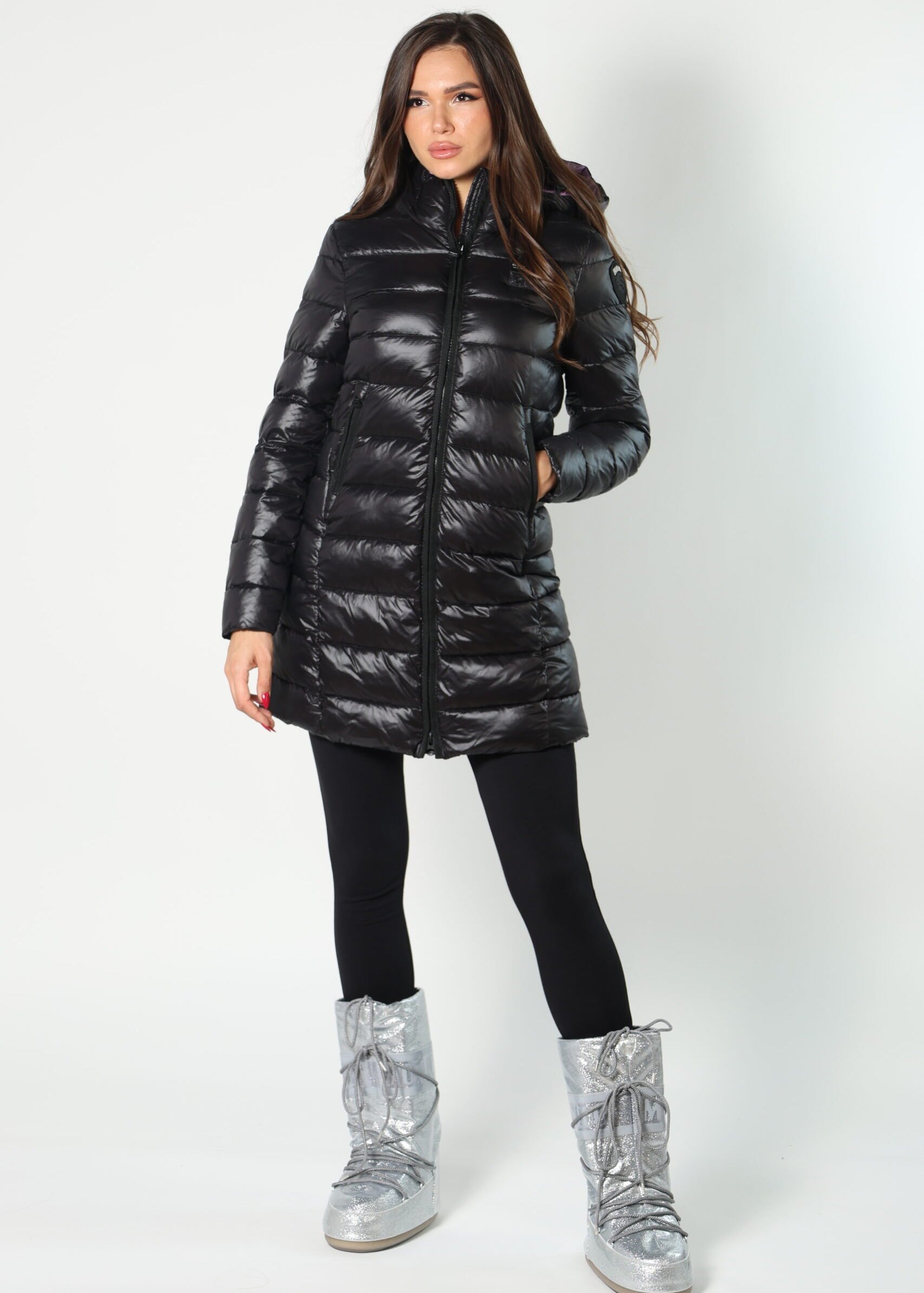 Plumífer negre llarg impermeable amb caputxa i línies rectes amb interior violeta