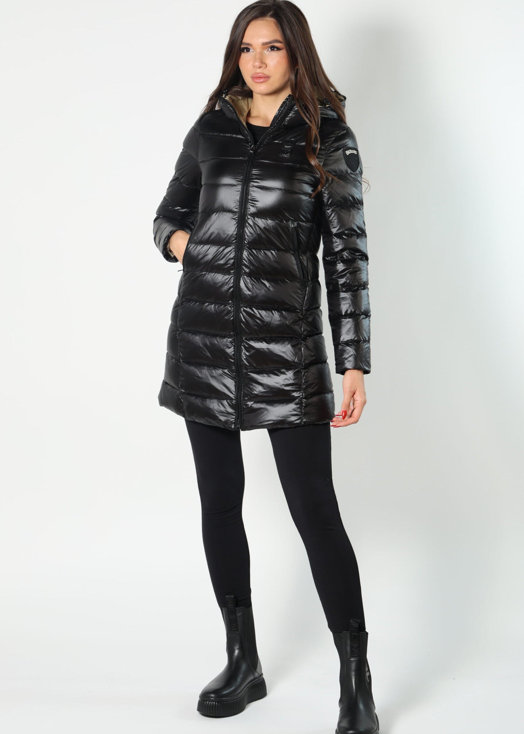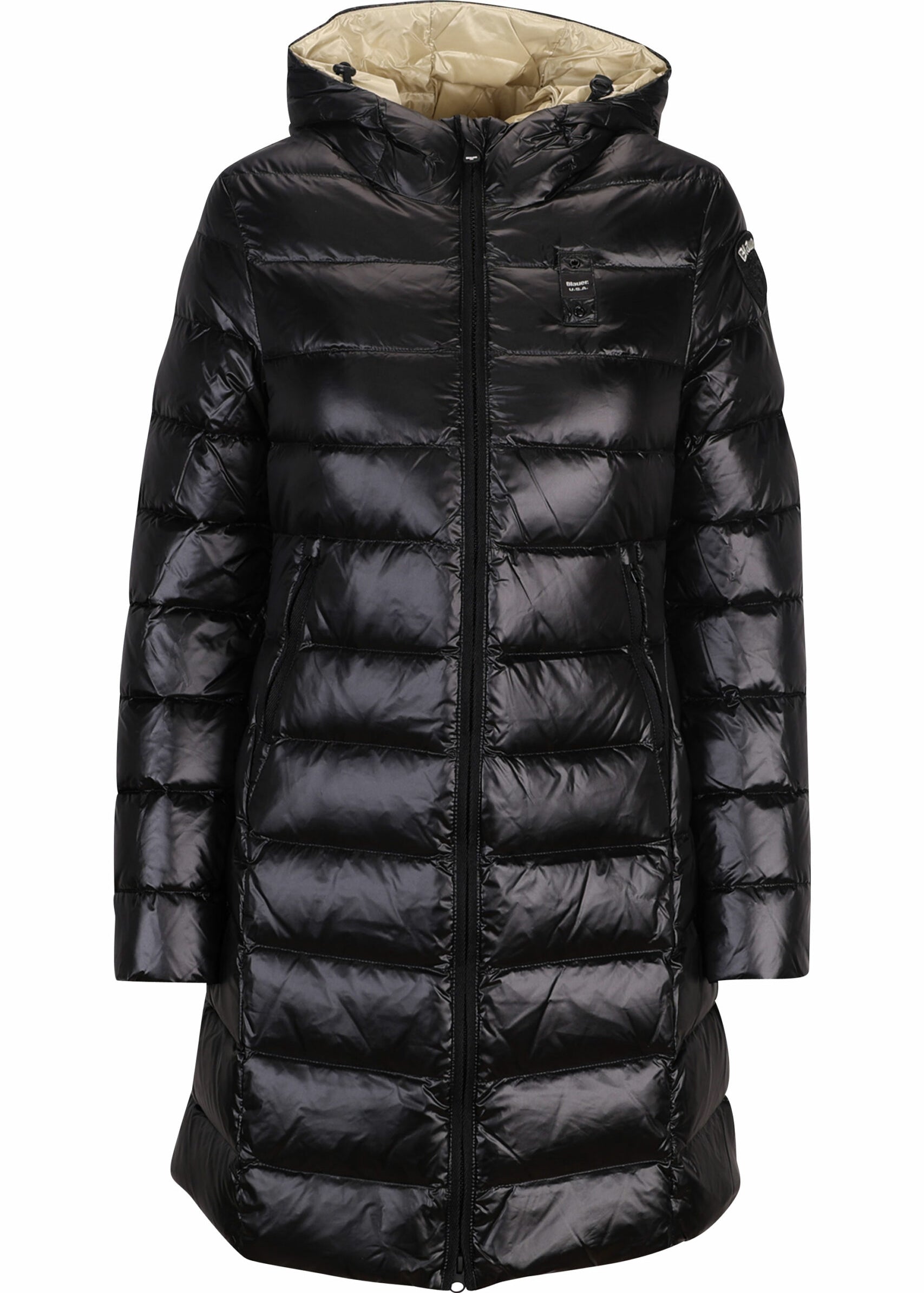 Plumífer negre llarg amb caputxa i línies rectes amb interior beix