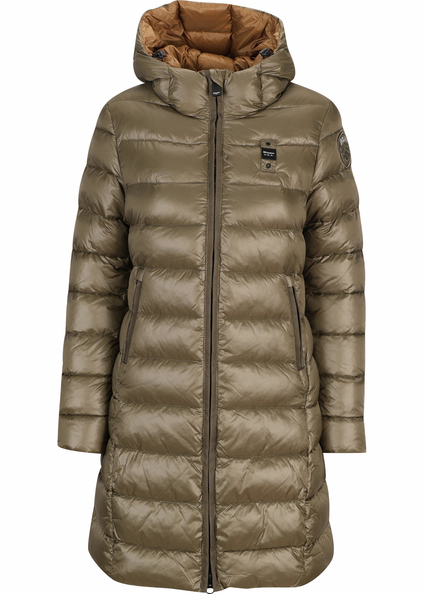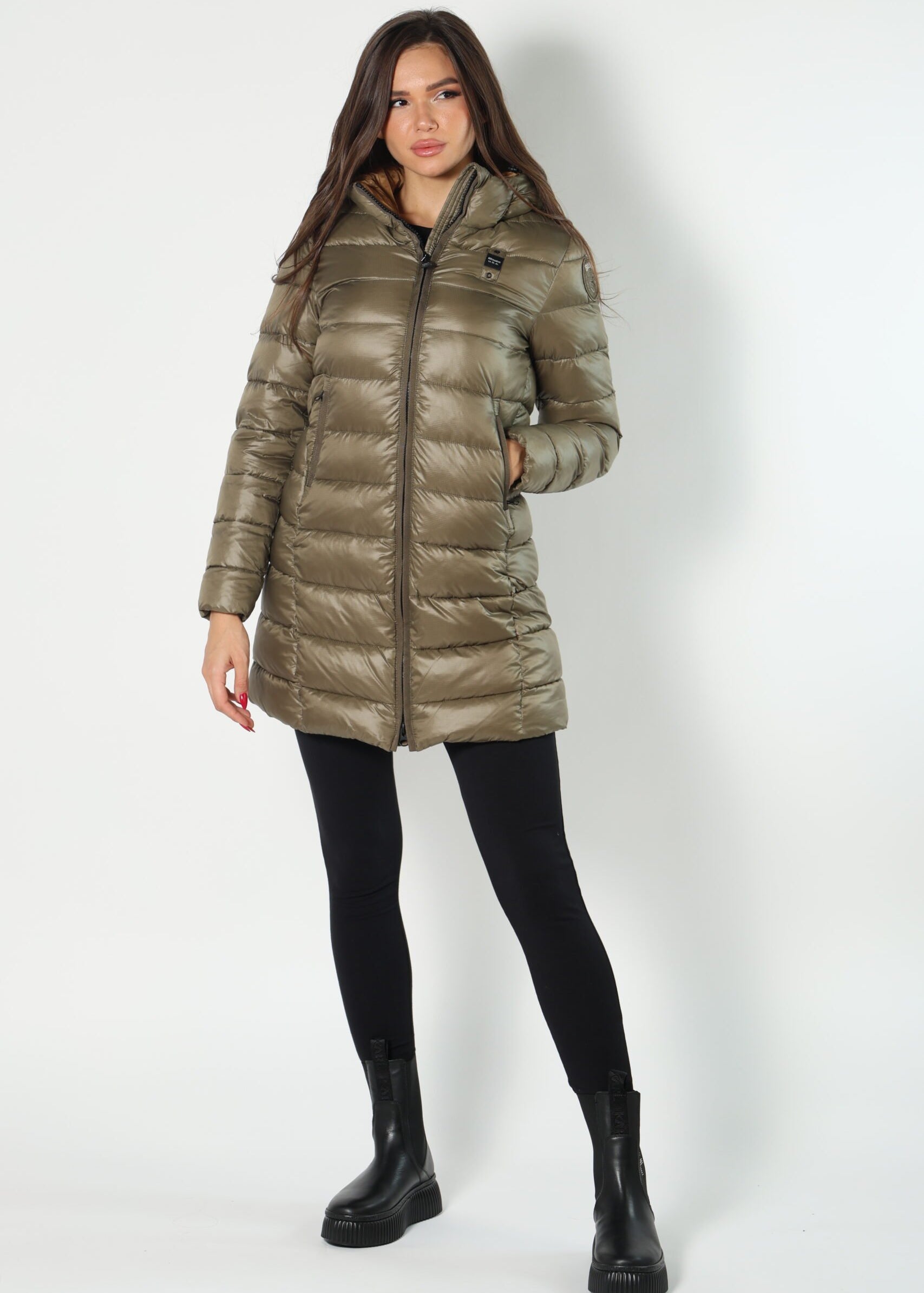 Plumífer verd militar llarg impermeable amb caputxa i línies rectes amb interior marró