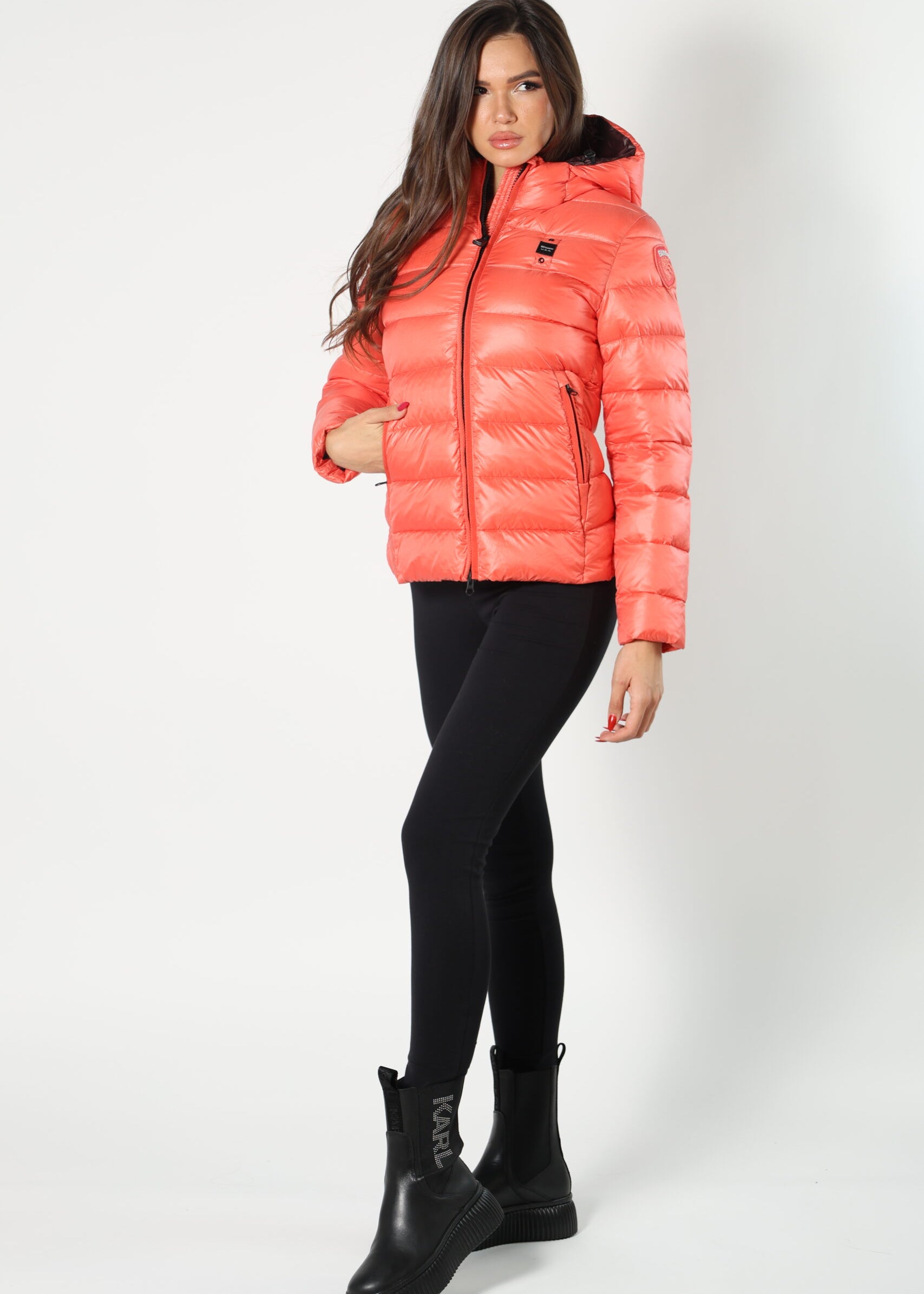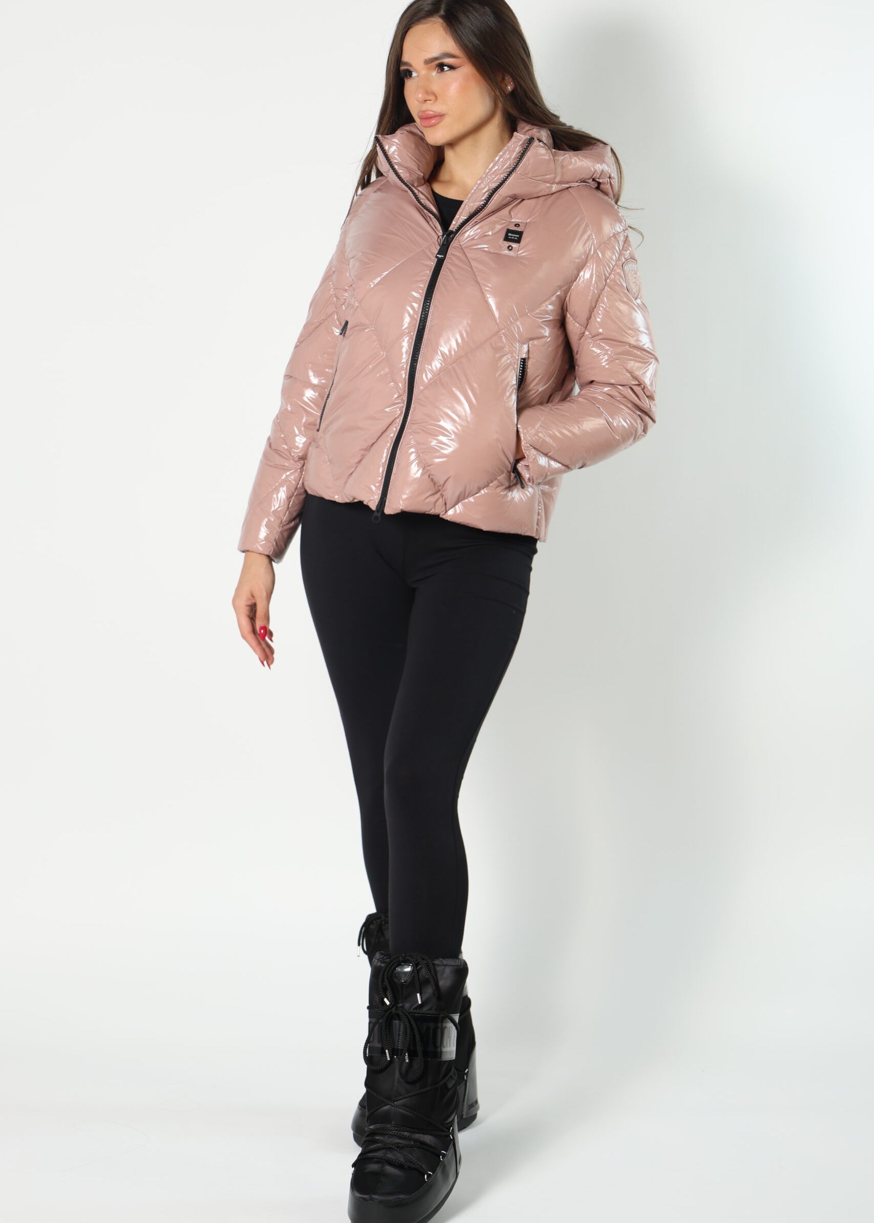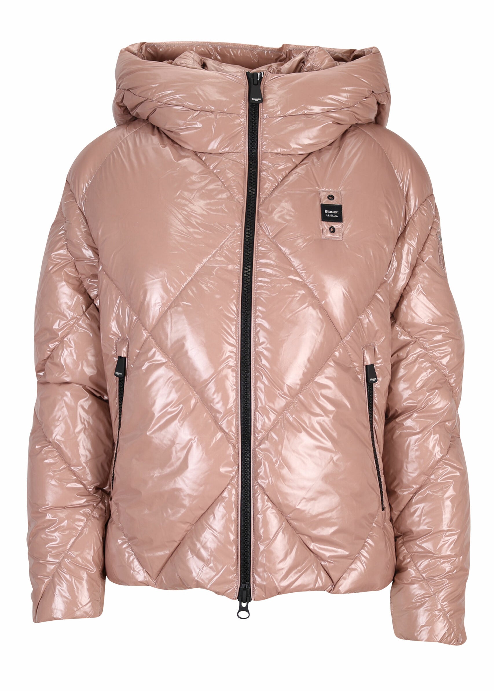 Plumífer rosa pàl·lid amb caputxa i línies diagonals amb logo pegat