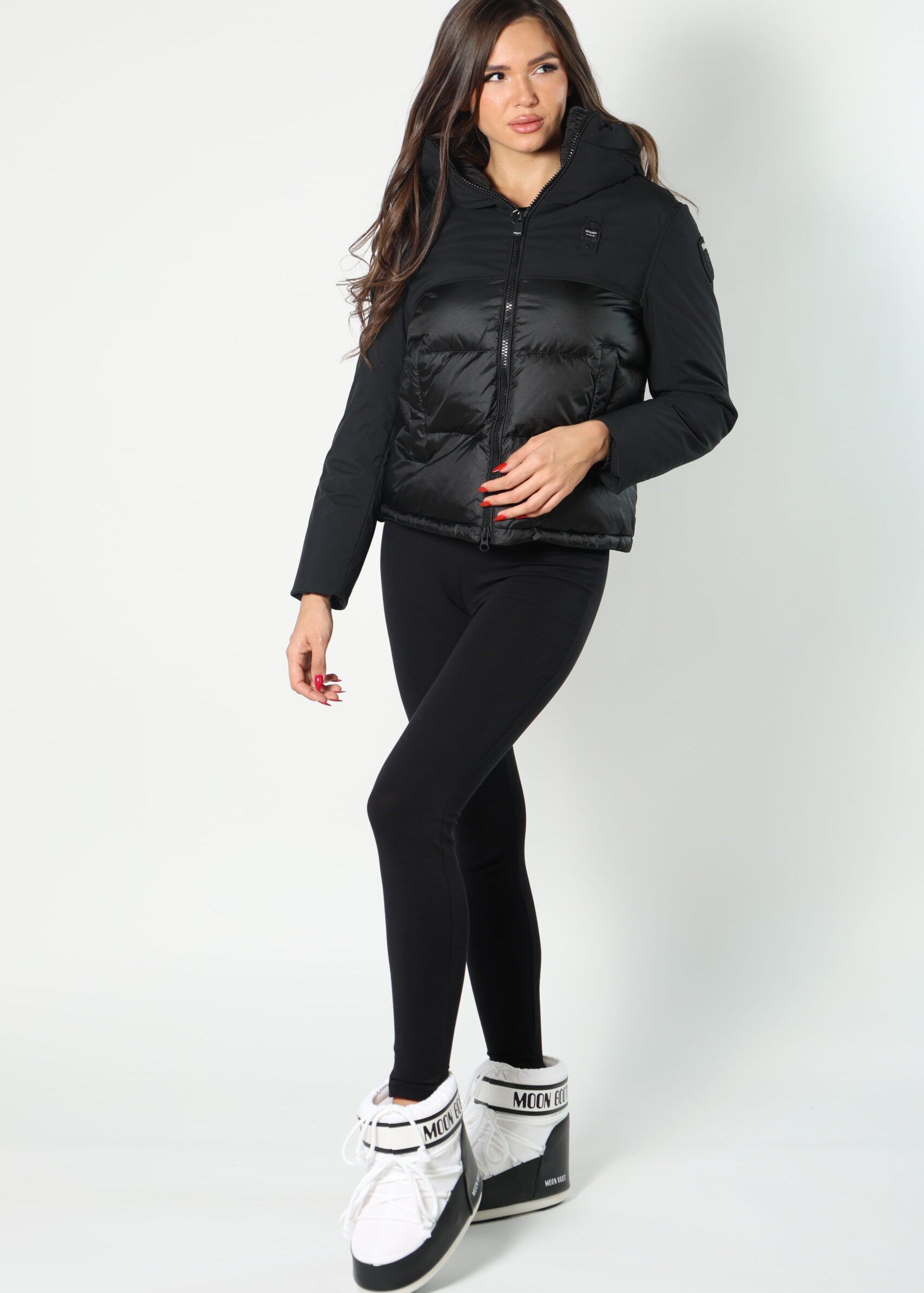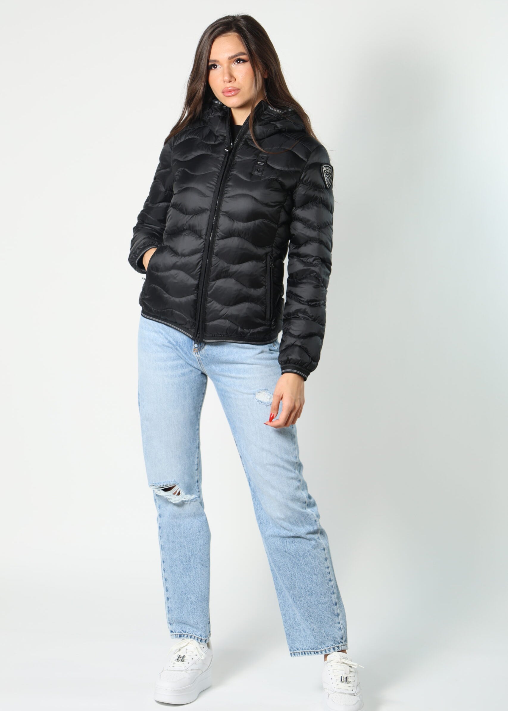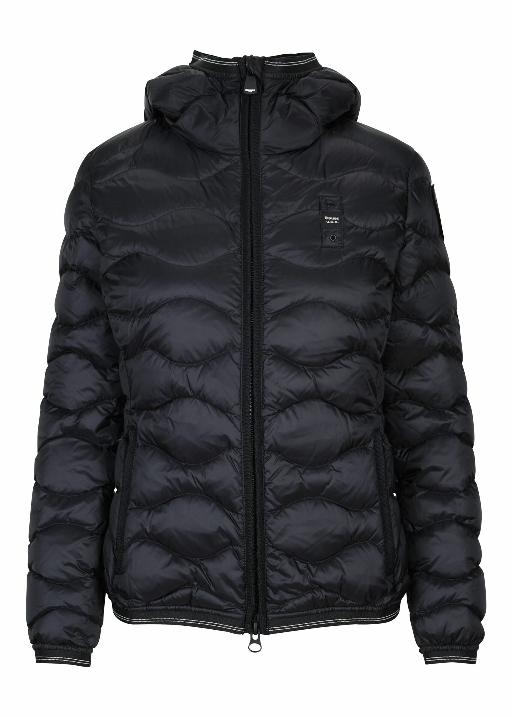 Plumífer negre amb caputxa i línies ondulades amb logo pegat