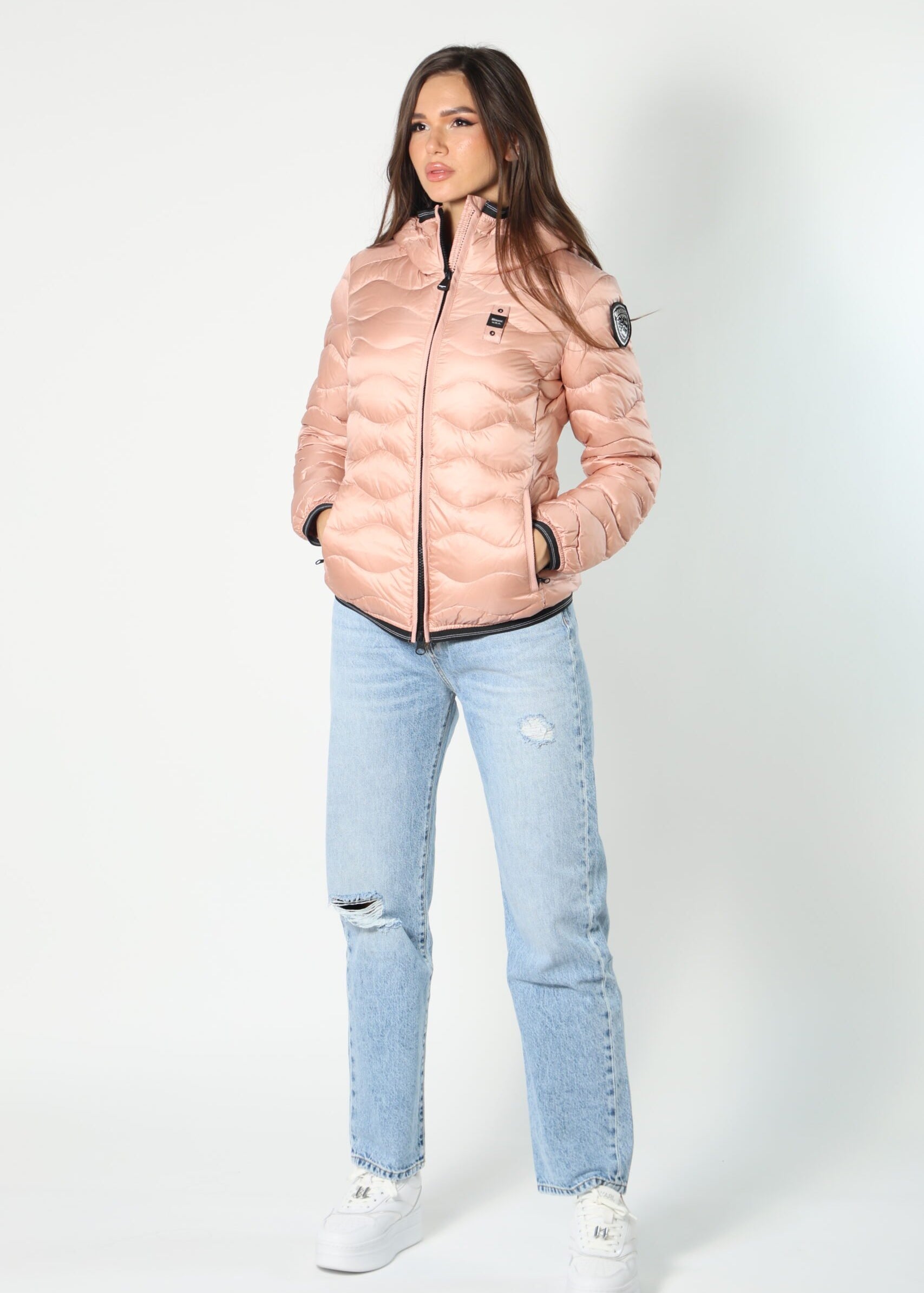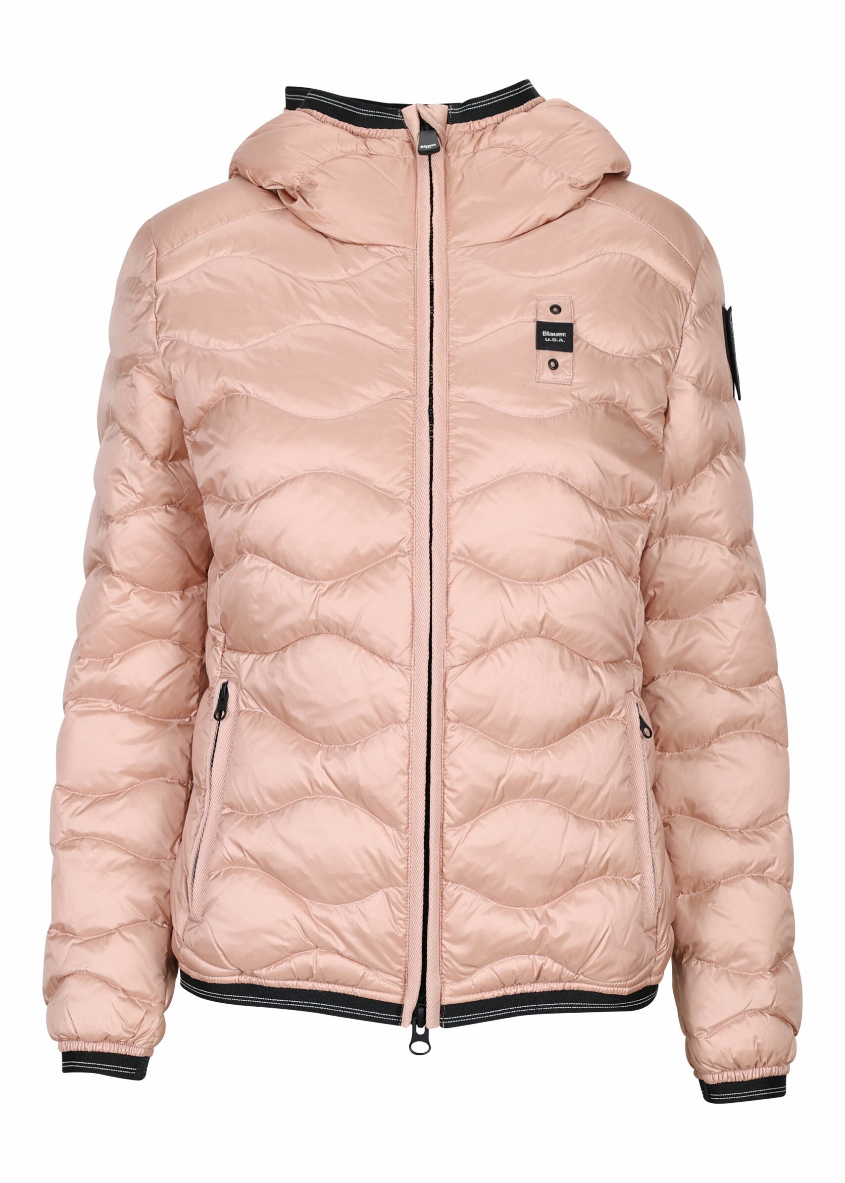 Plumífer rosa pàl·lid amb caputxa i línies ondulades amb logo pegat