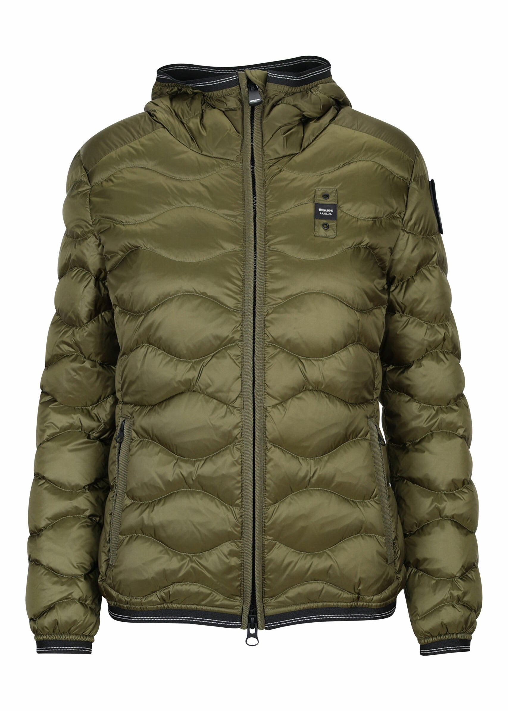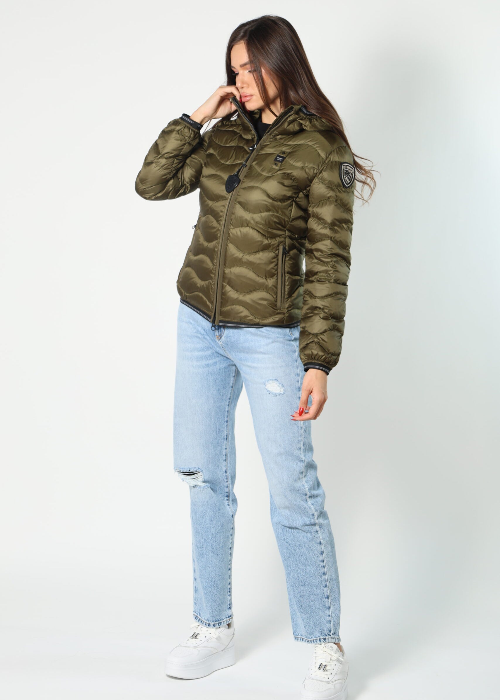 Plumífer verd militar amb caputxa i línies ondulades amb logo pegat