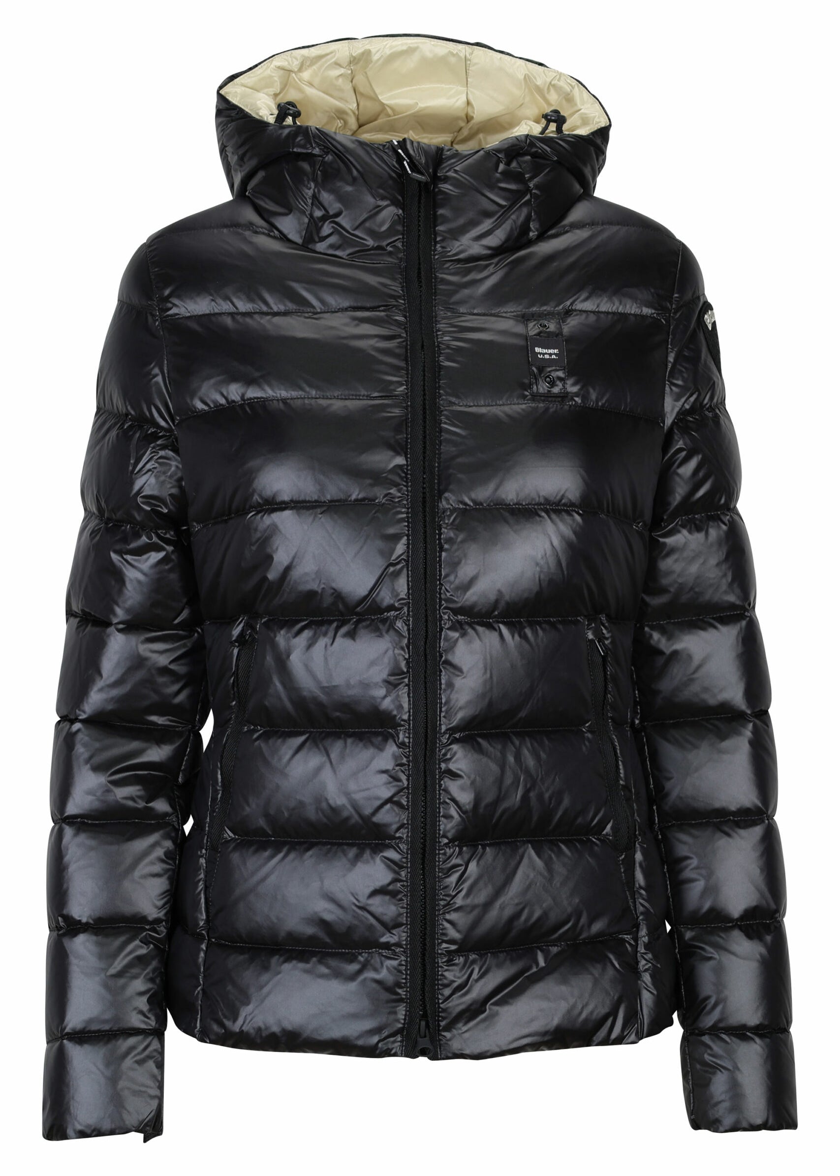 Plumífer negre amb caputxa i línies rectes amb interior beix i logo pegat