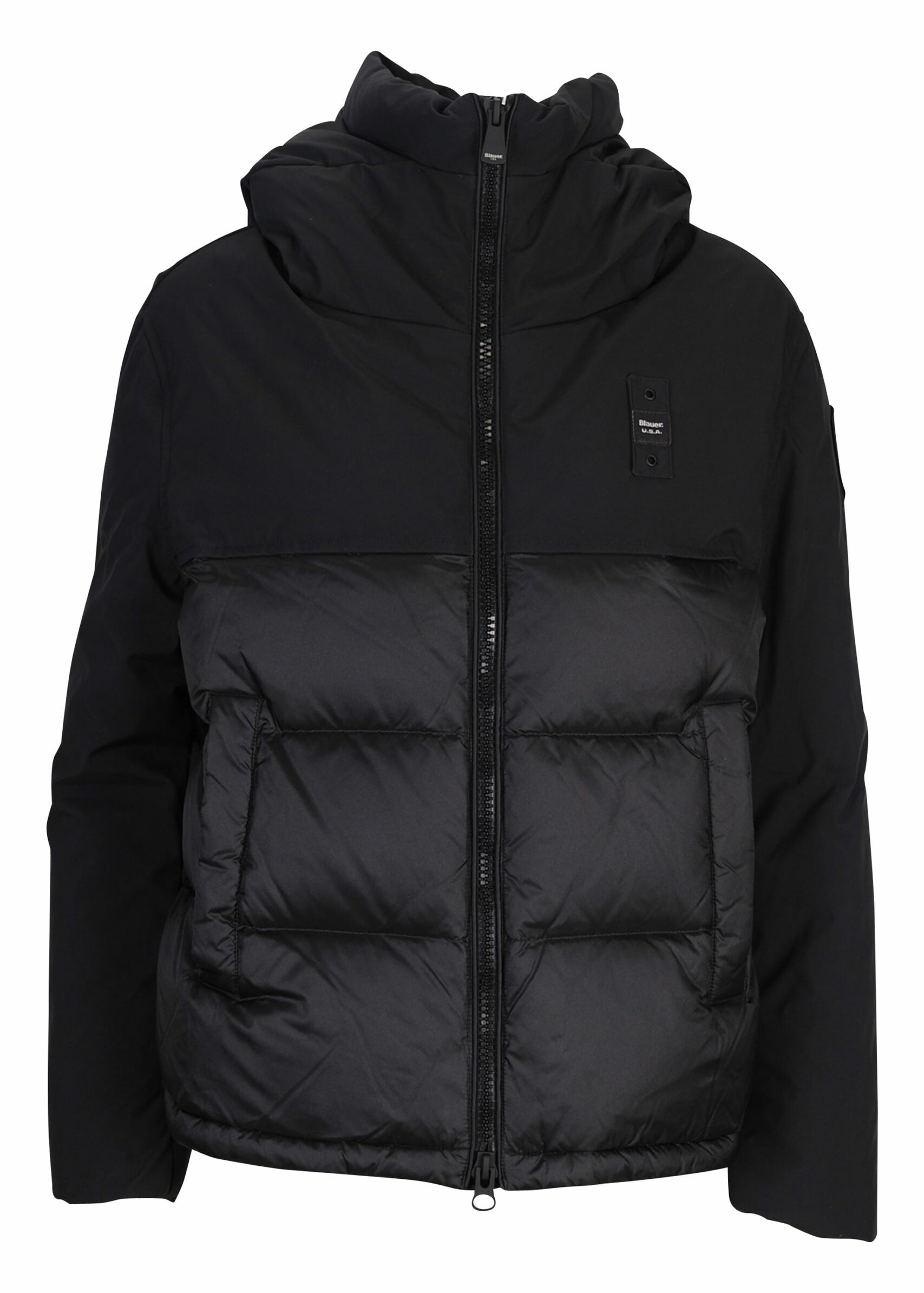Plumífer negre amb caputxa i línies rectes i logo pegat