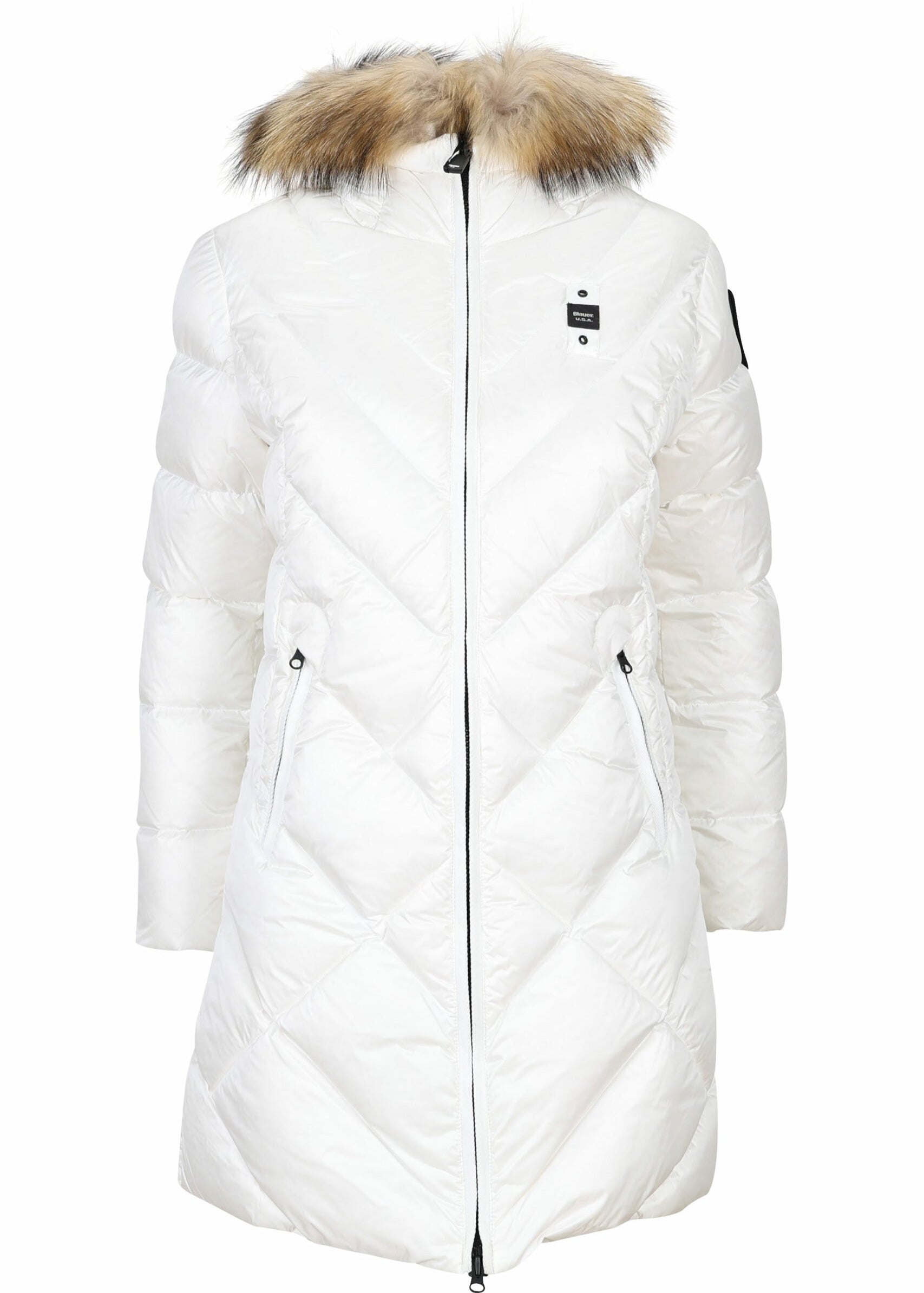 Plumífer blanc impermeable amb caputxa de pèls i línies diagonals amb interior beix