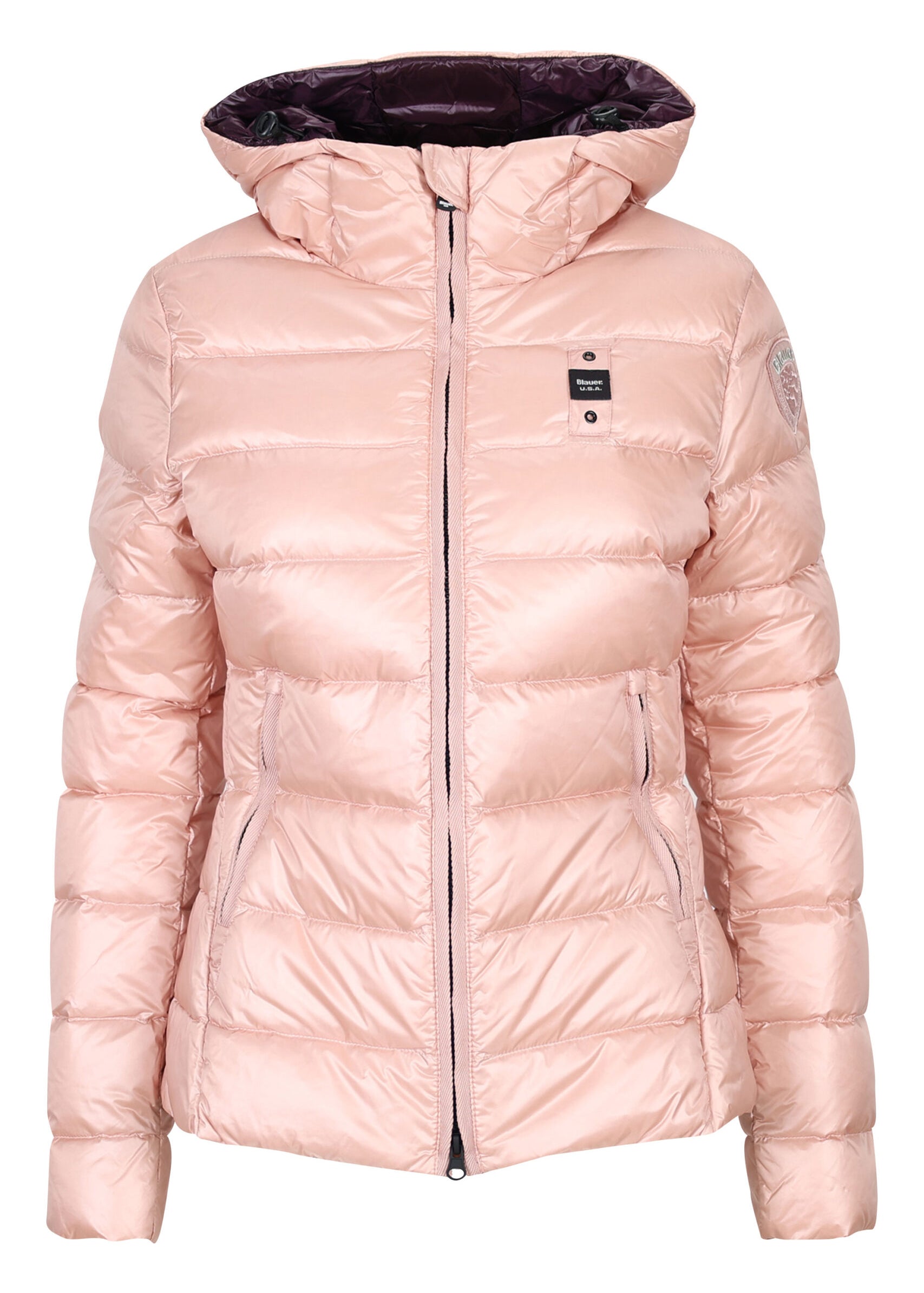 Plumífer rosa pàl·lid de línies rectes amb caputxa i interior violeta amb logo pegat