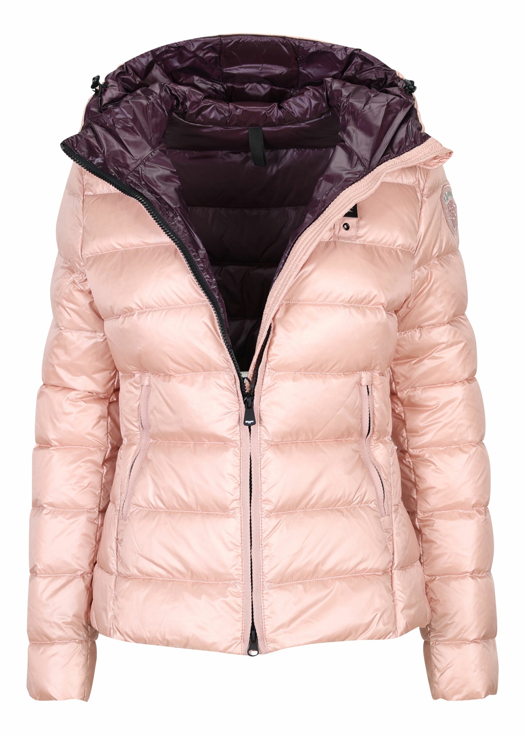 Plumífer rosa pàl·lid amb caputxa i línies rectes amb interior violeta i logo pegat