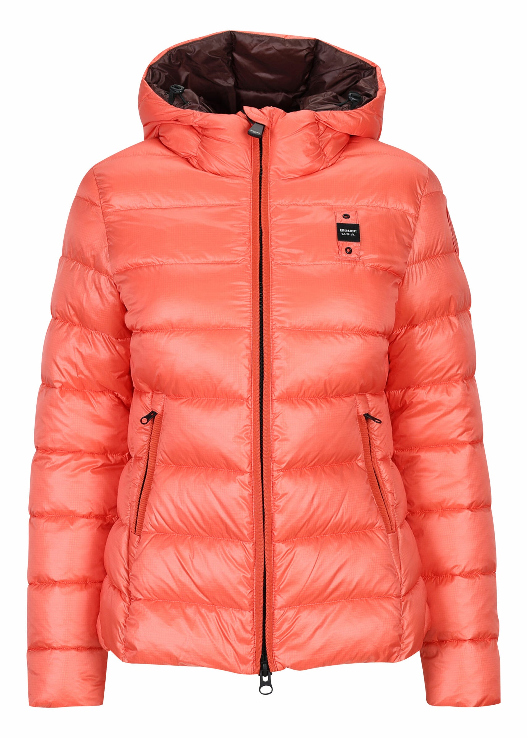 Plumífer vermell de línies rectes amb caputxa i interior violeta amb logo pegat