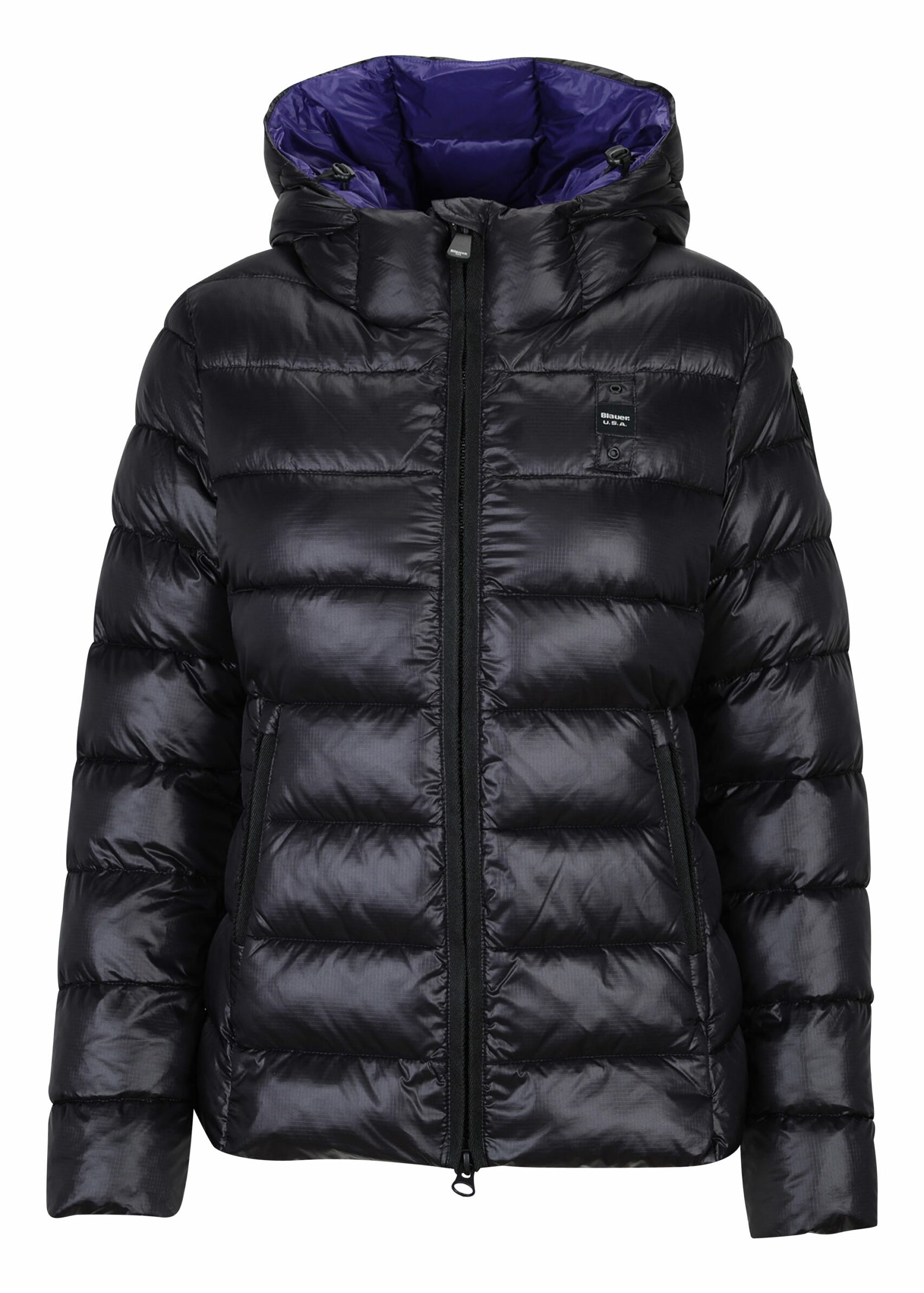 Plumífer negre de línies rectes amb caputxa i interior violeta amb logo pegat