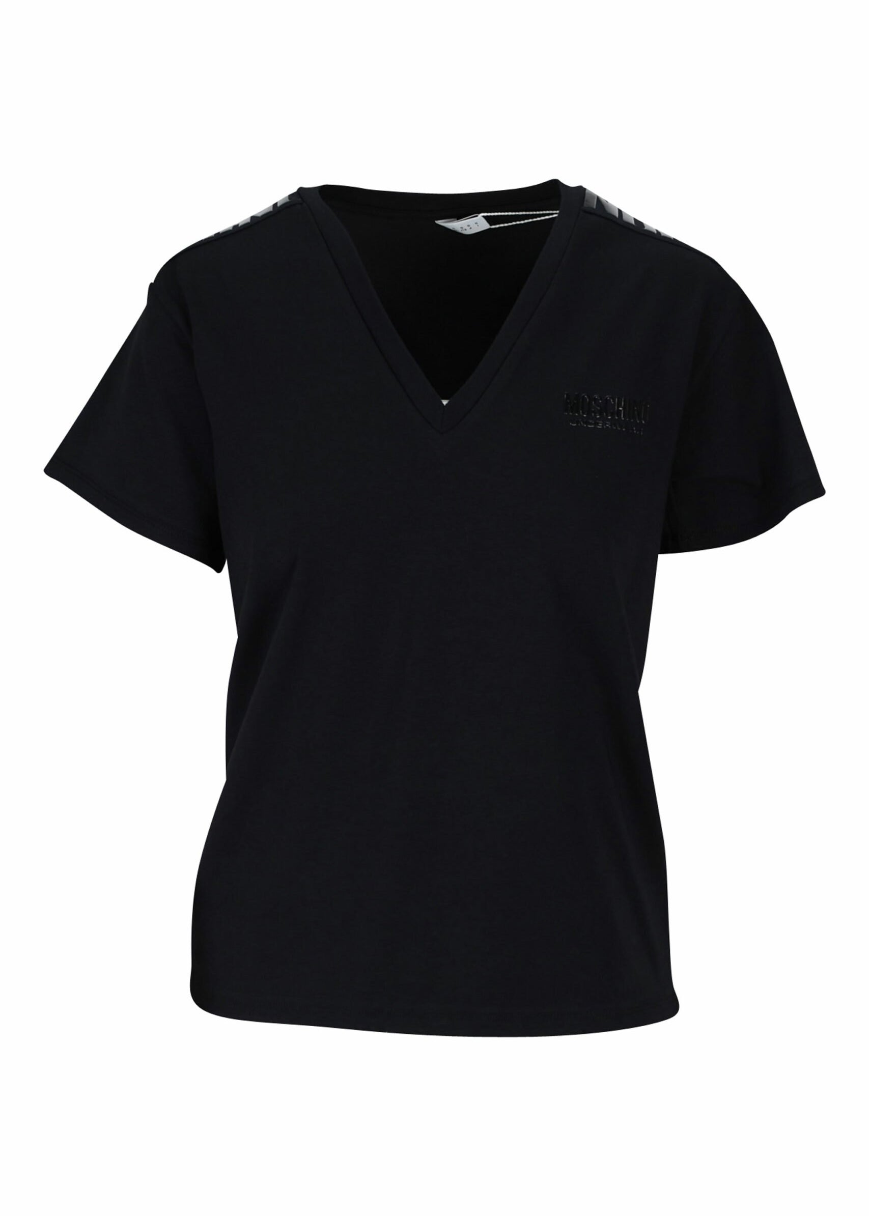 Samarreta negra amb coll en "v" i logotip en cinta monocromàtic