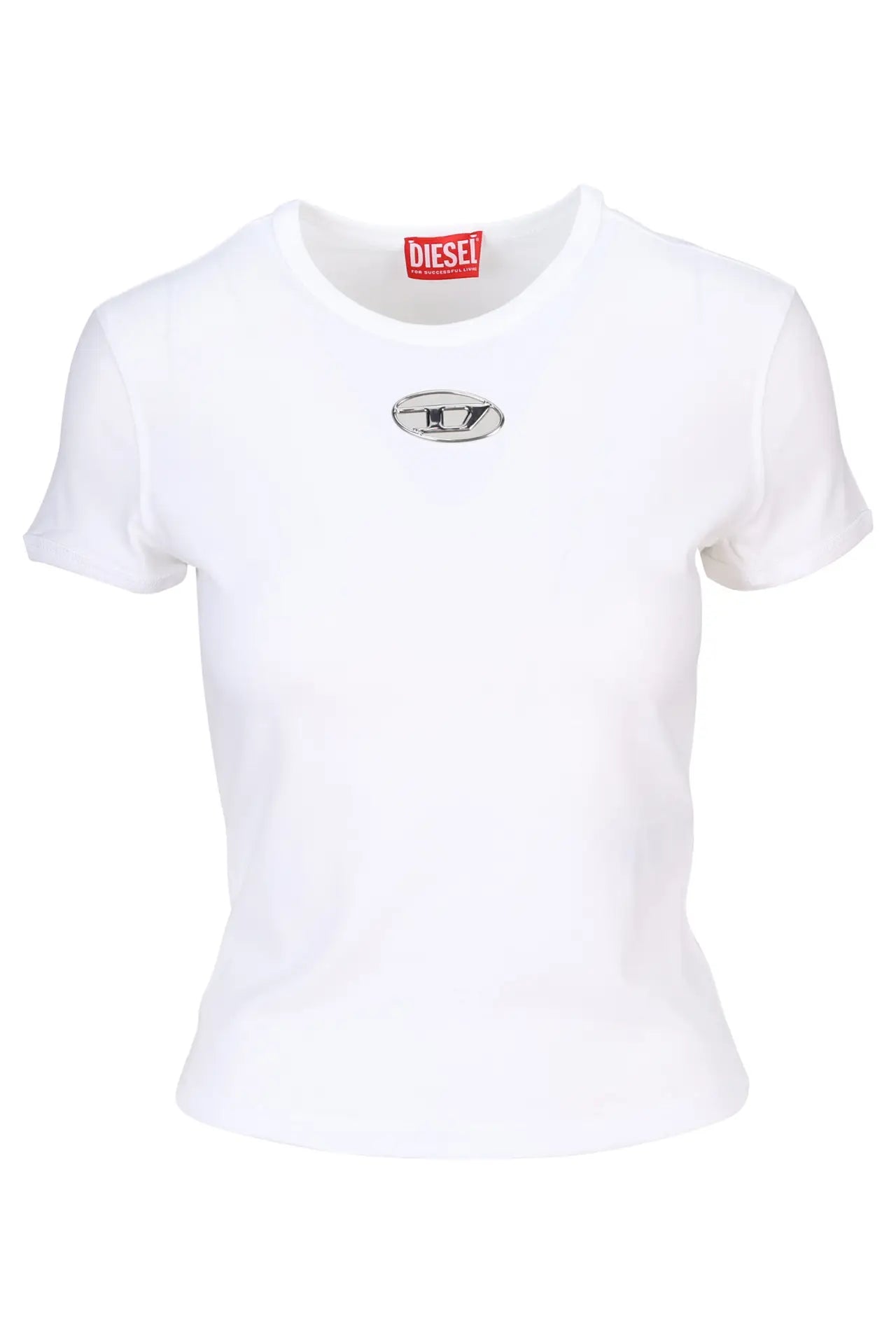 Camiseta blanca con logo "Oval-D" en metal -