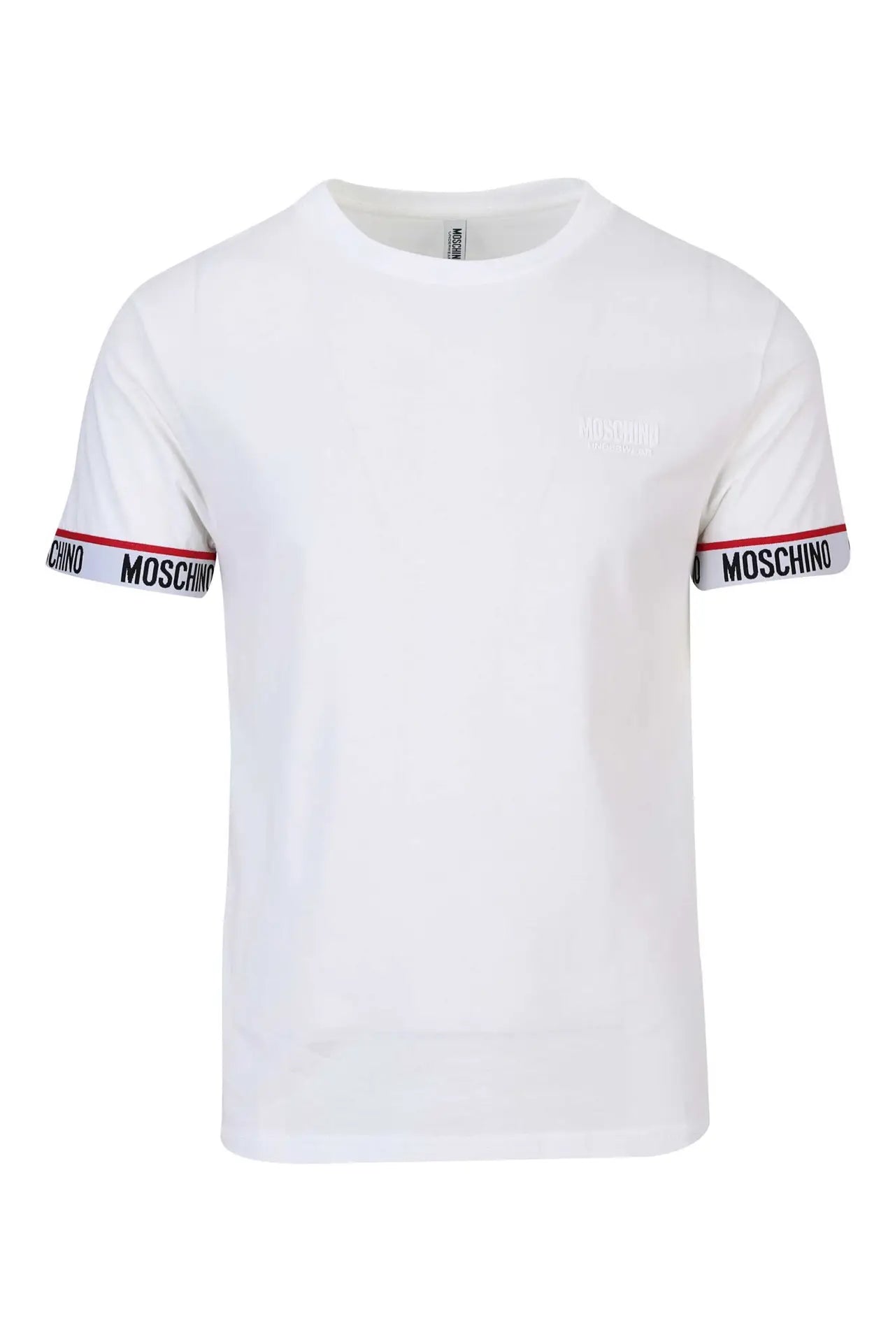 Camiseta blanca de algodón con logo cinta en mangas y mini logo monocromático -