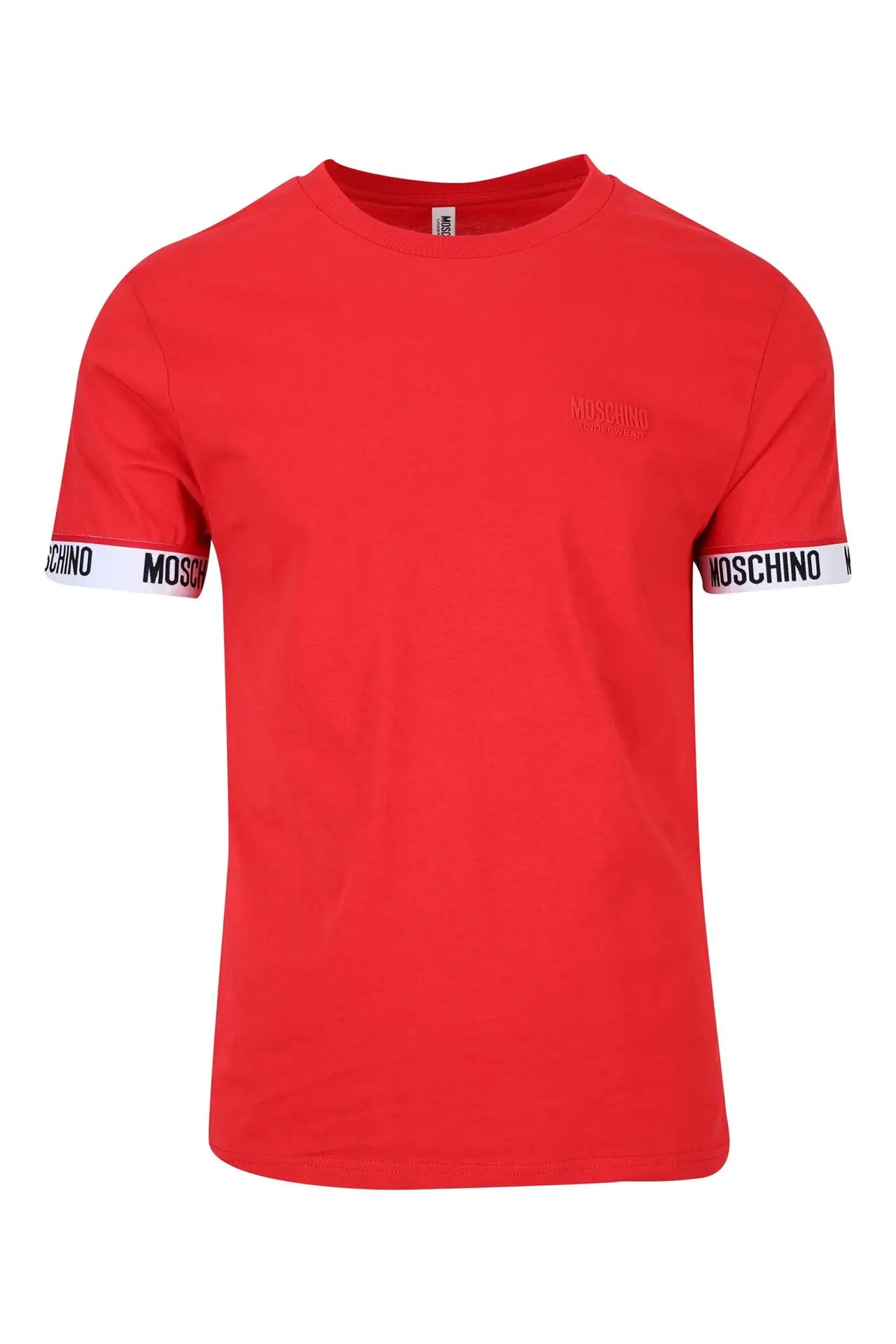 Camiseta roja de algodón con logo cinta en mangas y mini logo monocromático -