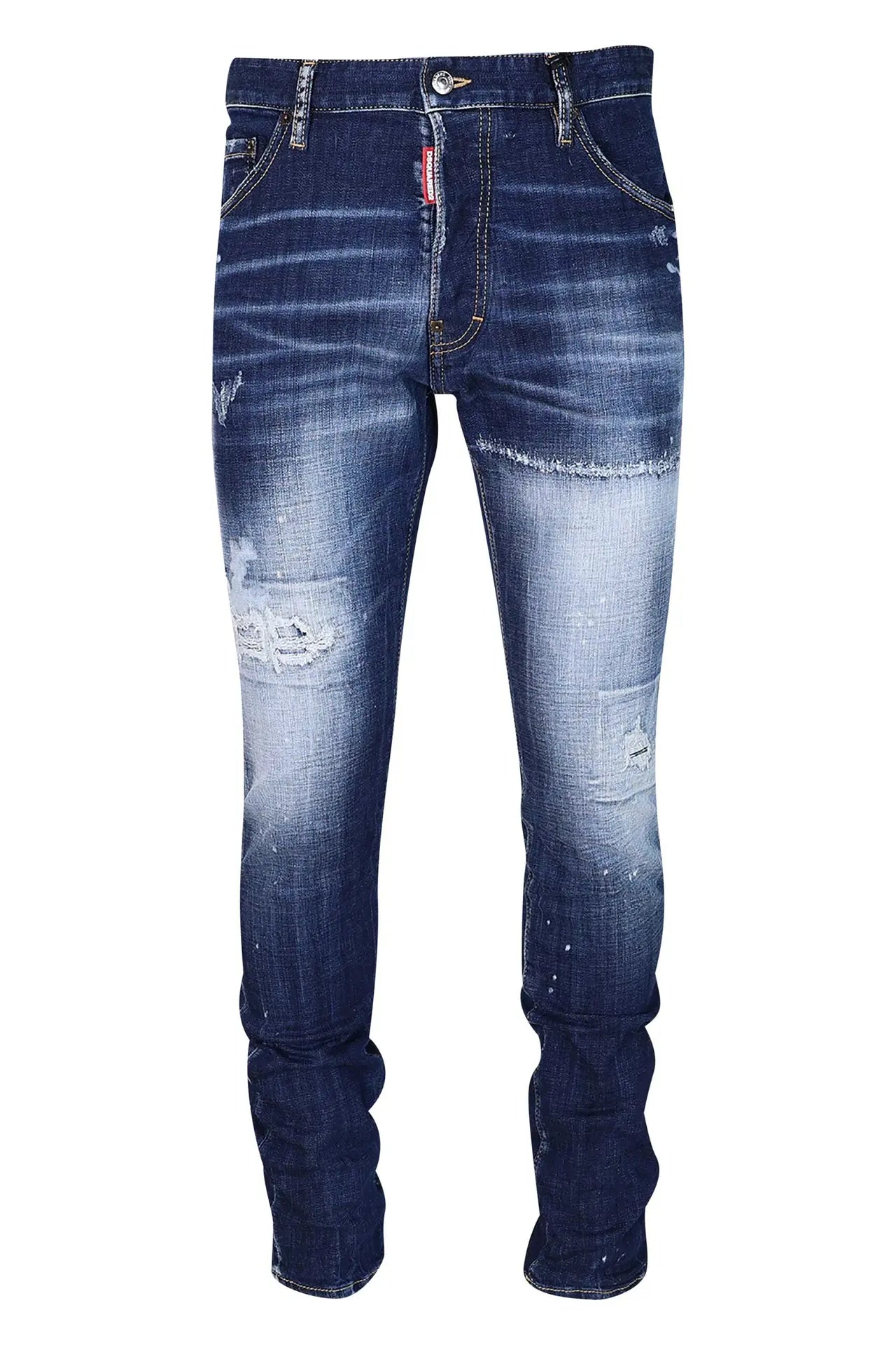 Pantalón vaquero azul oscuro "Cool Guy Jean" semi desgastado con parches -