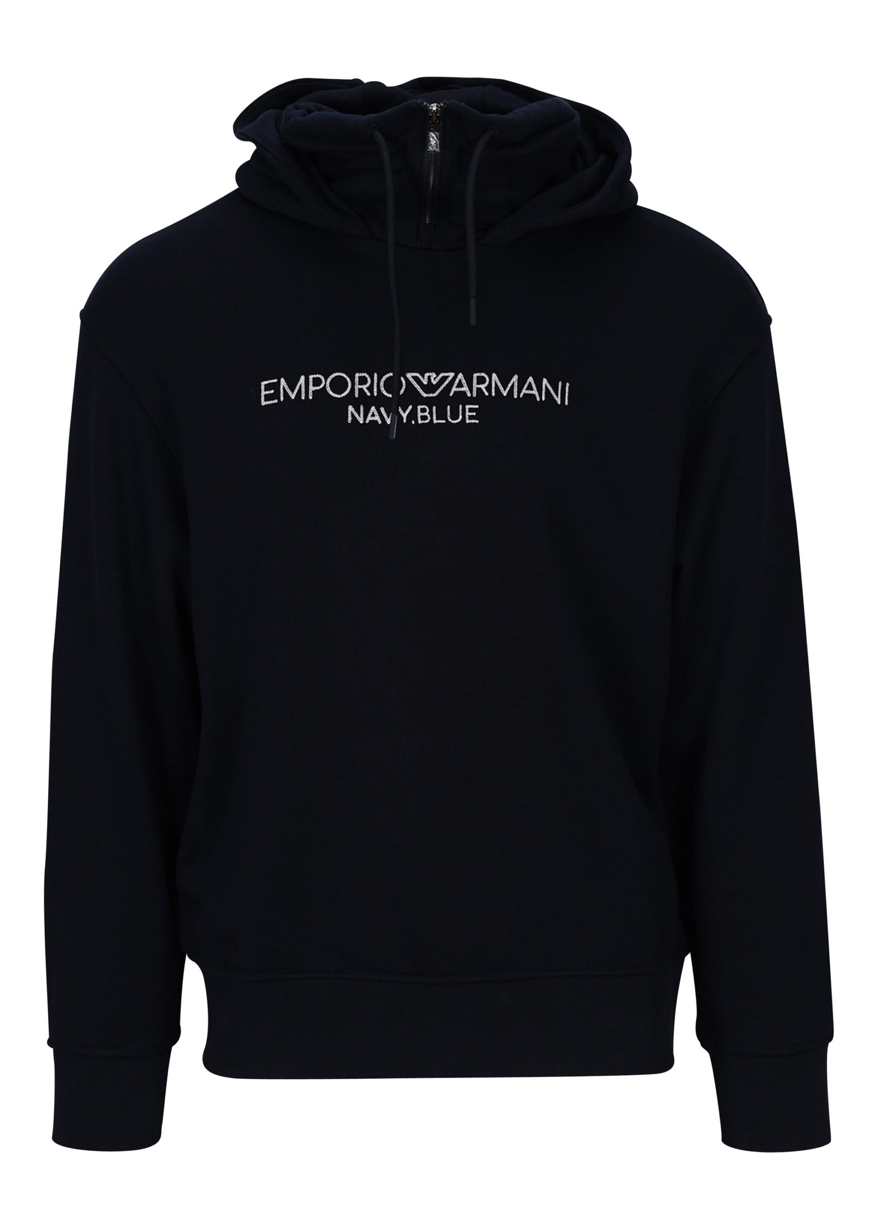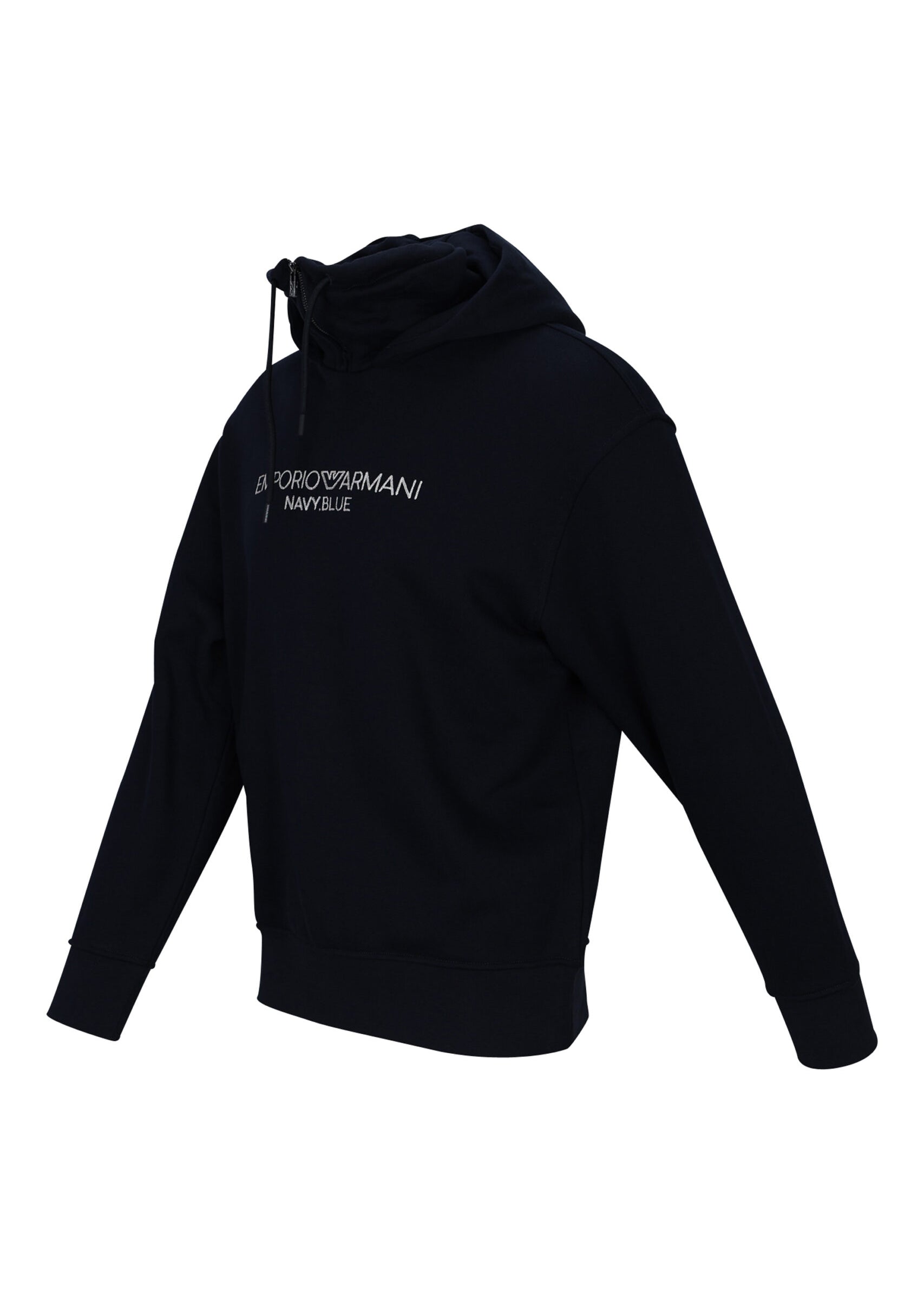 Dessuadora blava fosc amb caputxa i logotip centrat