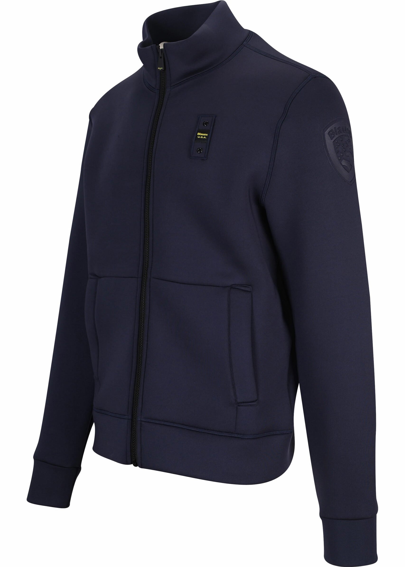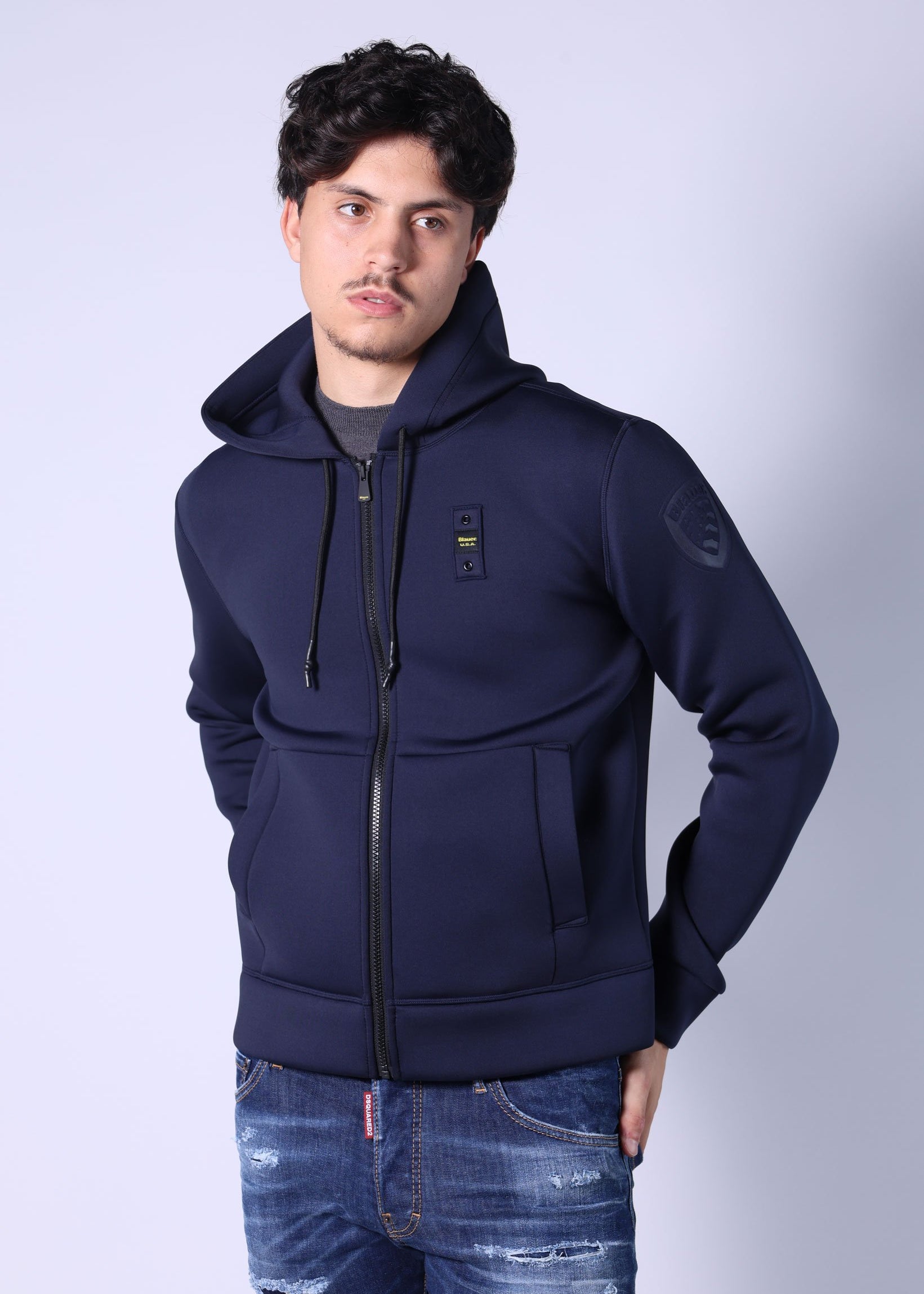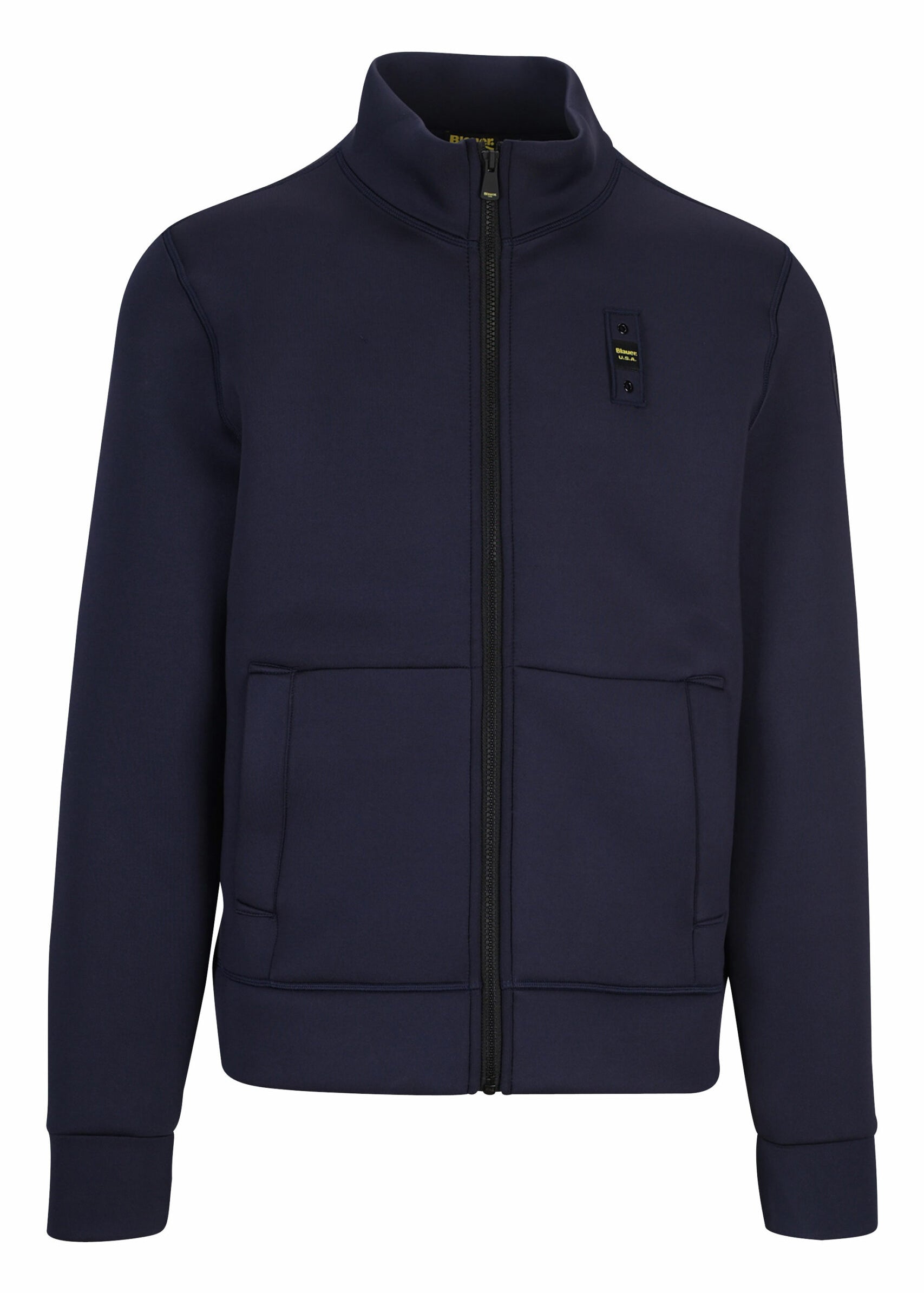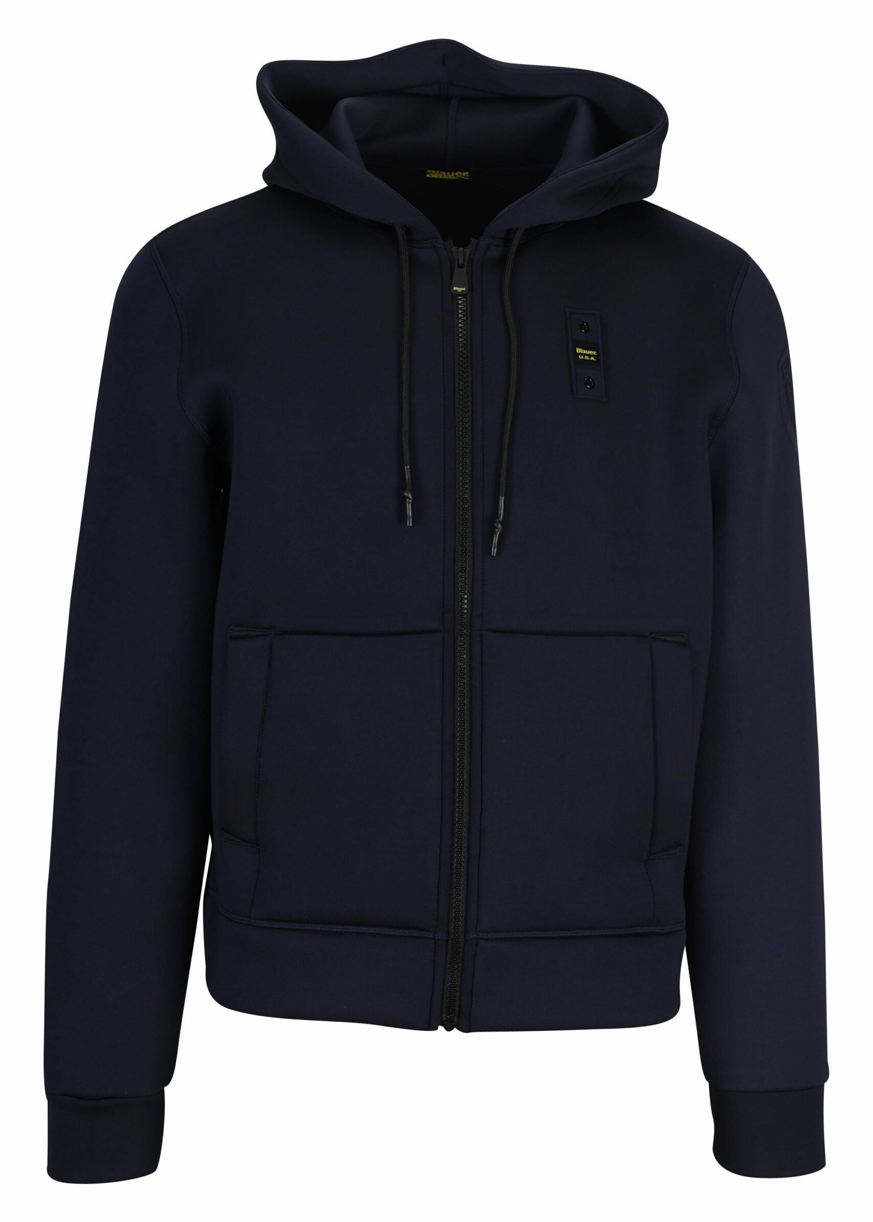 Dessuadora blava amb cremallera i logo pegat monocromàtic