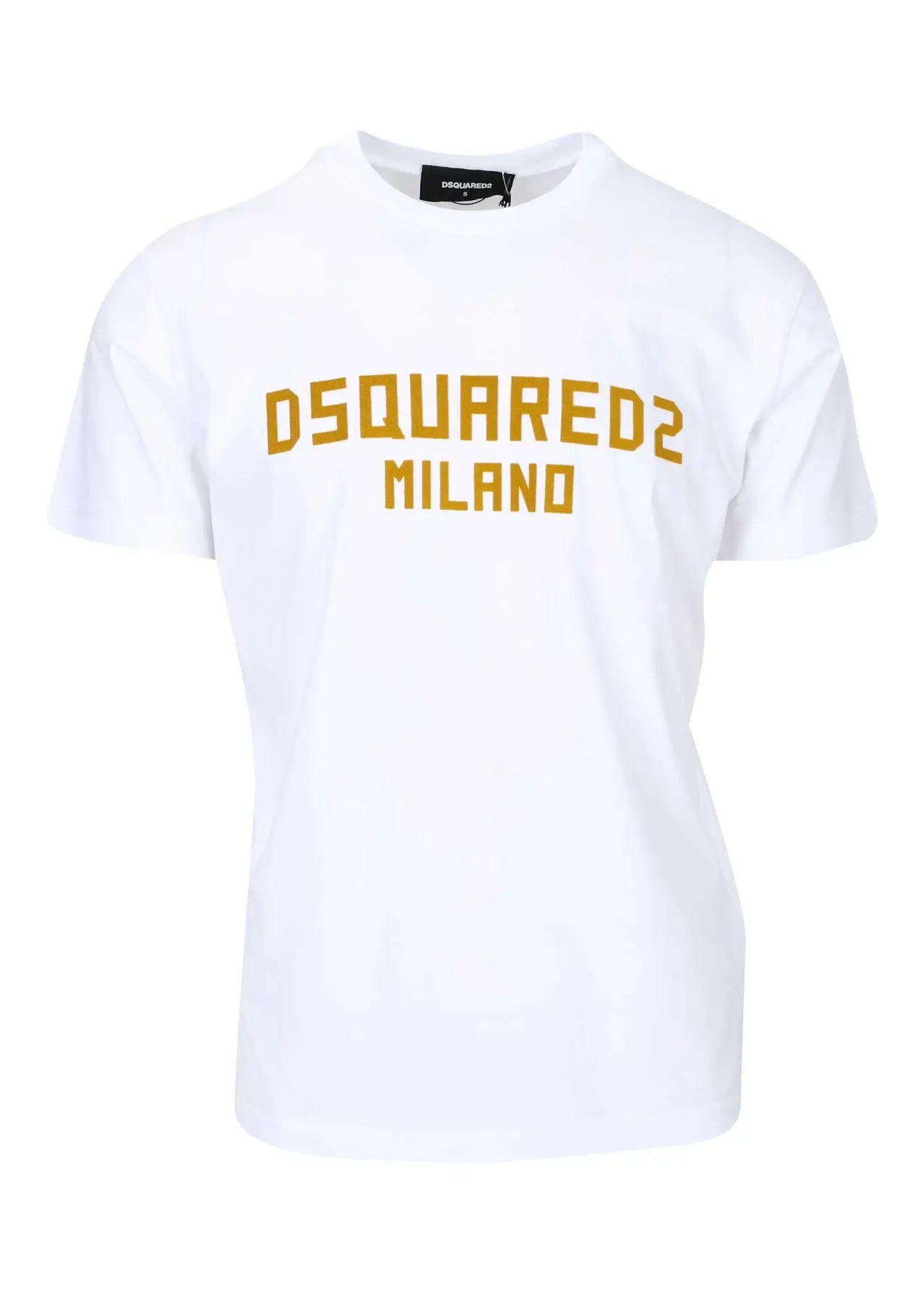 Camiseta blanca con maxilogo "dsquared2 milano" en amarilla -