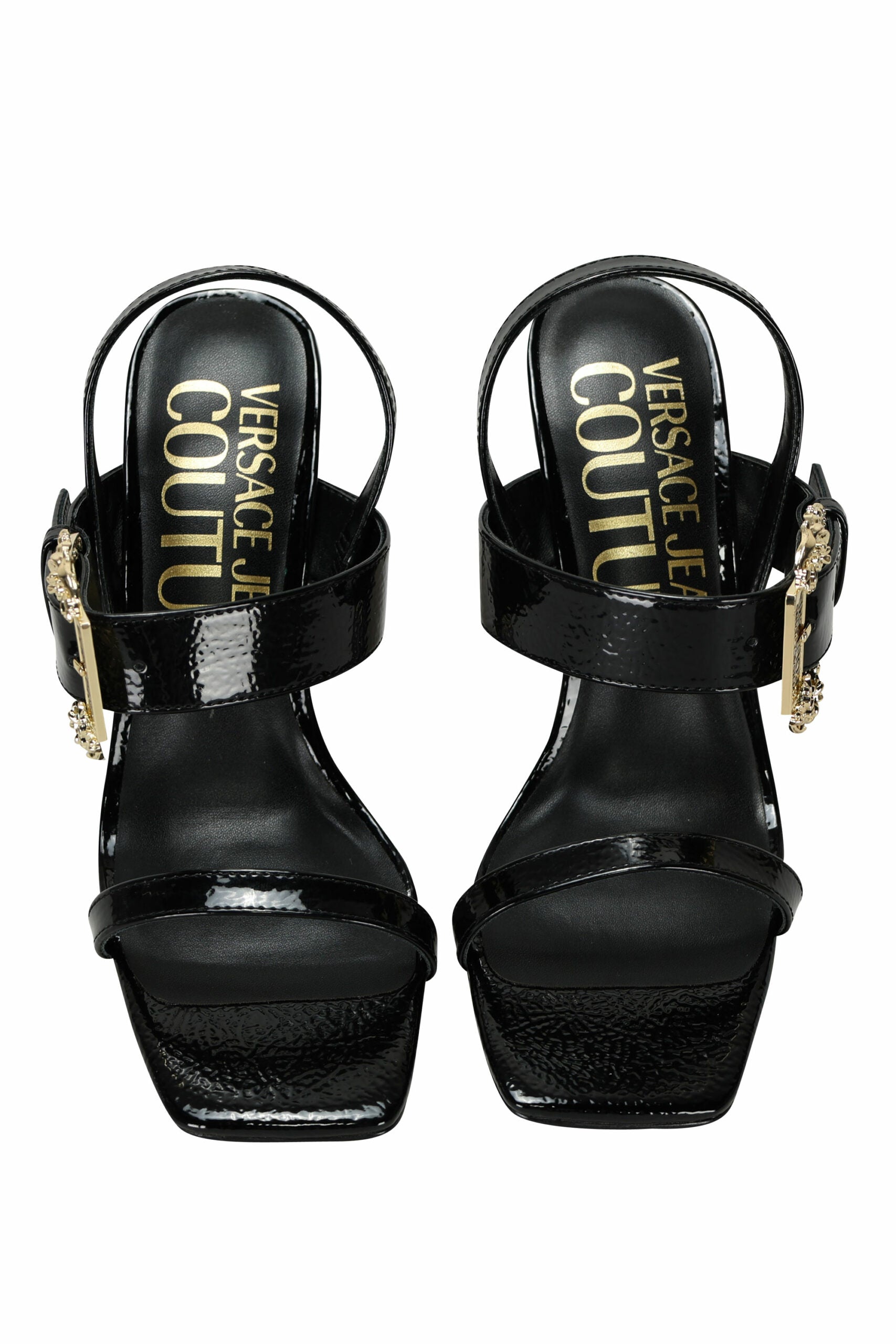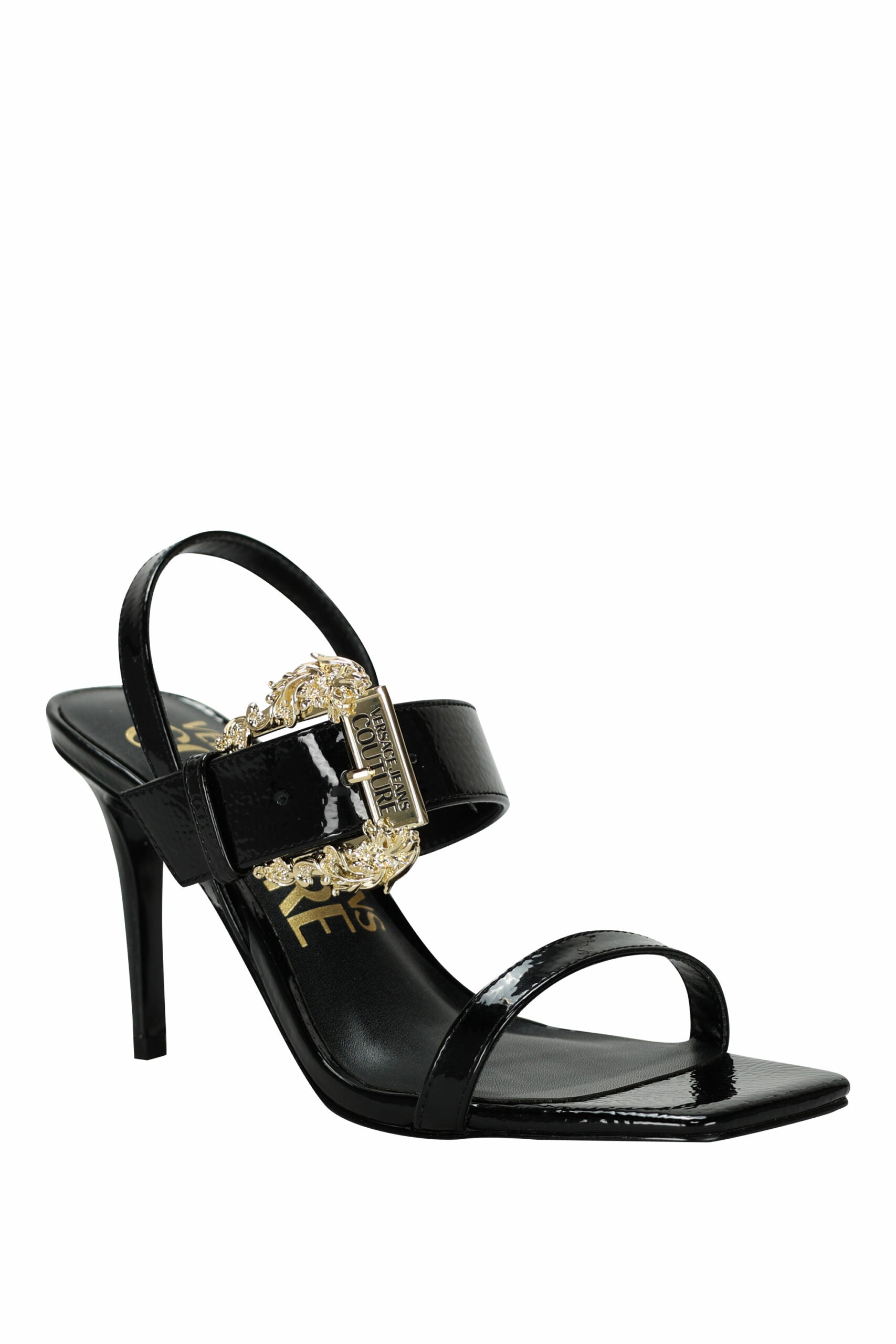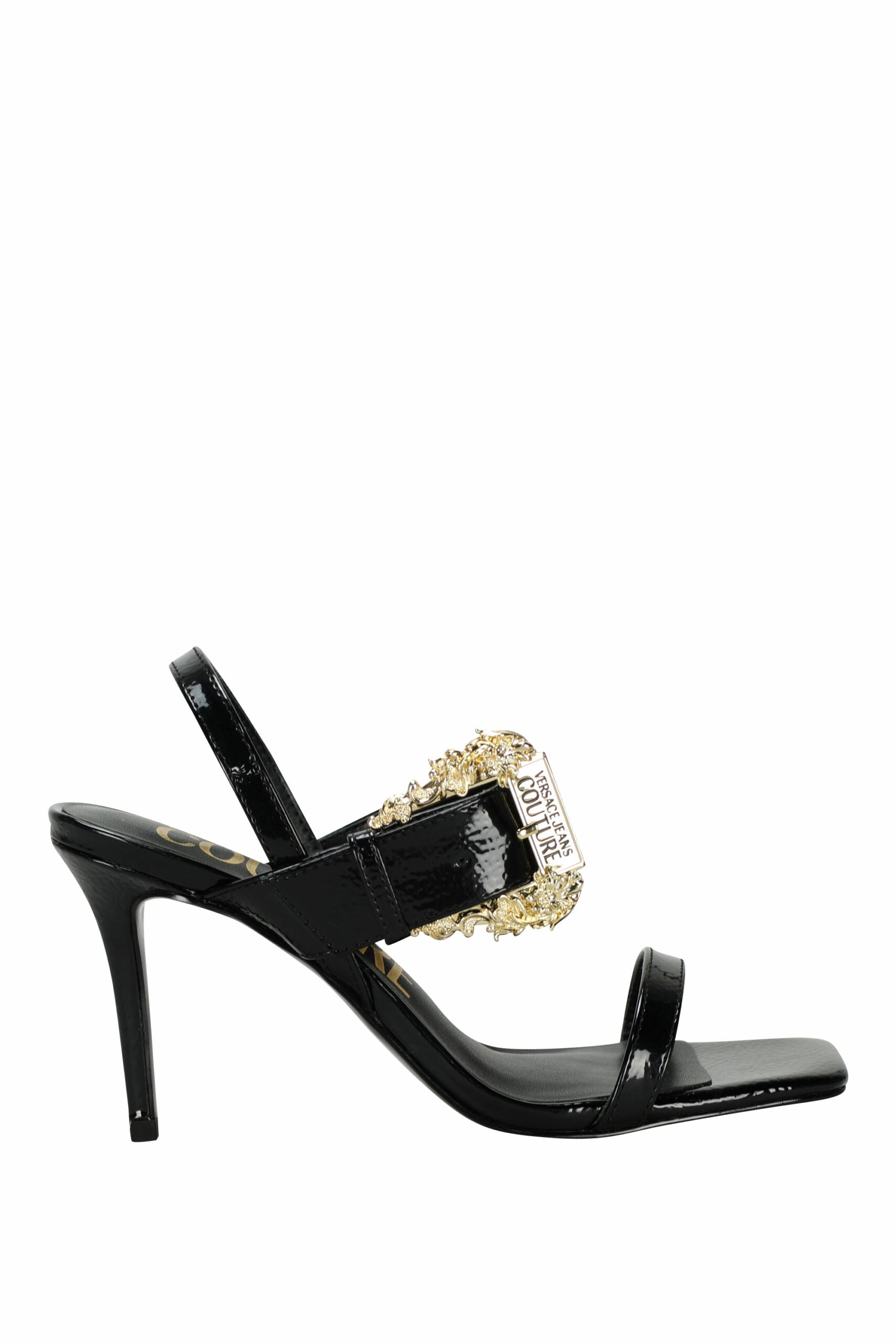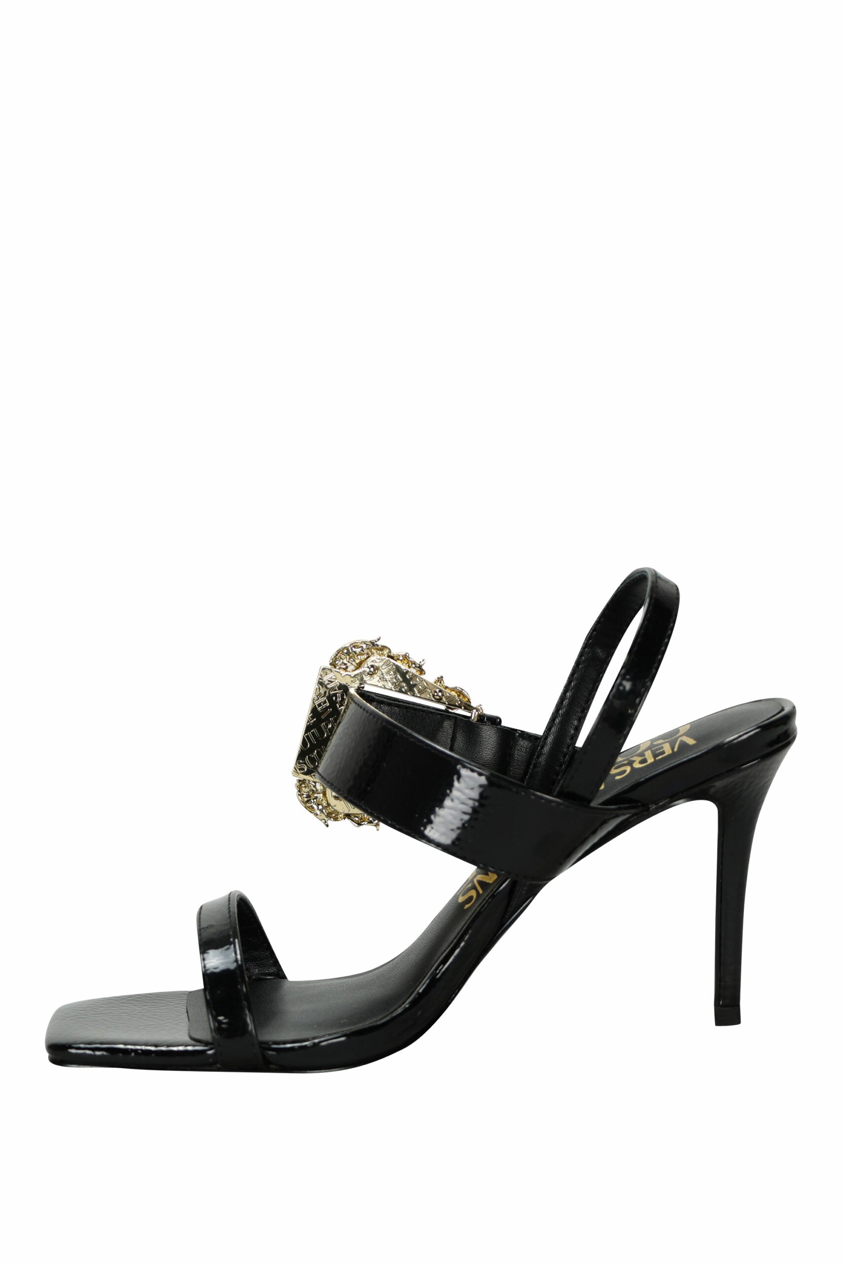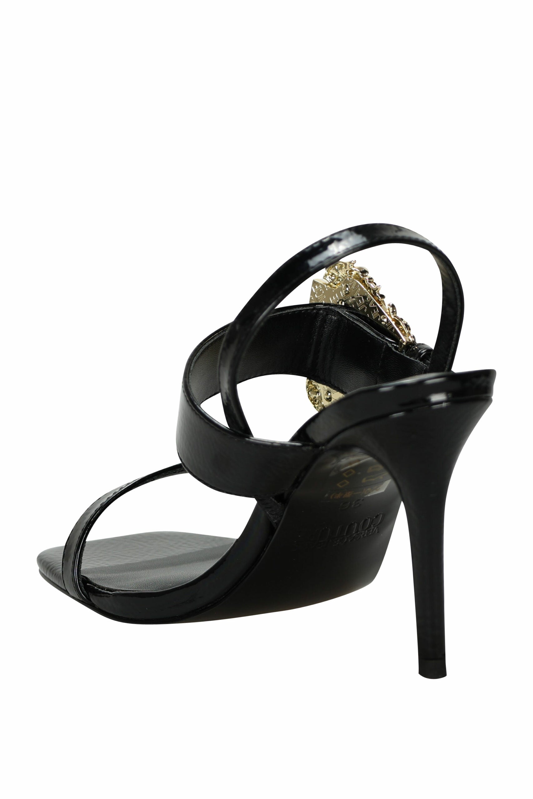 Tacones de aguja negro con hebilla barroca dorado -