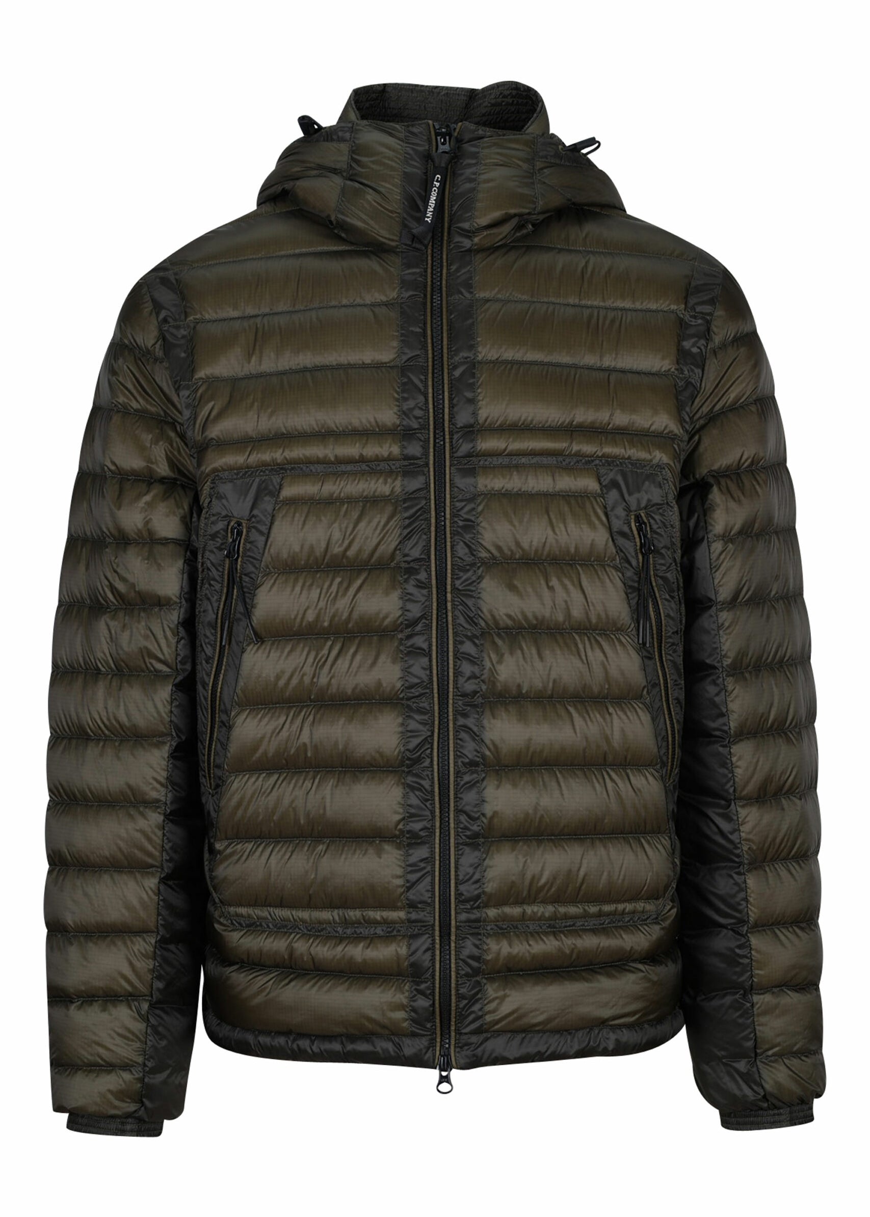 Plumífero verde militar con capucha y lineas onduladas con logo parche