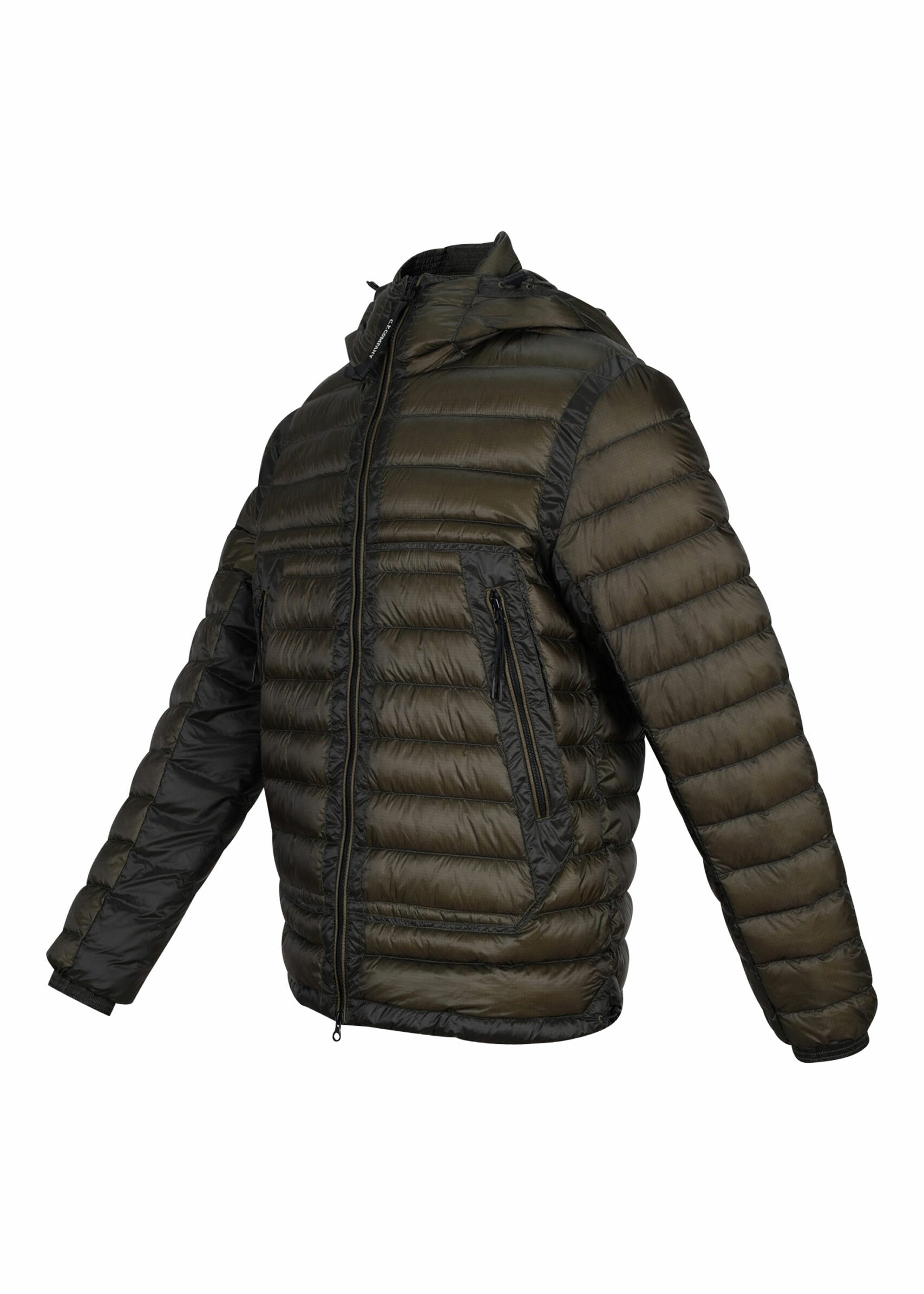 Plumífero verde militar con capucha y lineas rectas con interior beige