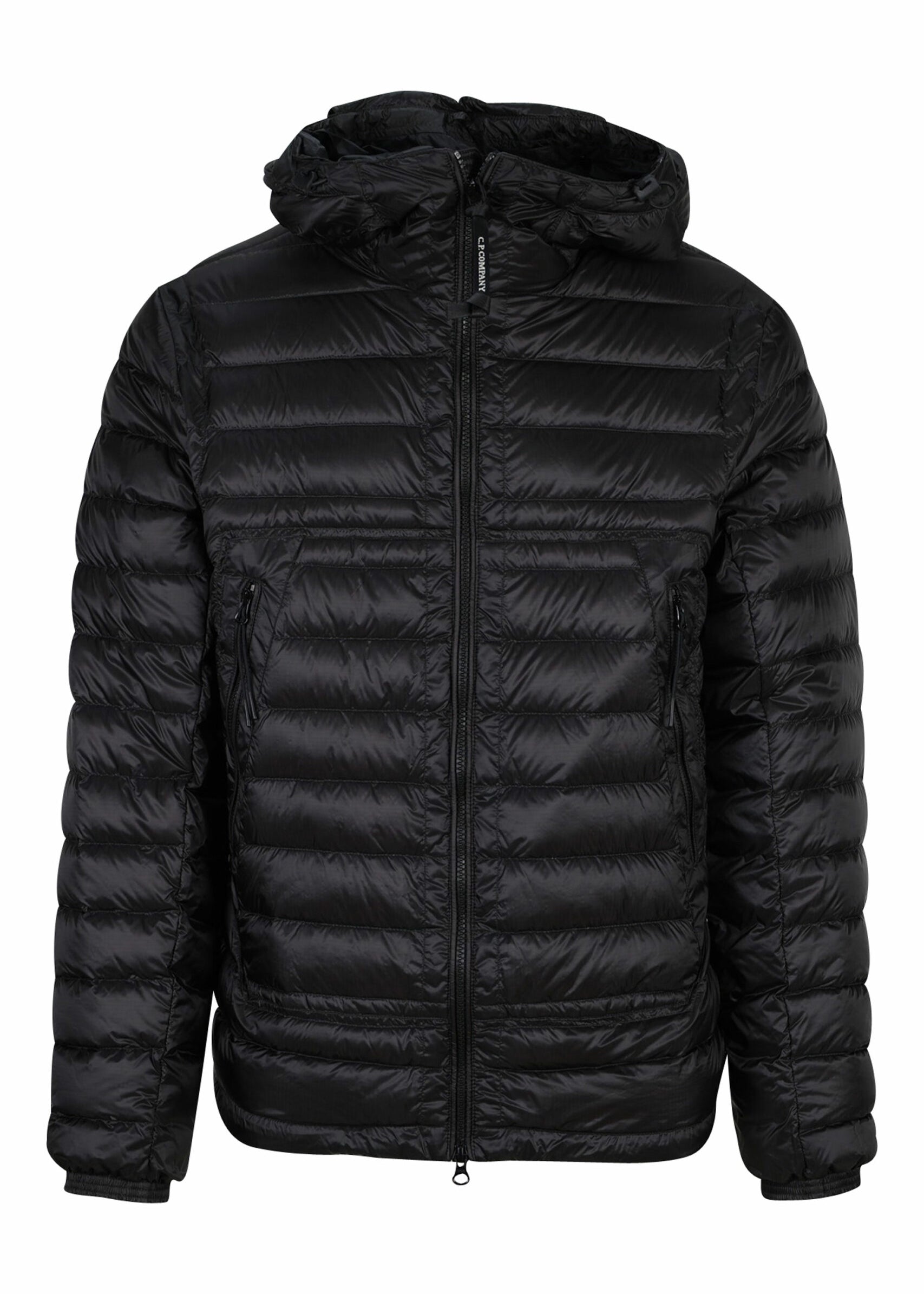 Plumífero negro con capucha y lineas onduladas con logo parche