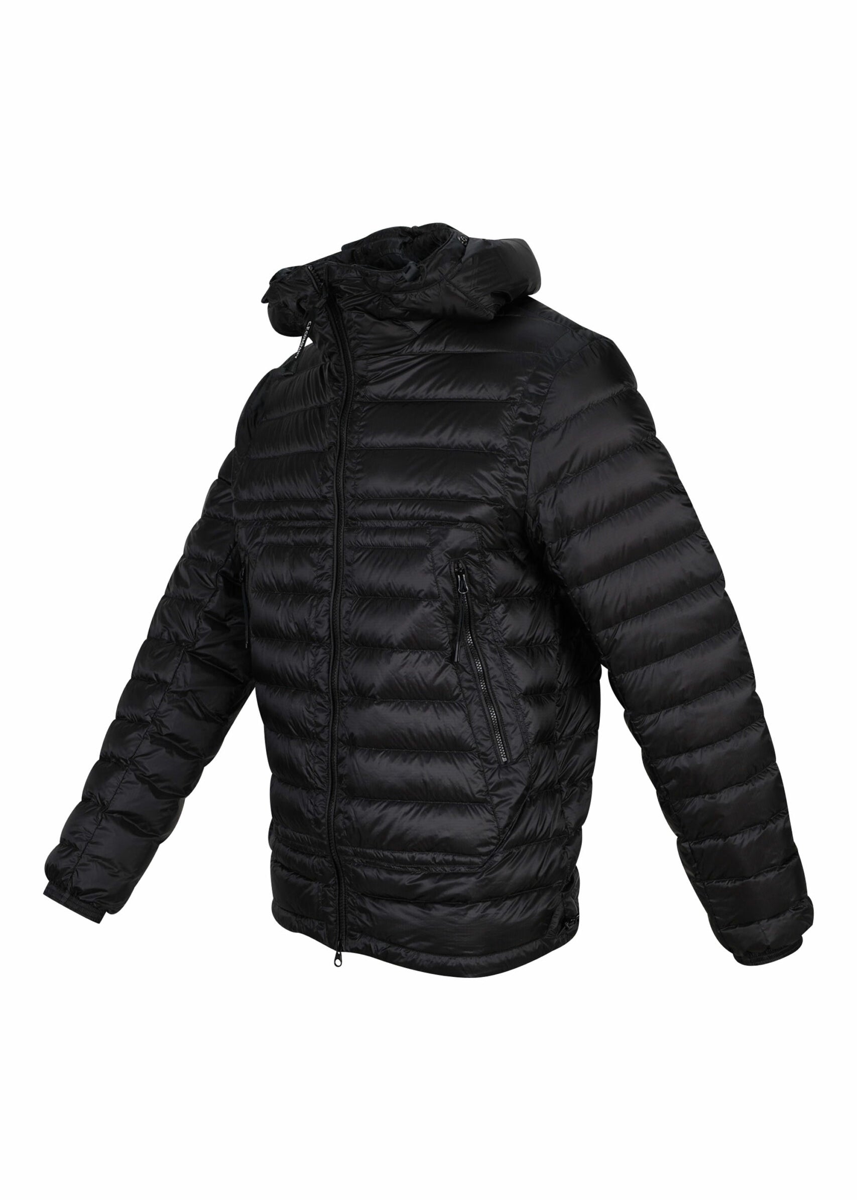 Plumífero negro con capucha y líneas diagonales con logo parche