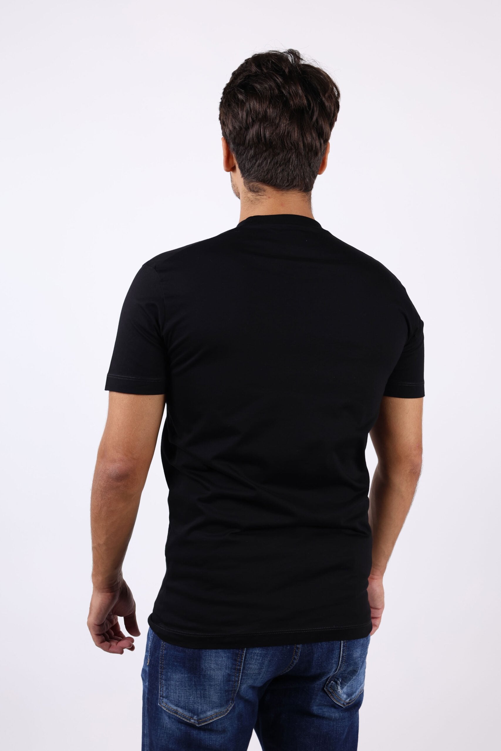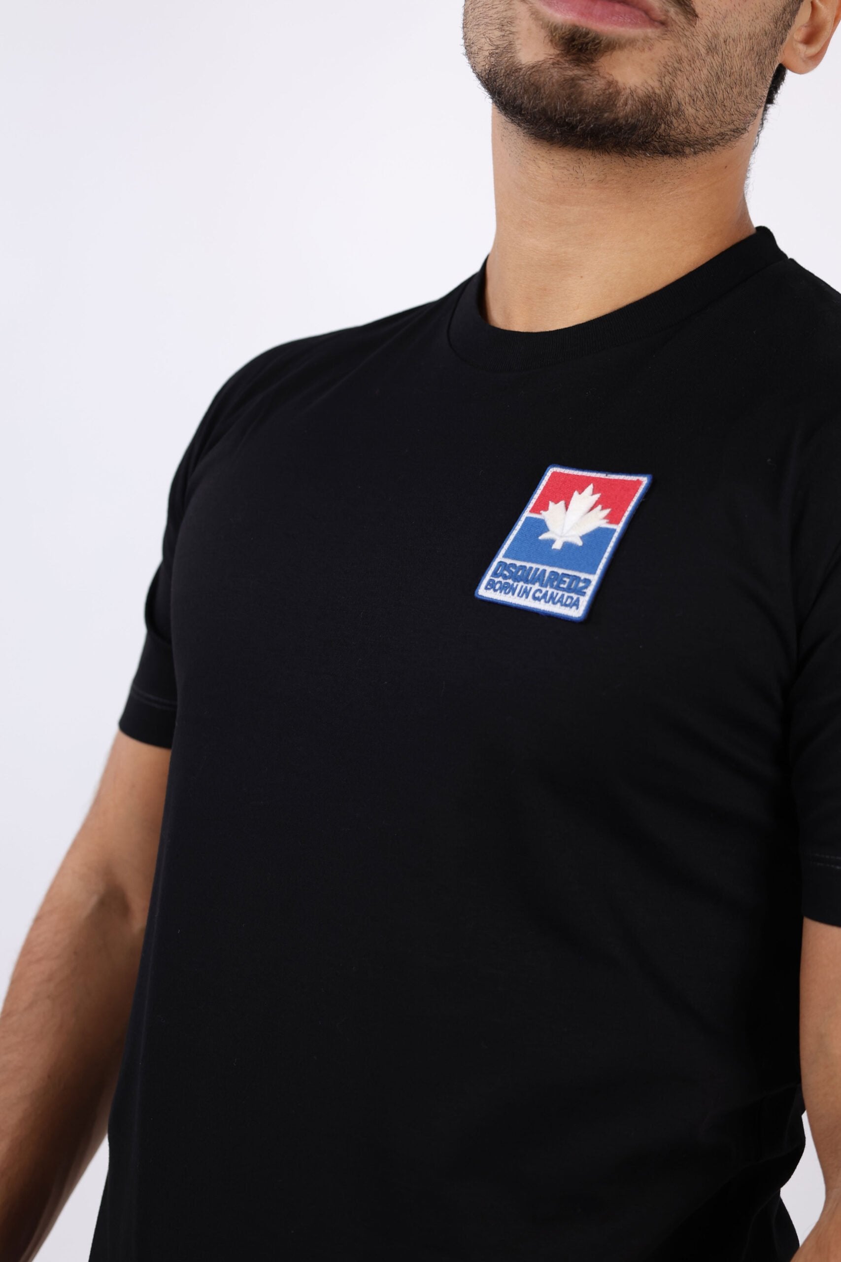 Camiseta negra con minilogo hoja en contraste azul y rojo - L