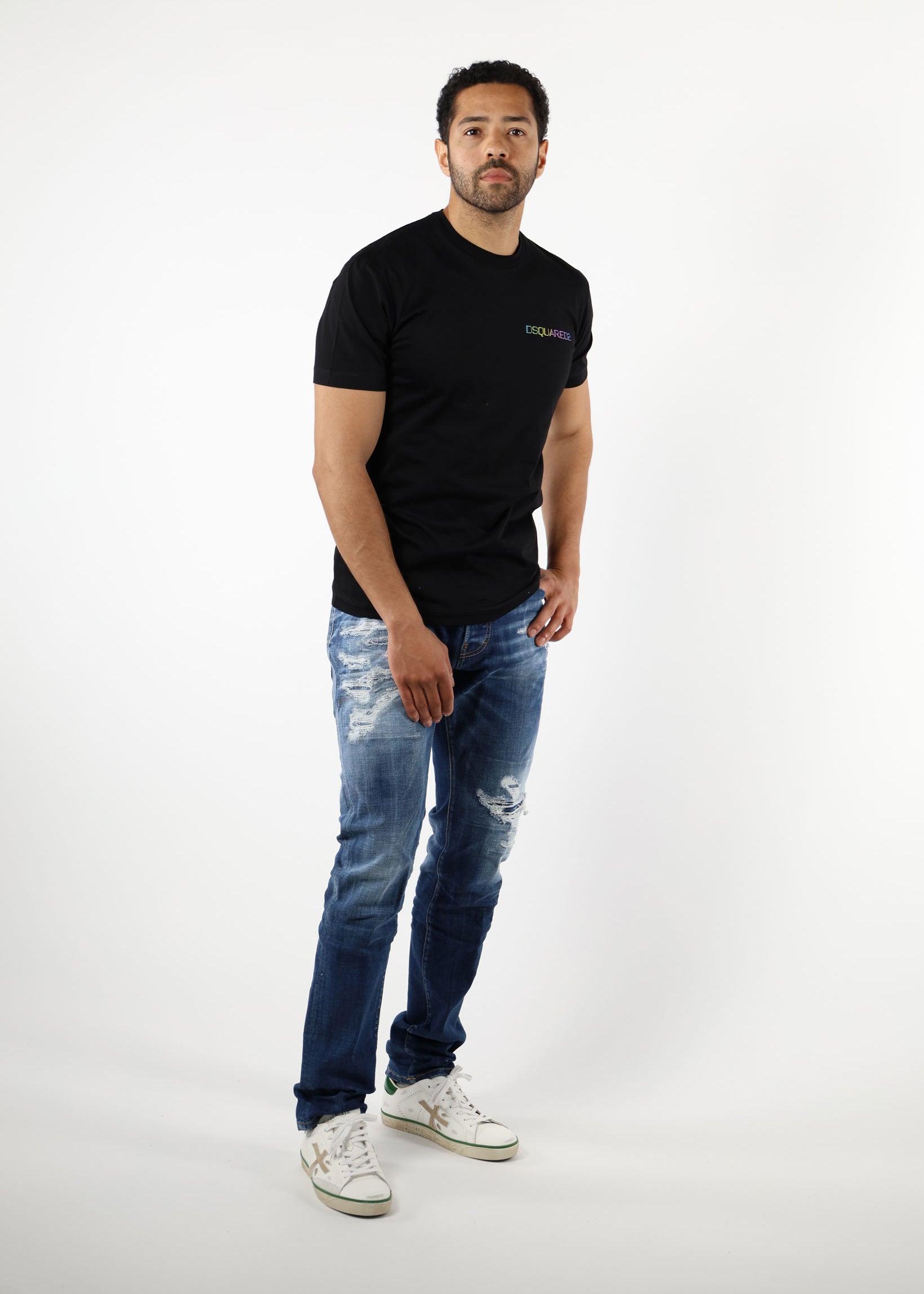 Camiseta negra con minilogo hoja en contraste azul y rojo - XL