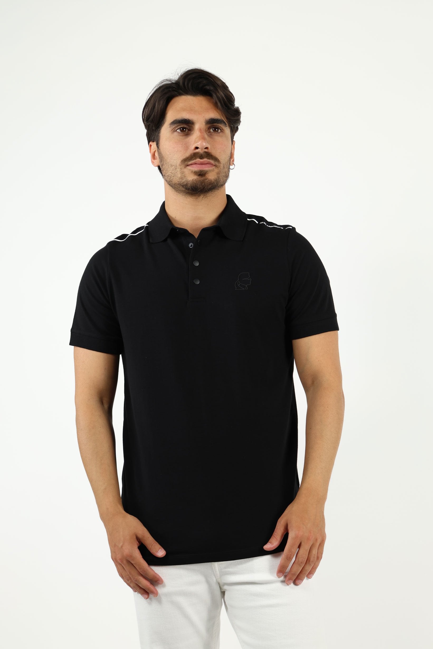 Polo negro con botones de presión y cinta blanca en hombros - M