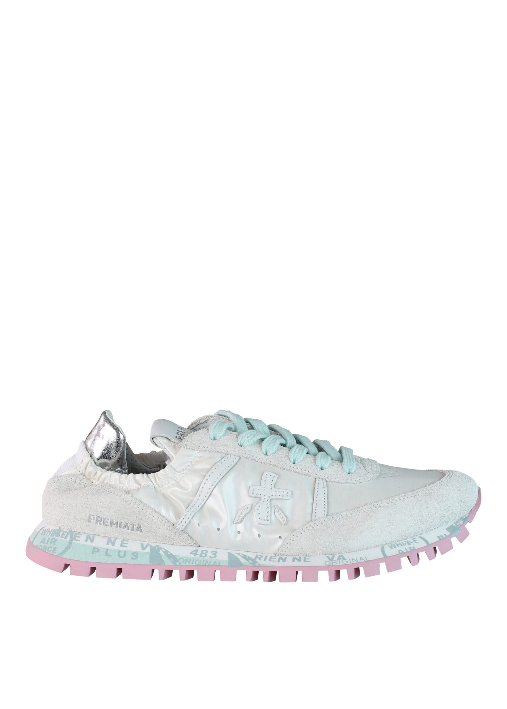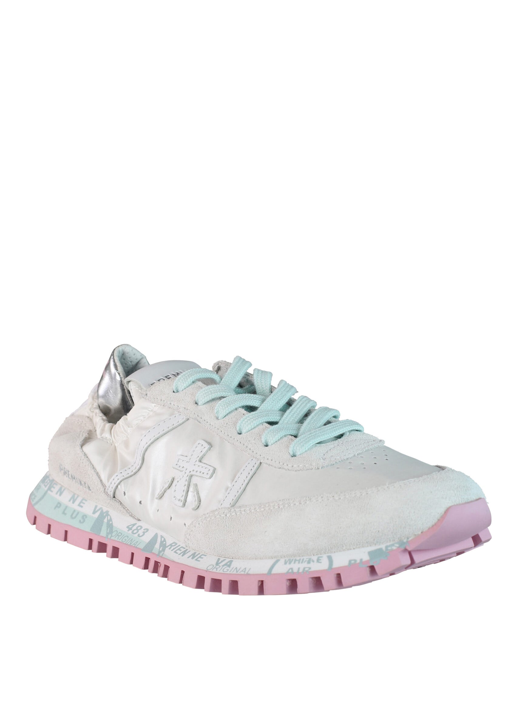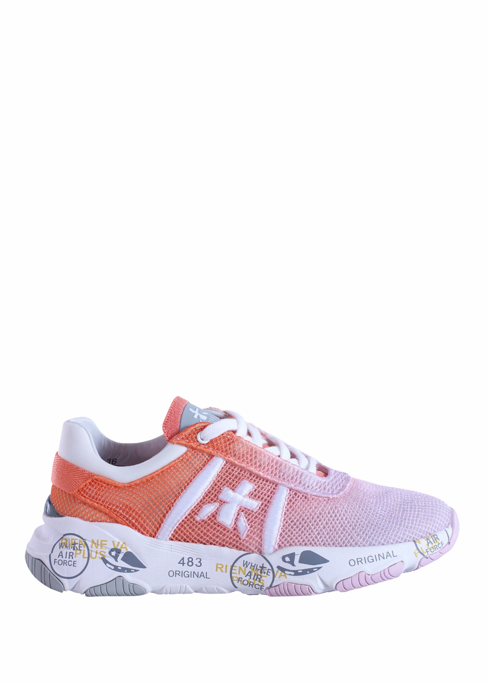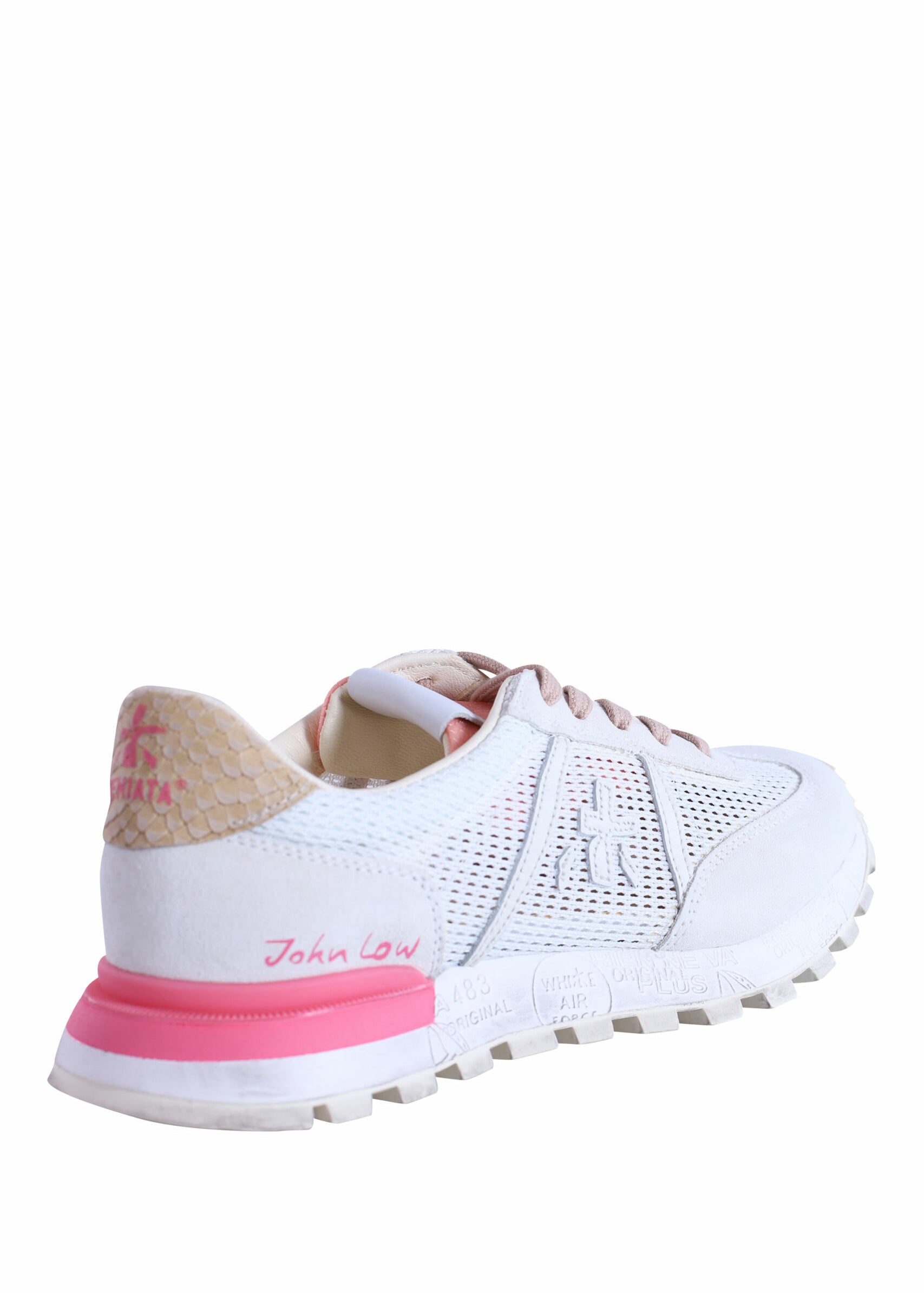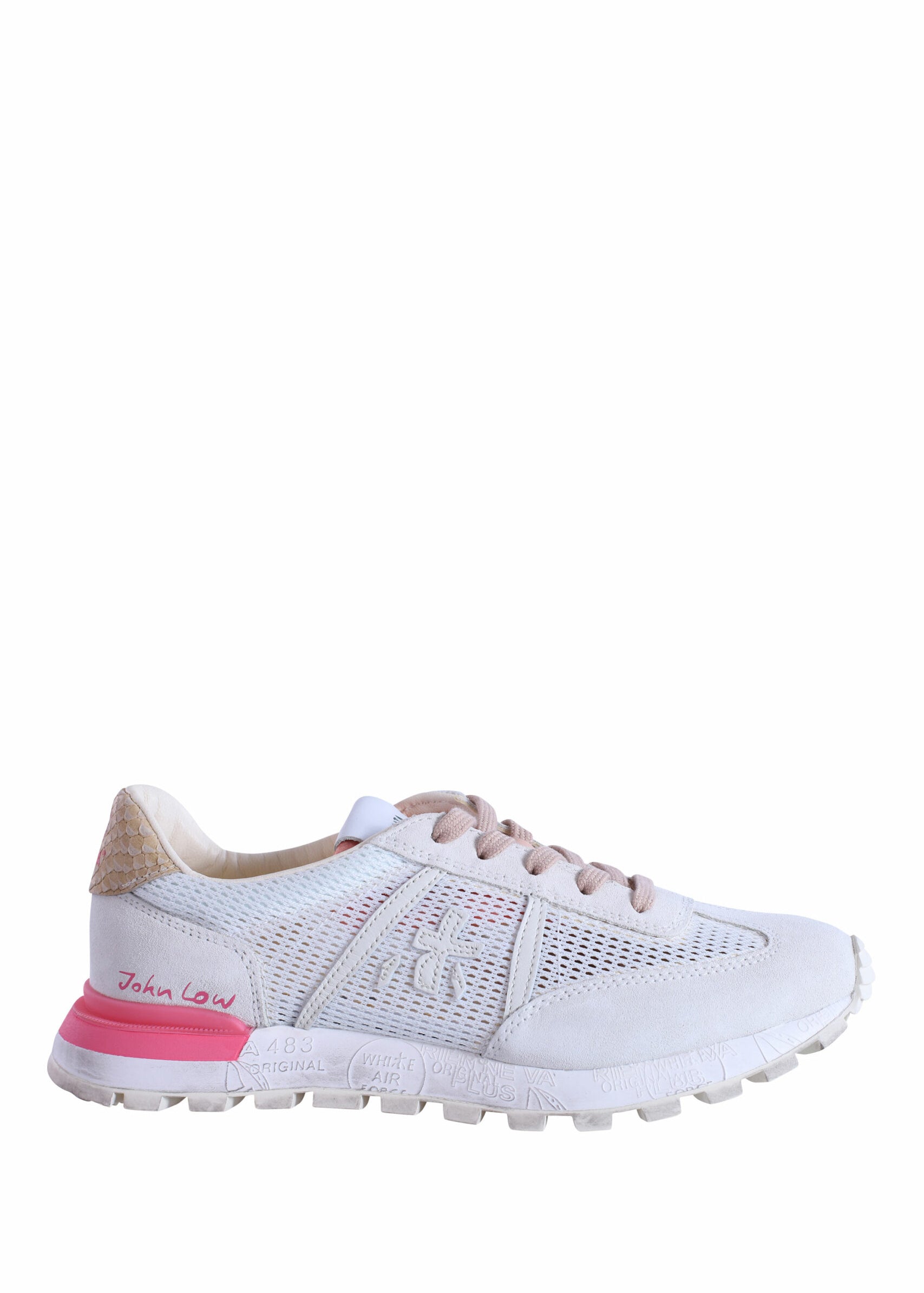 White sneakers with pink and gray "moe run-d 6338"