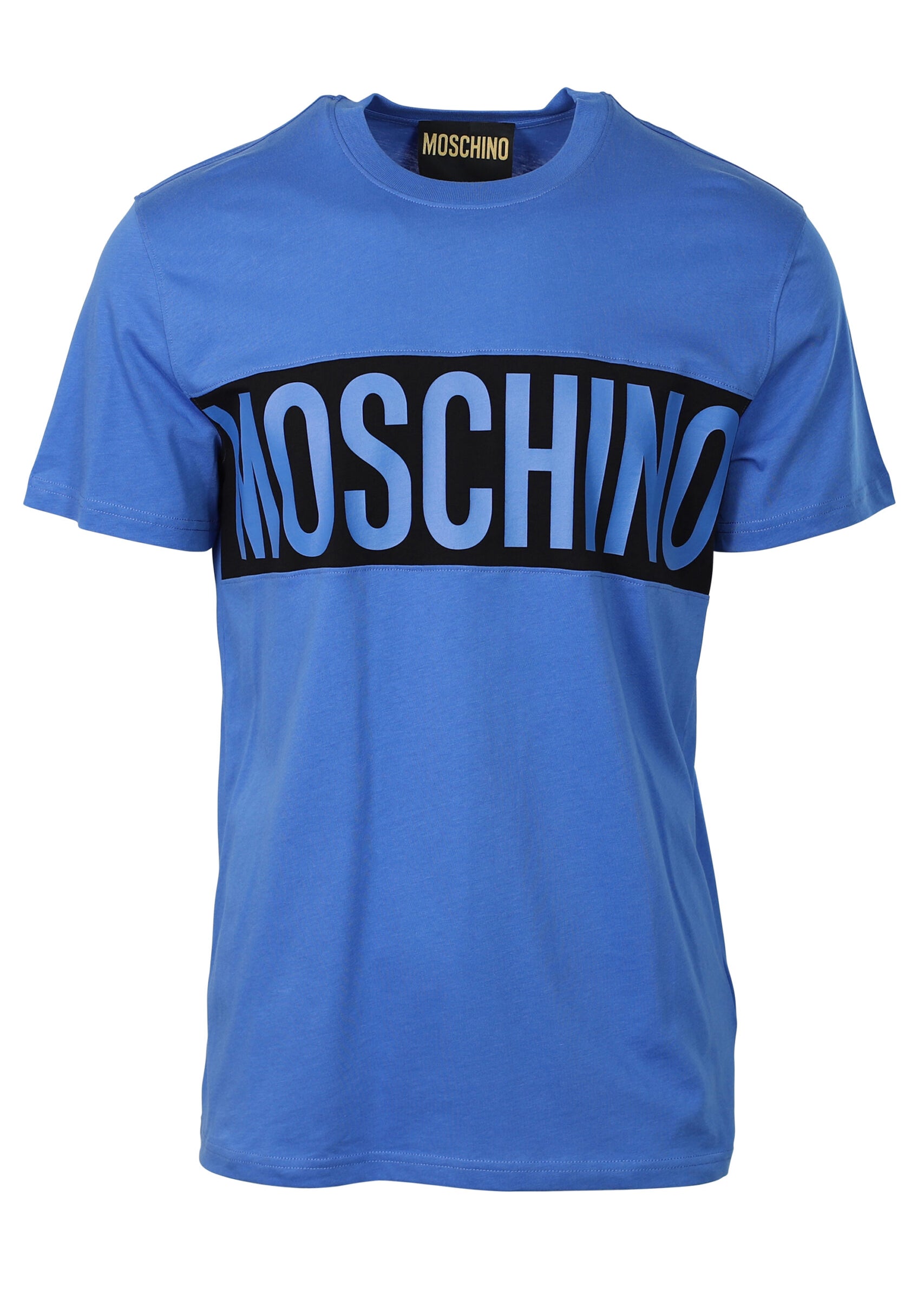 Blue t-shirt with black stripe logo