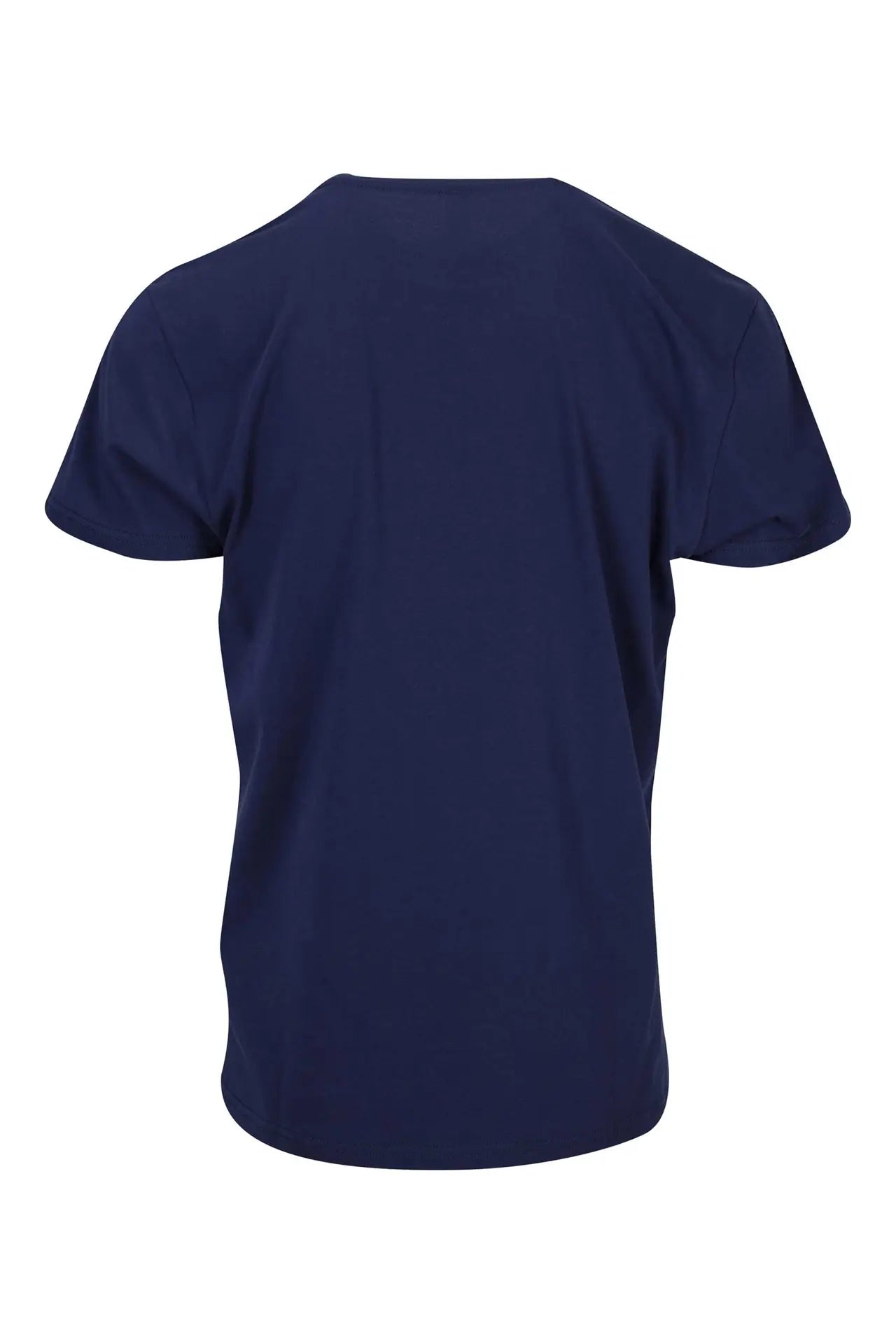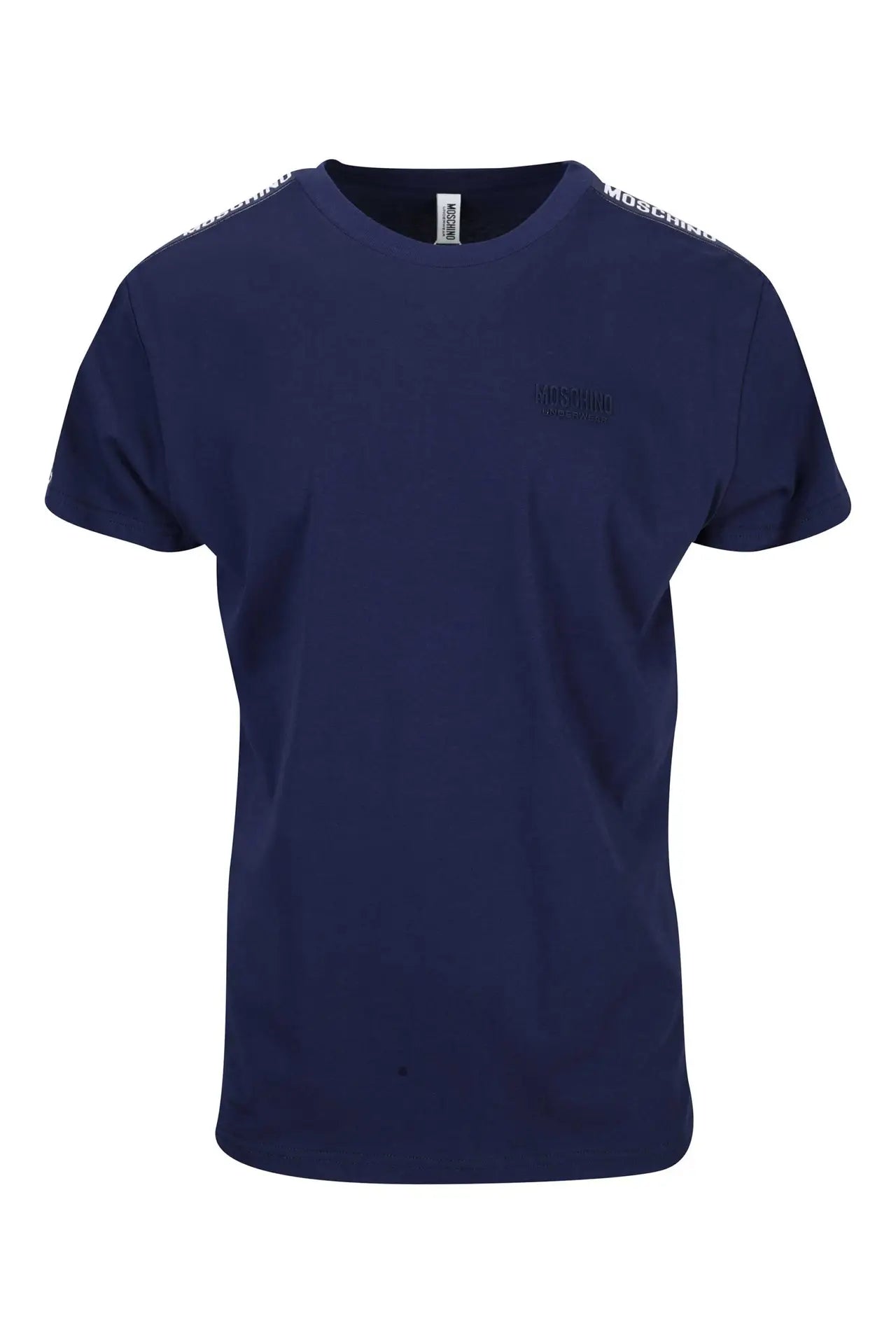Camiseta azul de algodón con logo en cinta en hombros y mini logo monocromático -