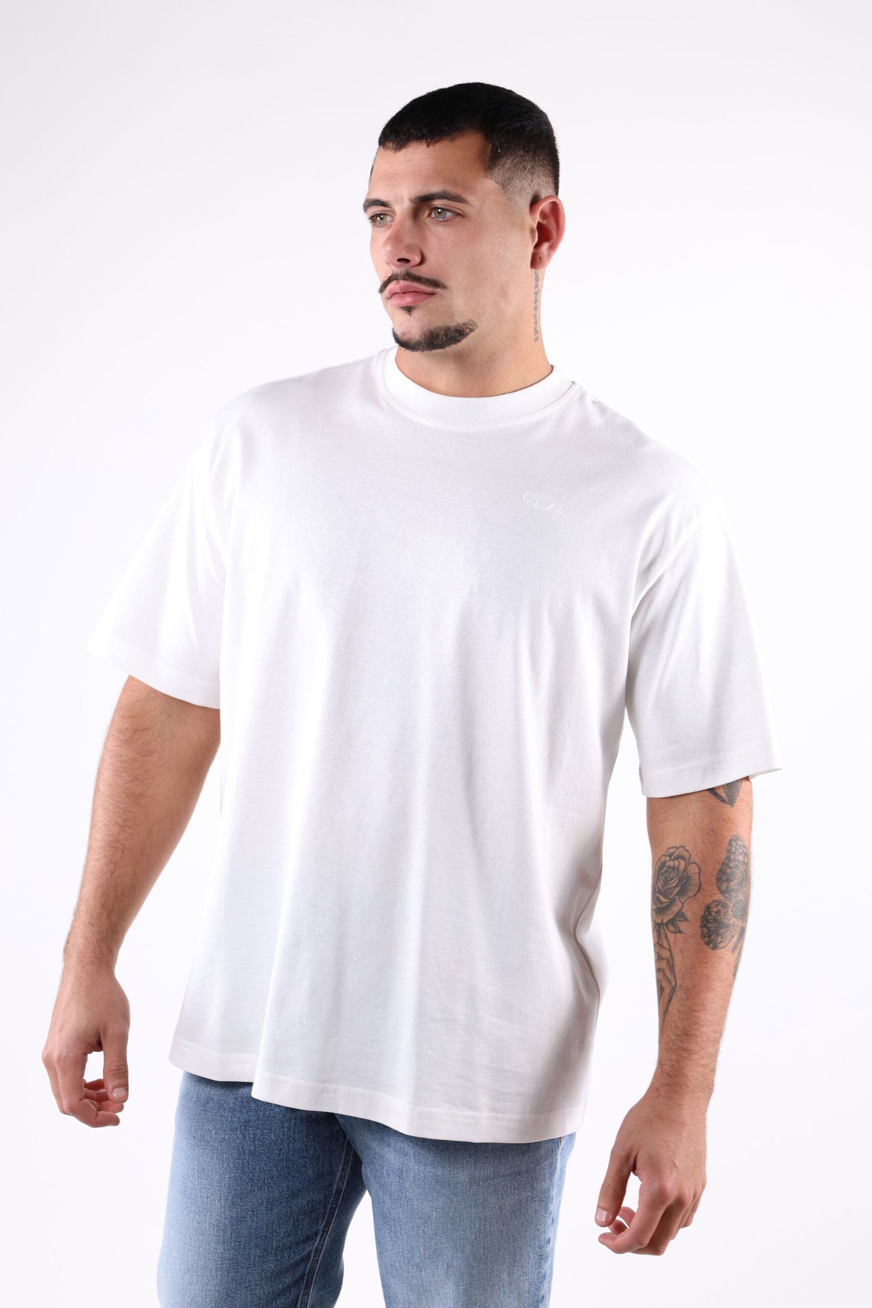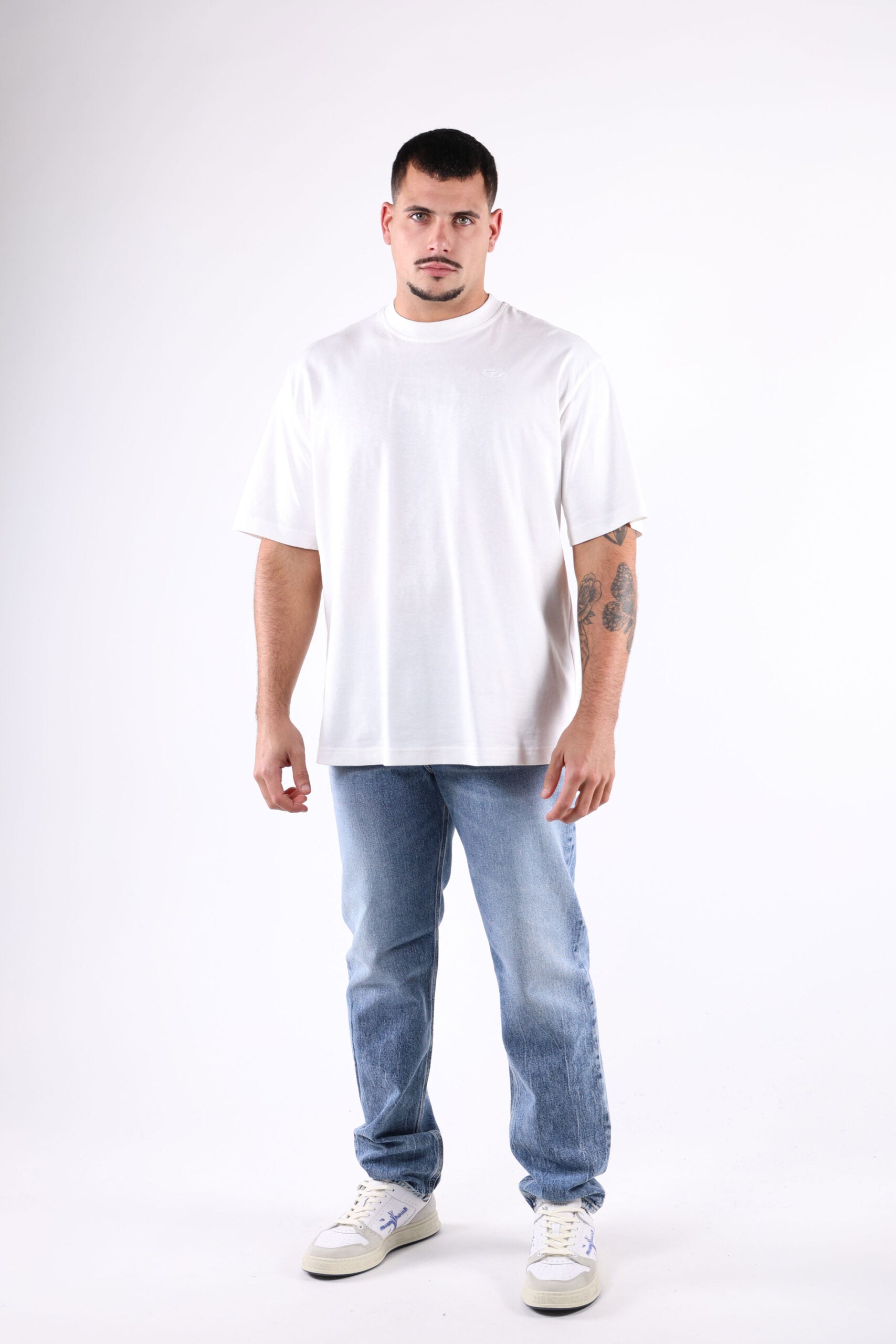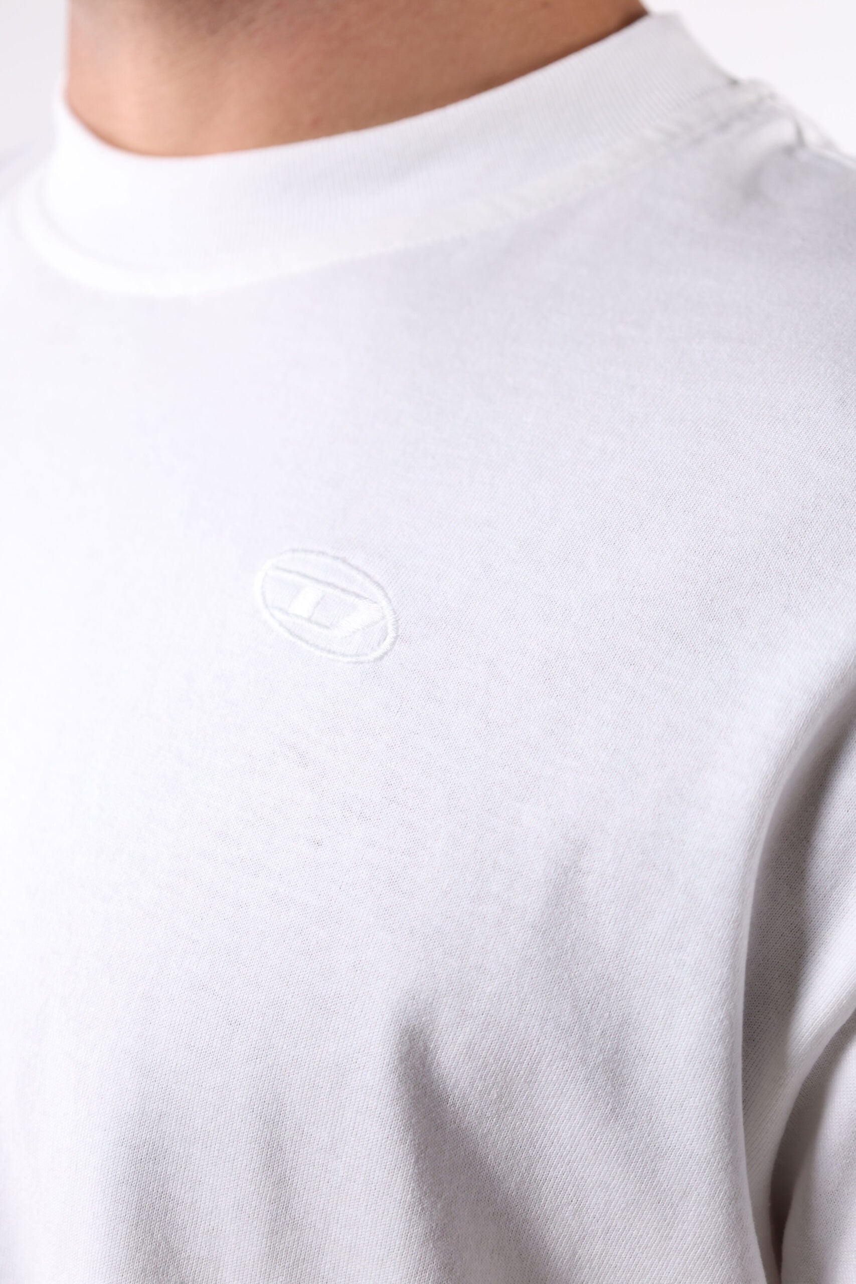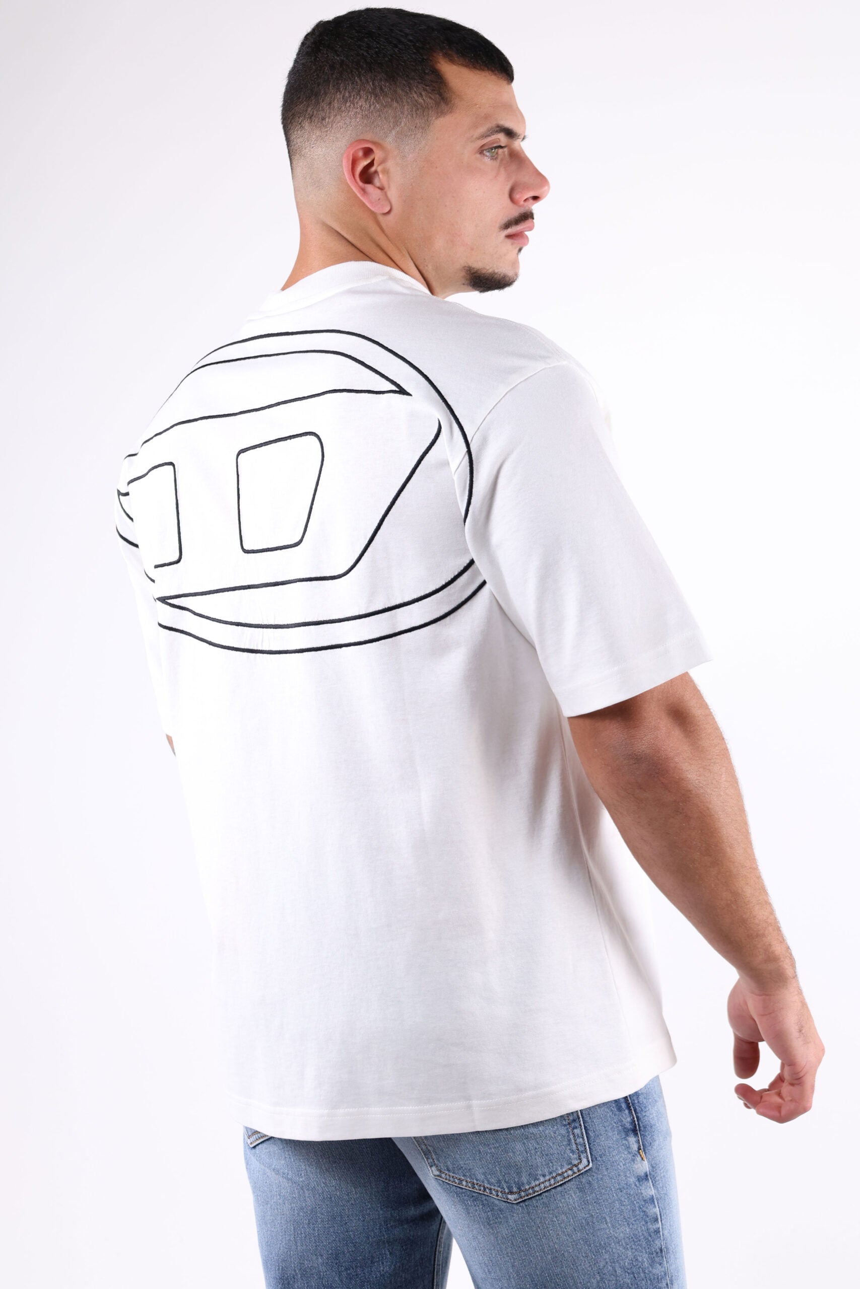 Camiseta blanca con maxilogo "megoval-D" detrás - L