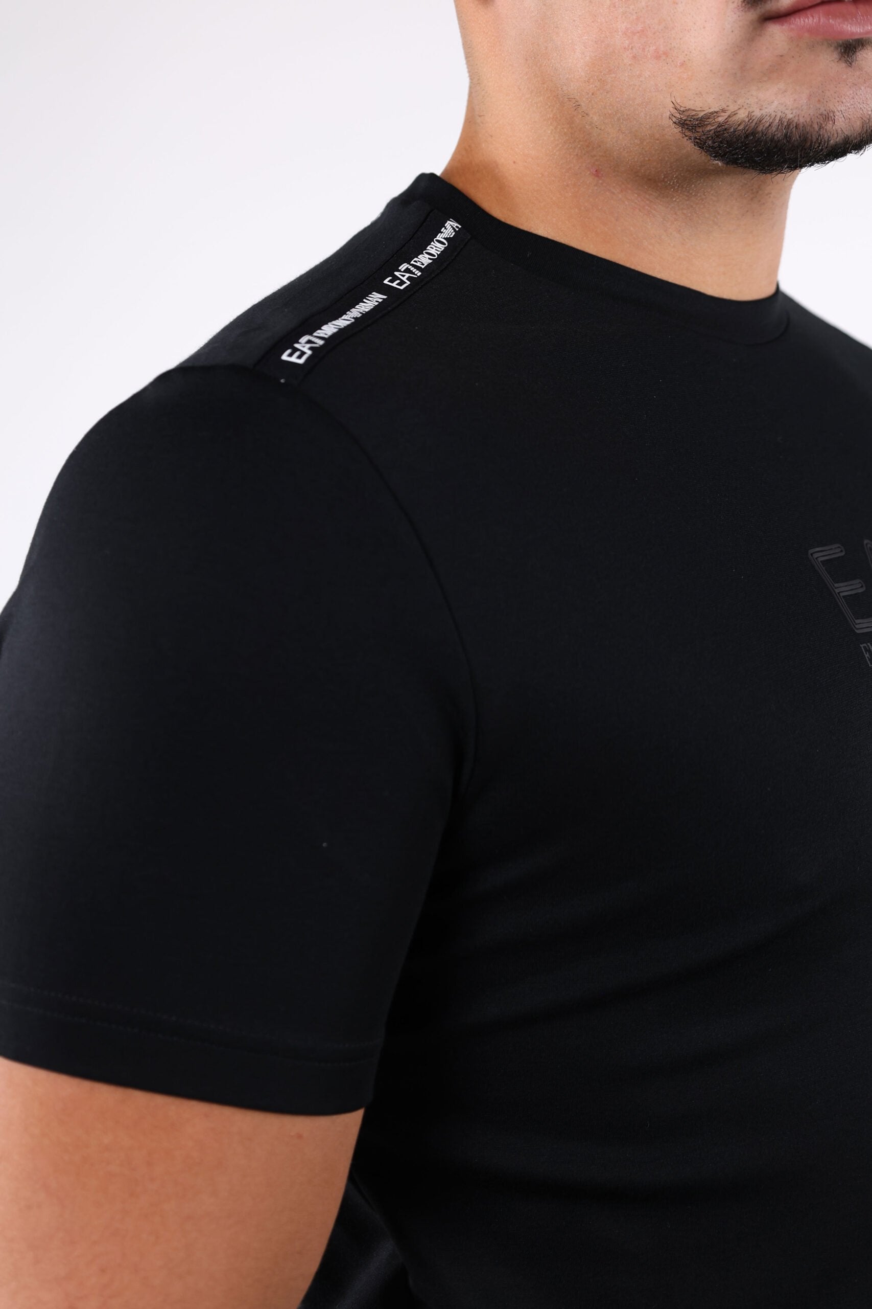 Camiseta negra con minilogo monocromático y cinta en hombros - S