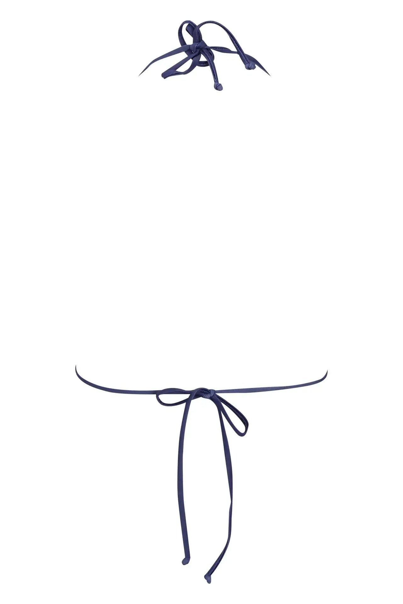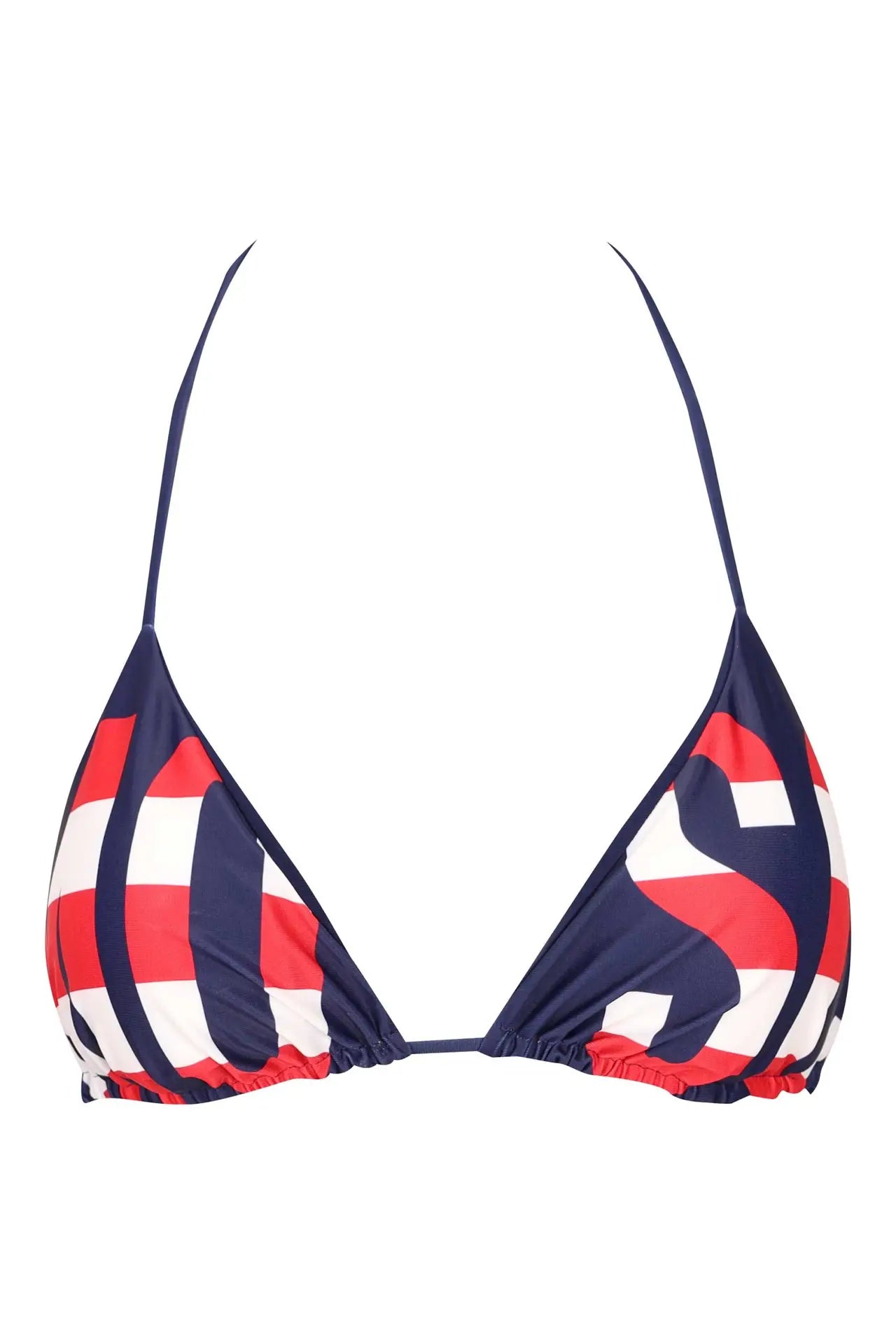 Top de bikini azul con lazos y maxi logo "Moschino" en franjas rojo y blanco
